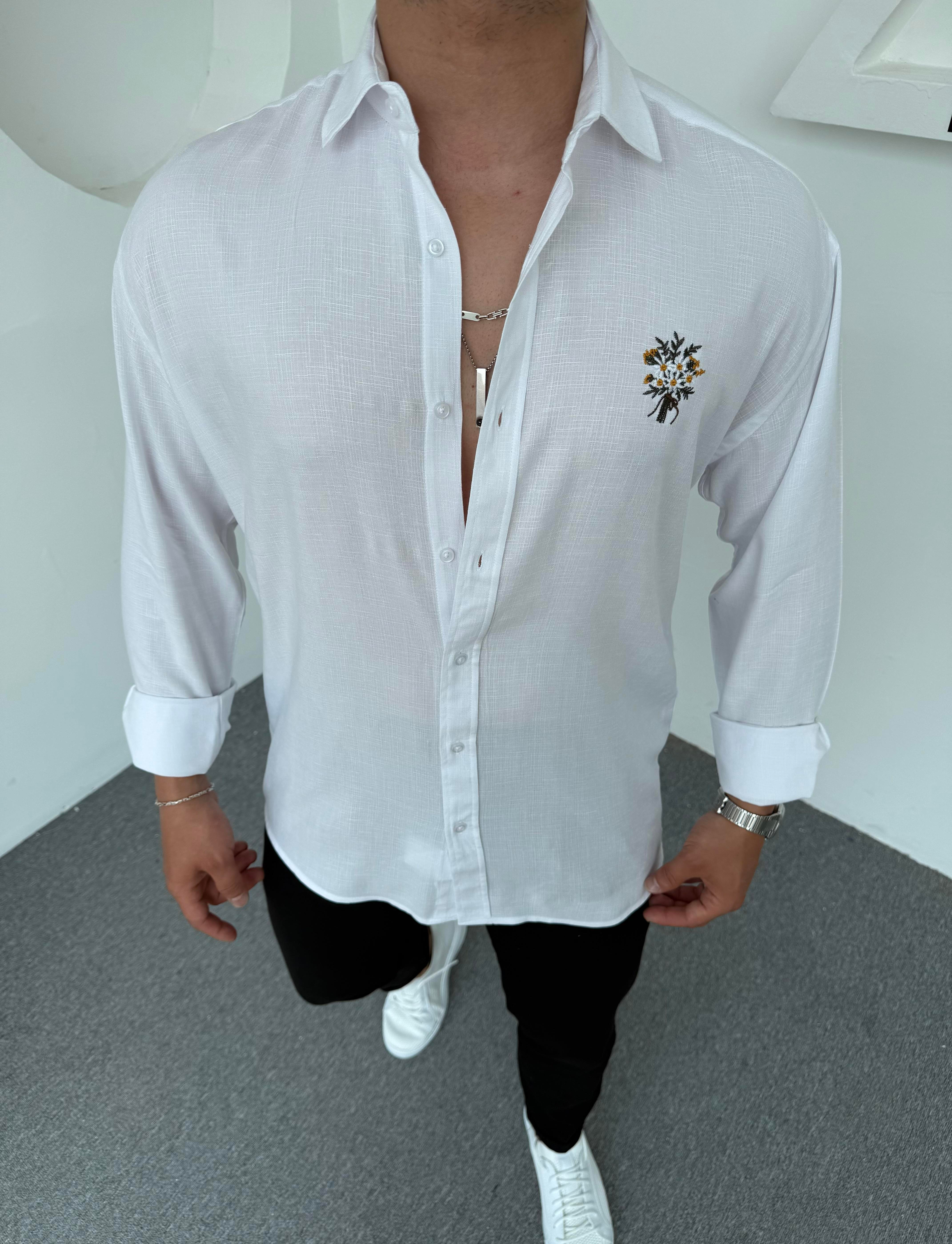 Buket Nakışlı Pamuk Keten Gömlek Beyaz