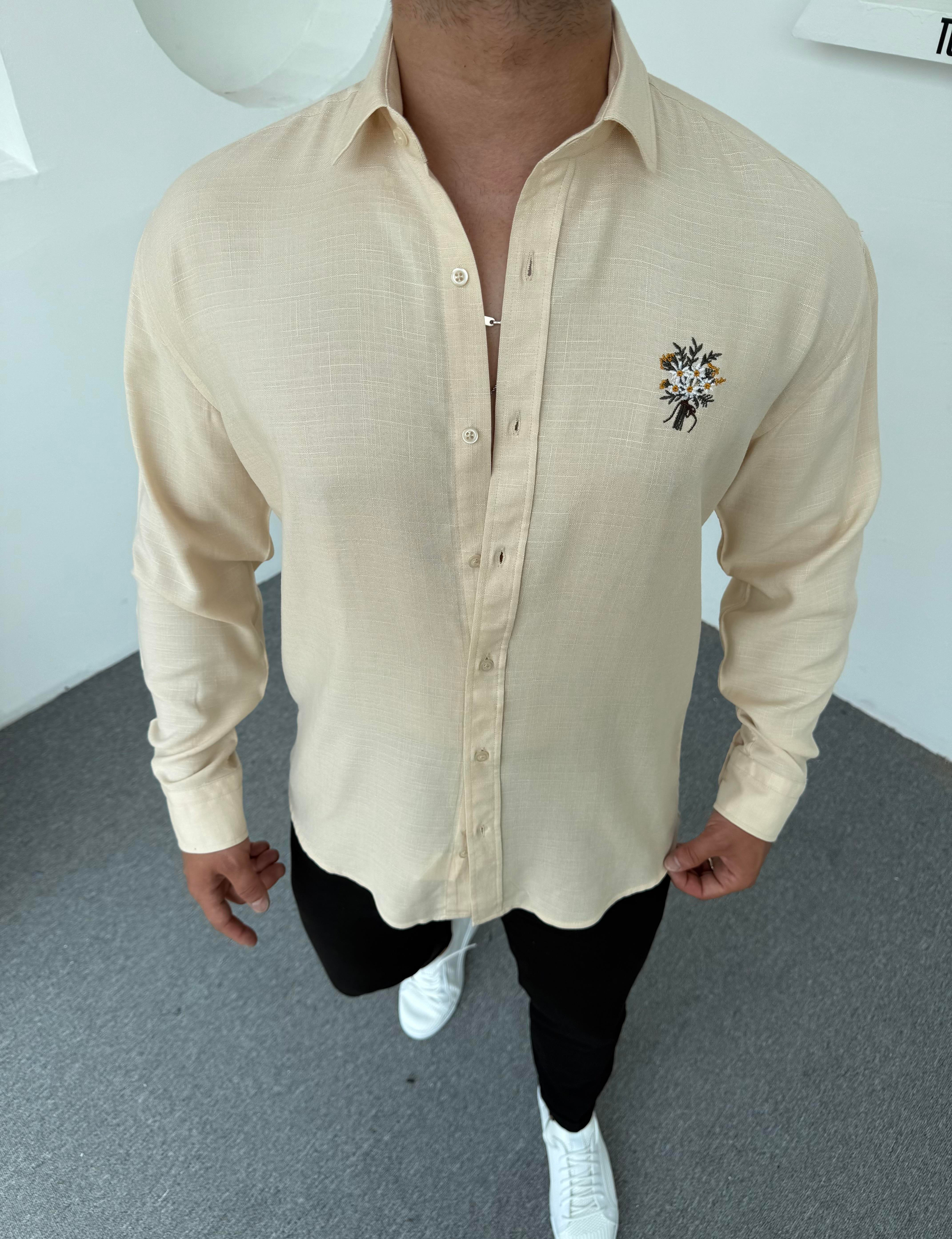 Buket Nakışlı Pamuk Keten Gömlek Krem