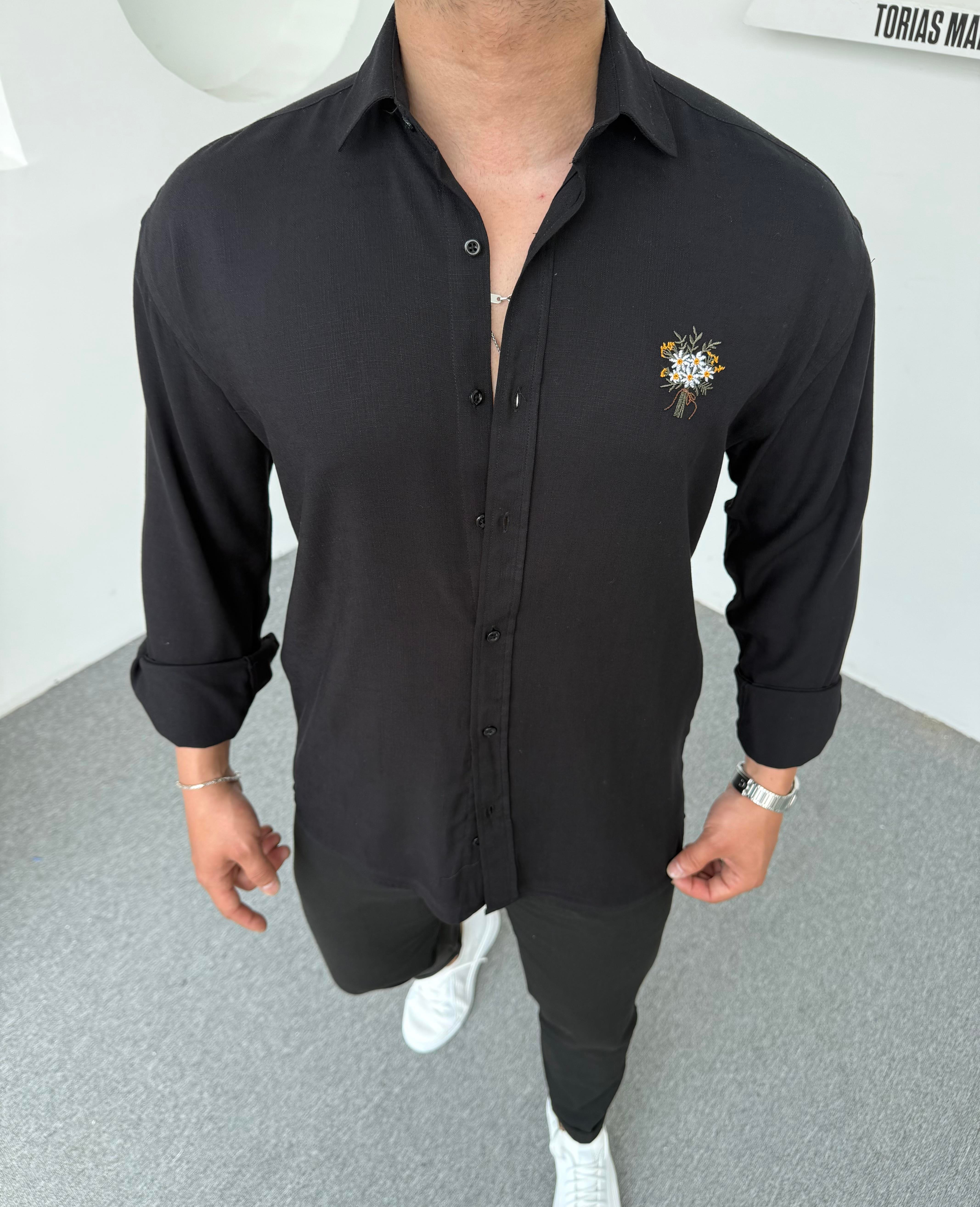 Buket Nakışlı Pamuk Keten Gömlek Siyah