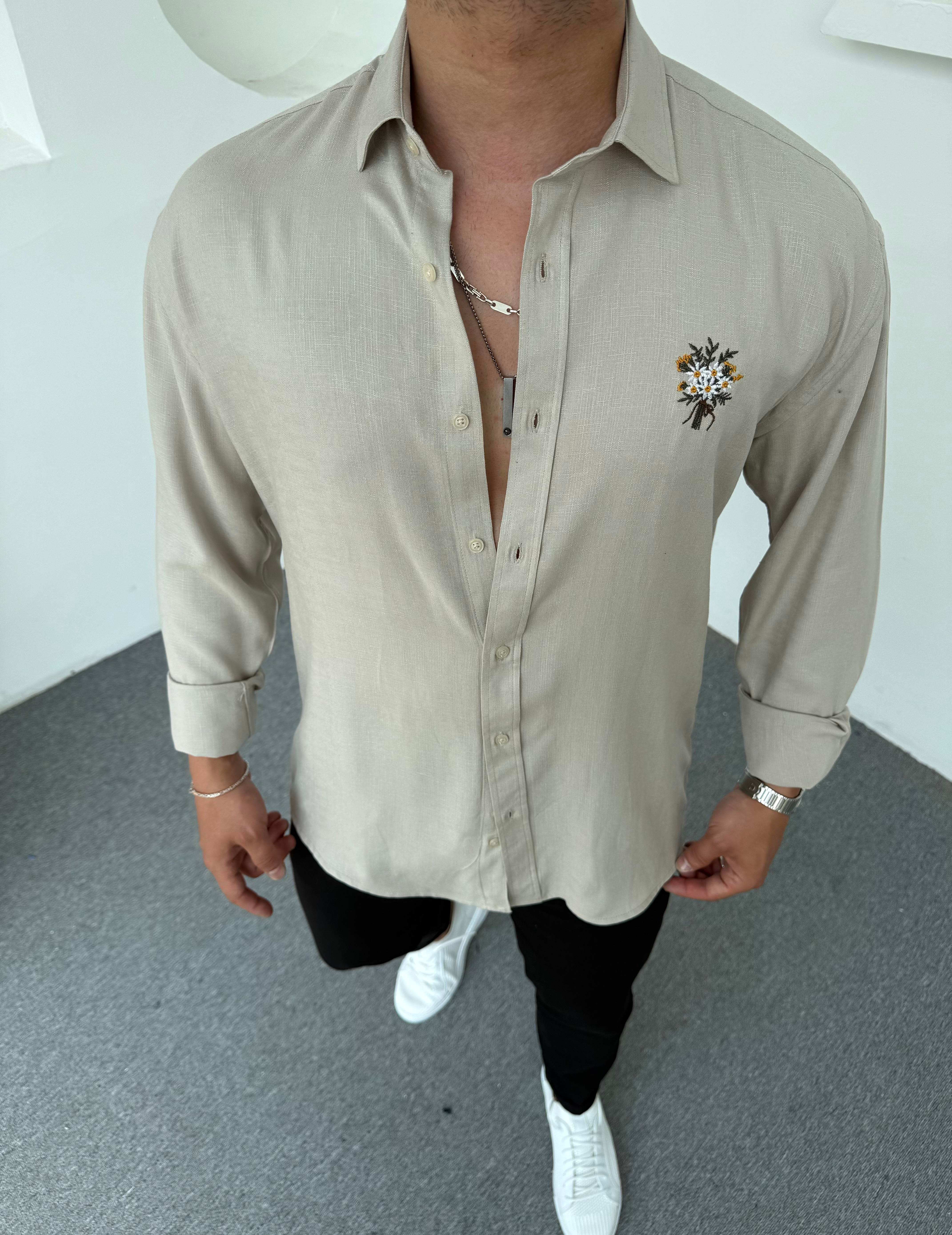 Buket Nakışlı Pamuk Keten Gömlek Taş Gri