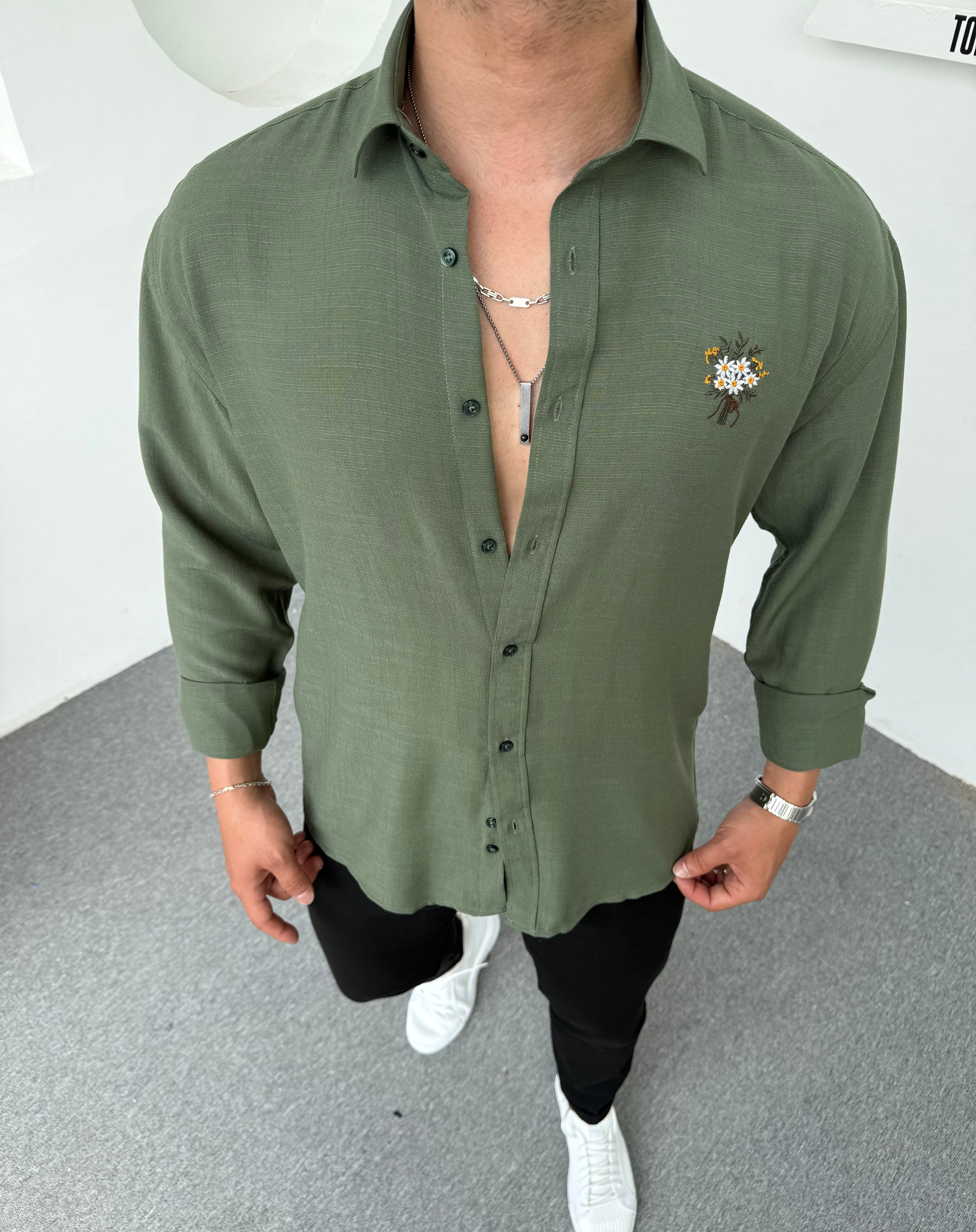 Buket Nakışlı Pamuk Keten Gömlek Yeşil