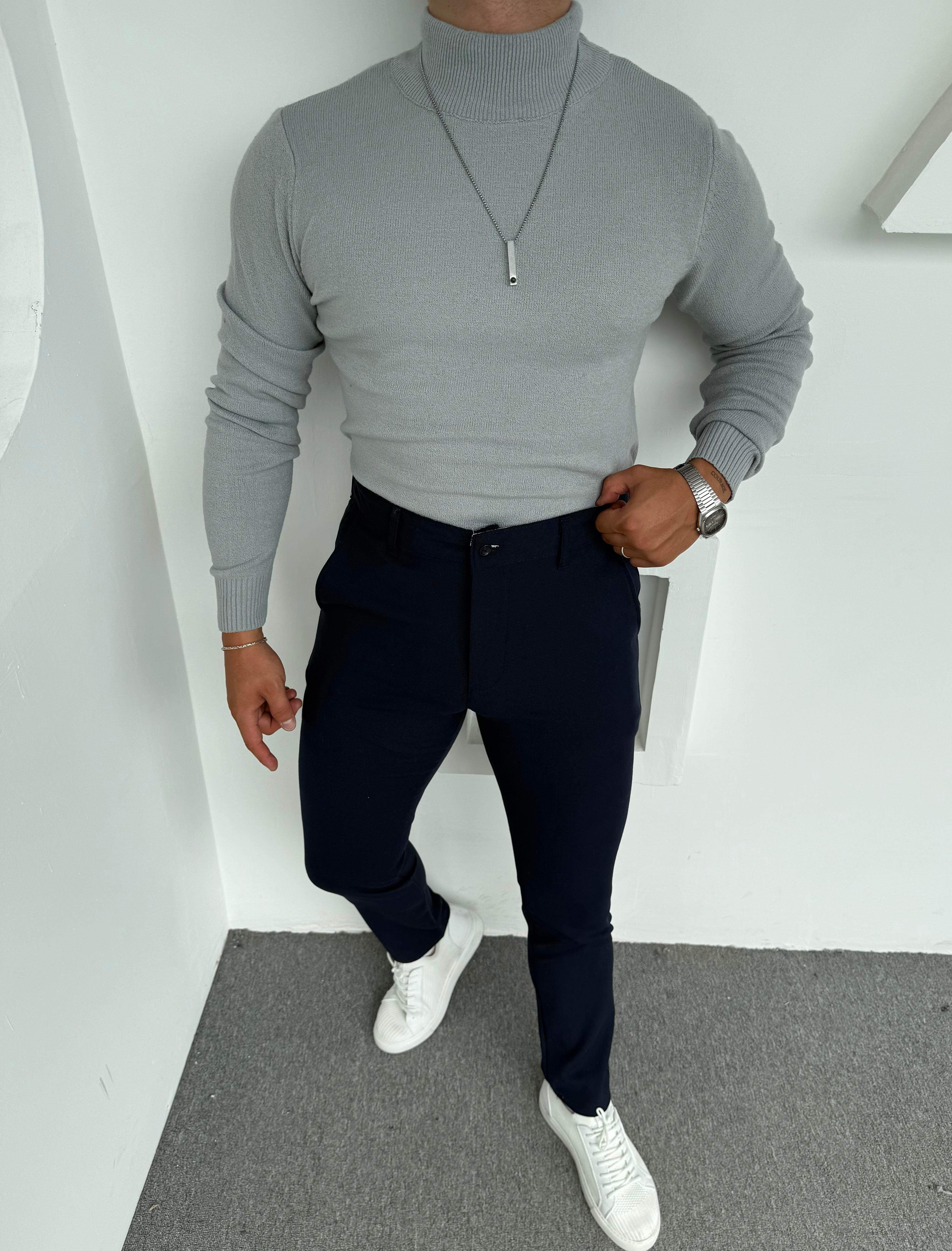 C2 seviye kombini 1 Basic balıkçı yaka triko sweatshirt gri Slimfit klasik kumaş pantolon lacivert
