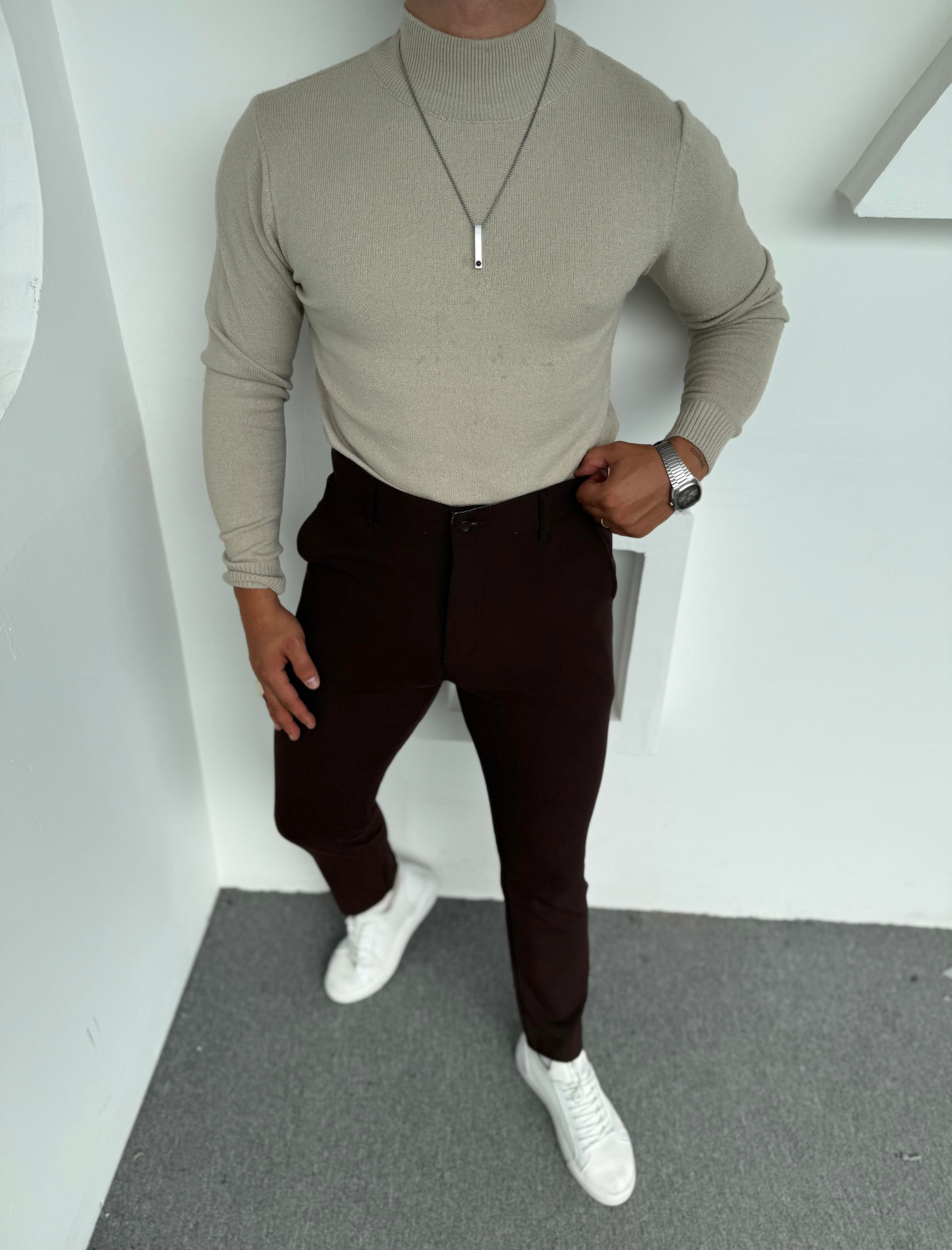 Basic balıkçı yaka triko sweatshirt krem Slimfit klasik kumaş pantolon acı kahve