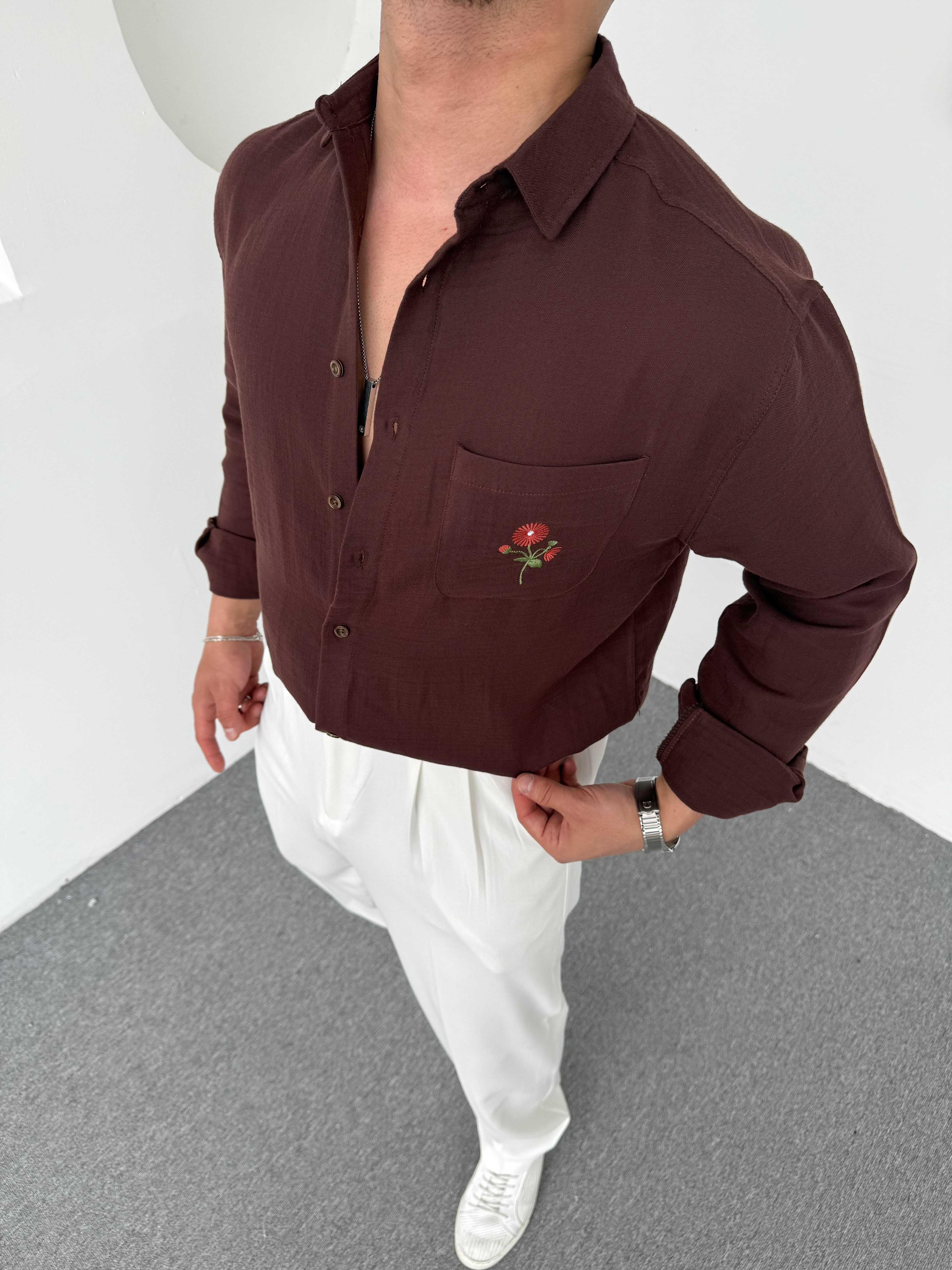 Çiçek Nakışlı Keten Gömlek Kahve