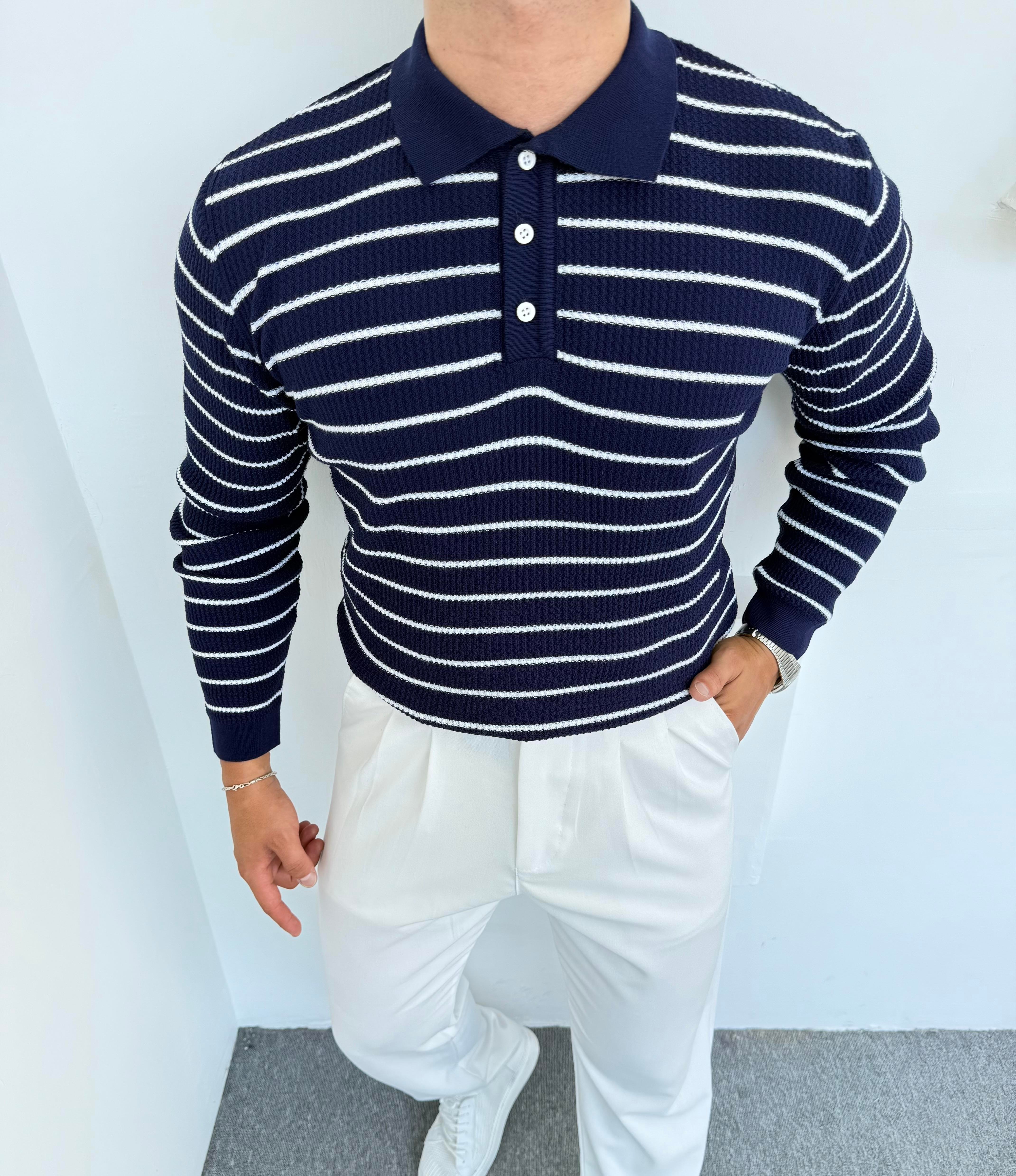 ÇİZGİLİ DÜĞMELİ TRİKO POLO YAKA SWEATSHİRT LACİVERT