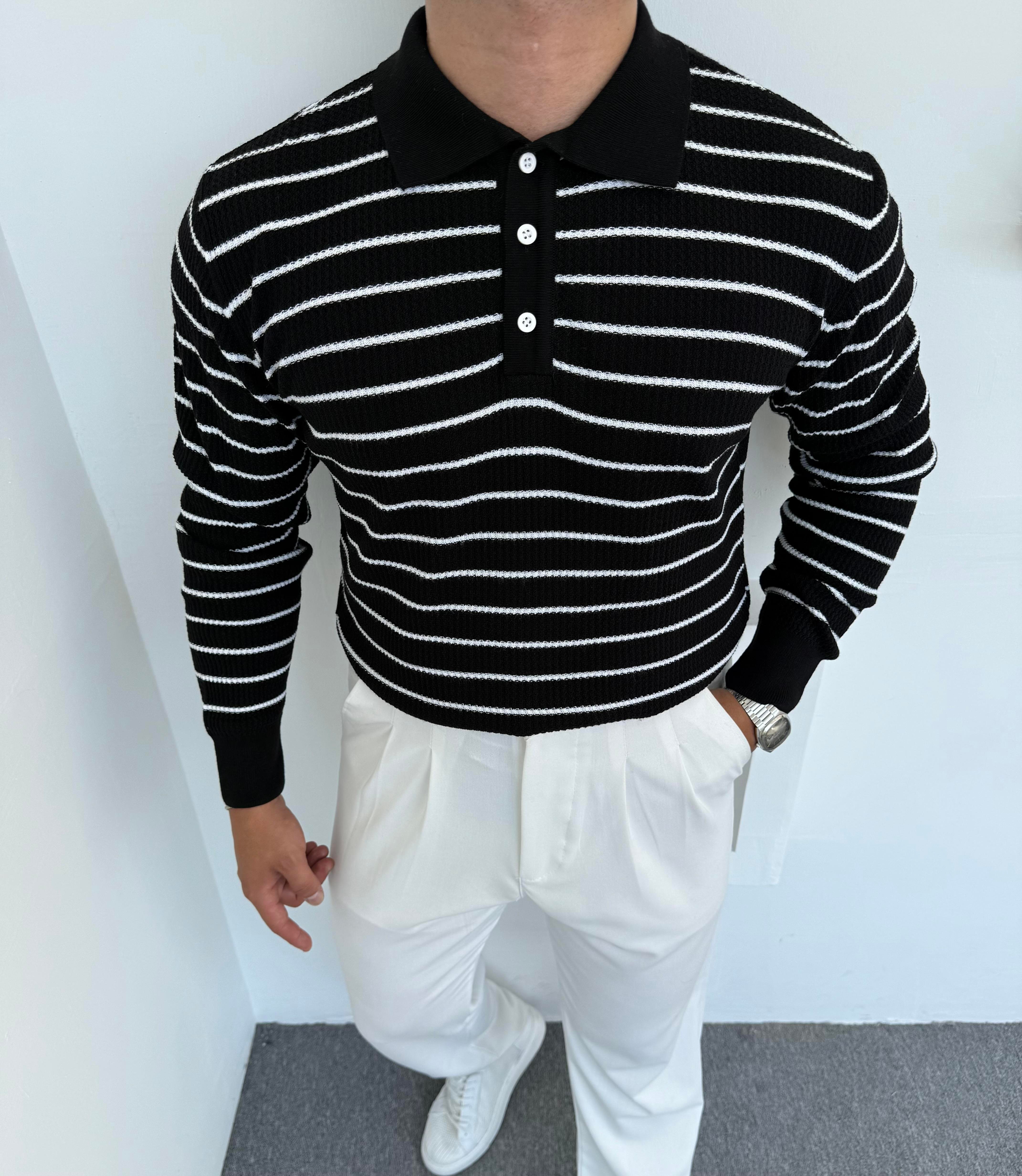 ÇİZGİLİ DÜĞMELİ TRİKO POLO YAKA SWEATSHİRT SİYAH