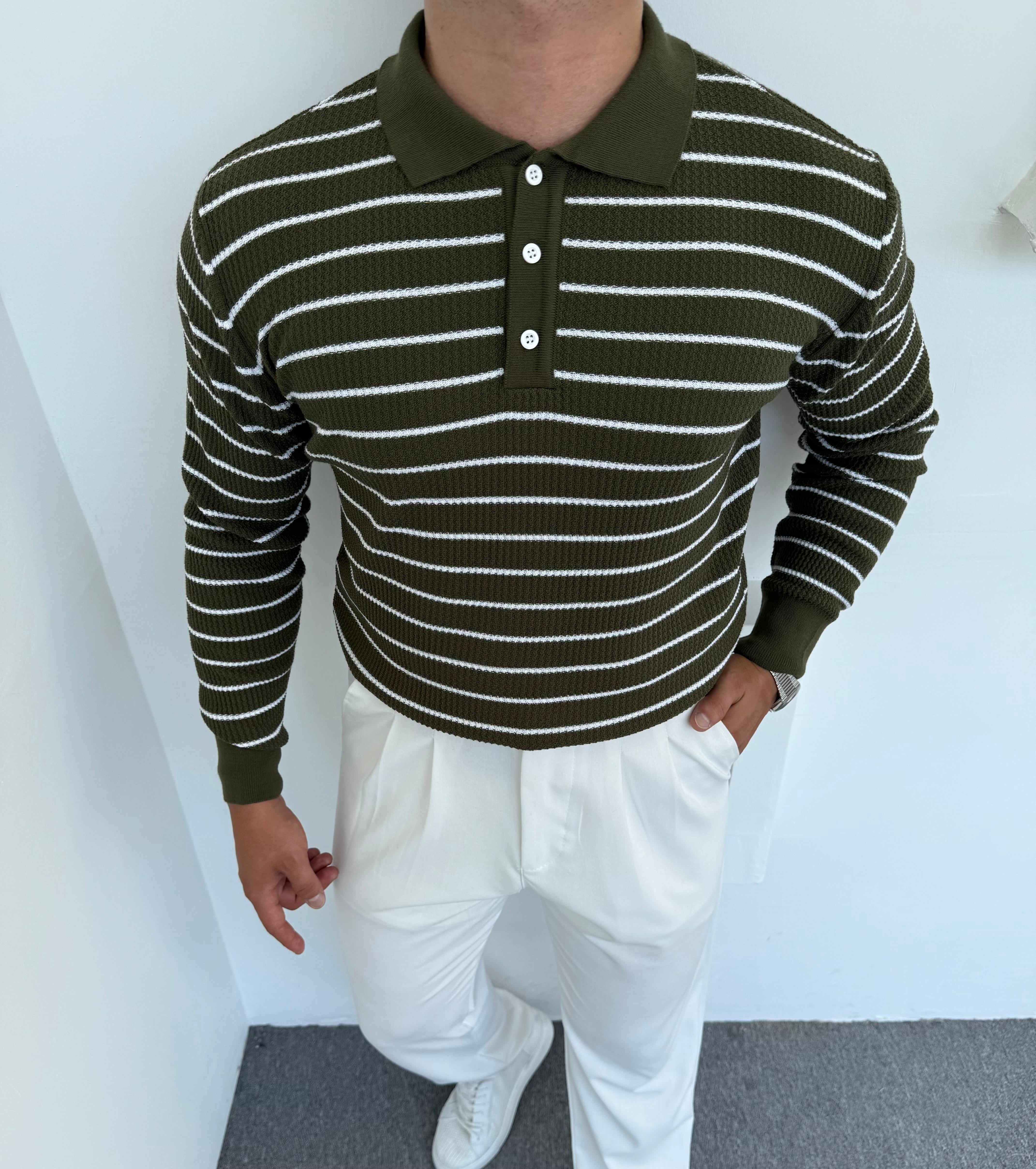 ÇİZGİLİ DÜĞMELİ TRİKO POLO YAKA SWEATSHİRT YEŞİL