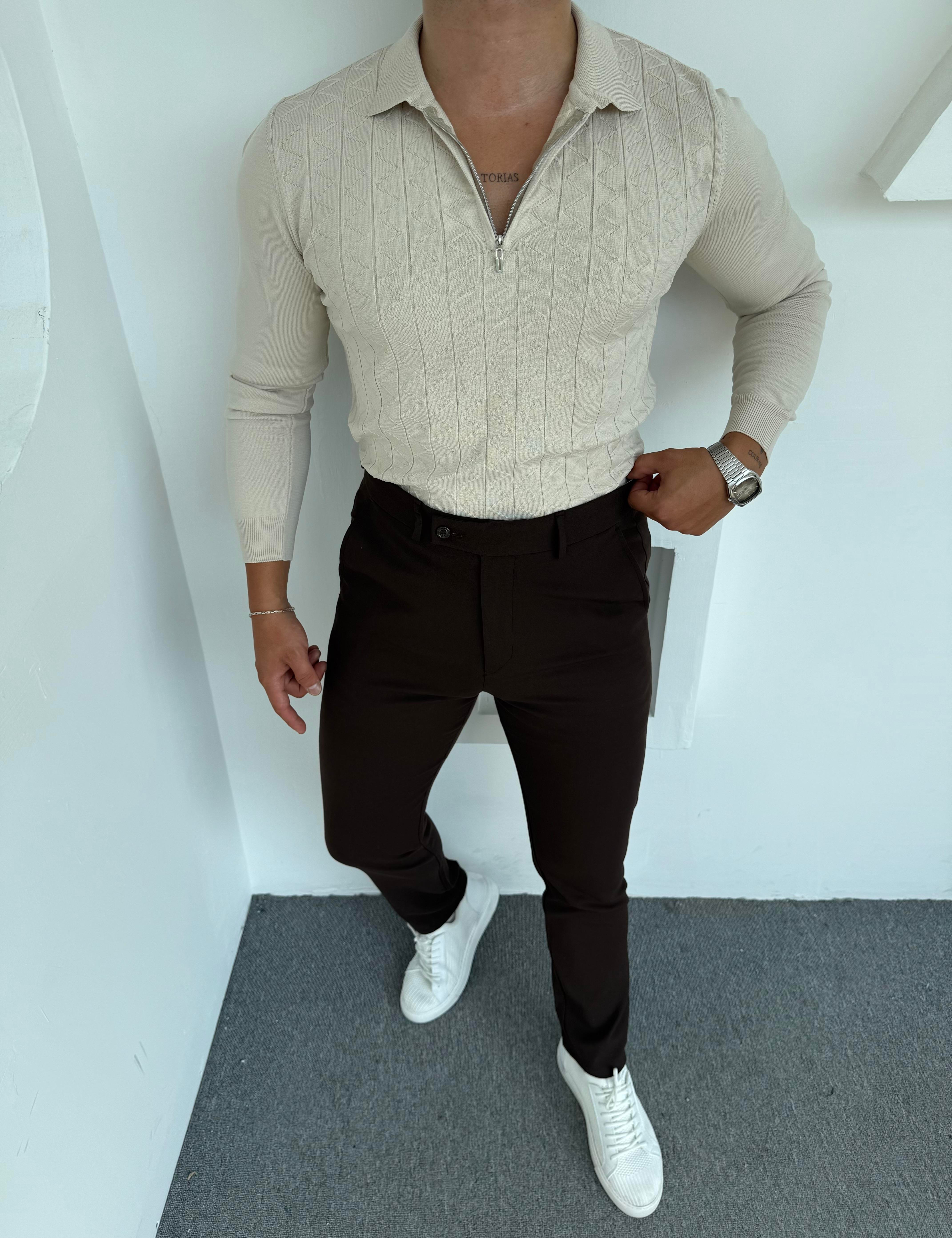 Siyah Polo Yaka Tişört , Krem Dil Detay Pantolon