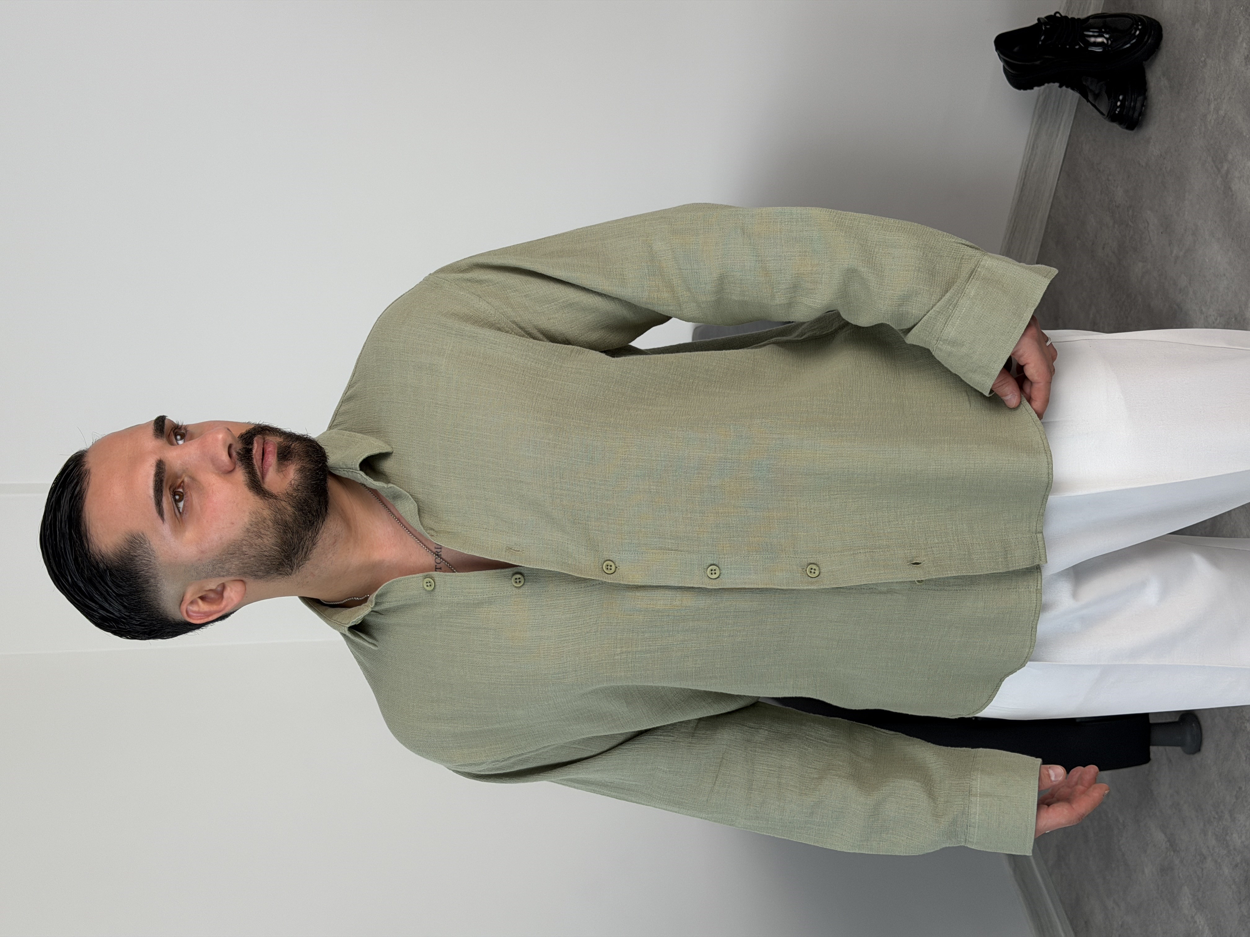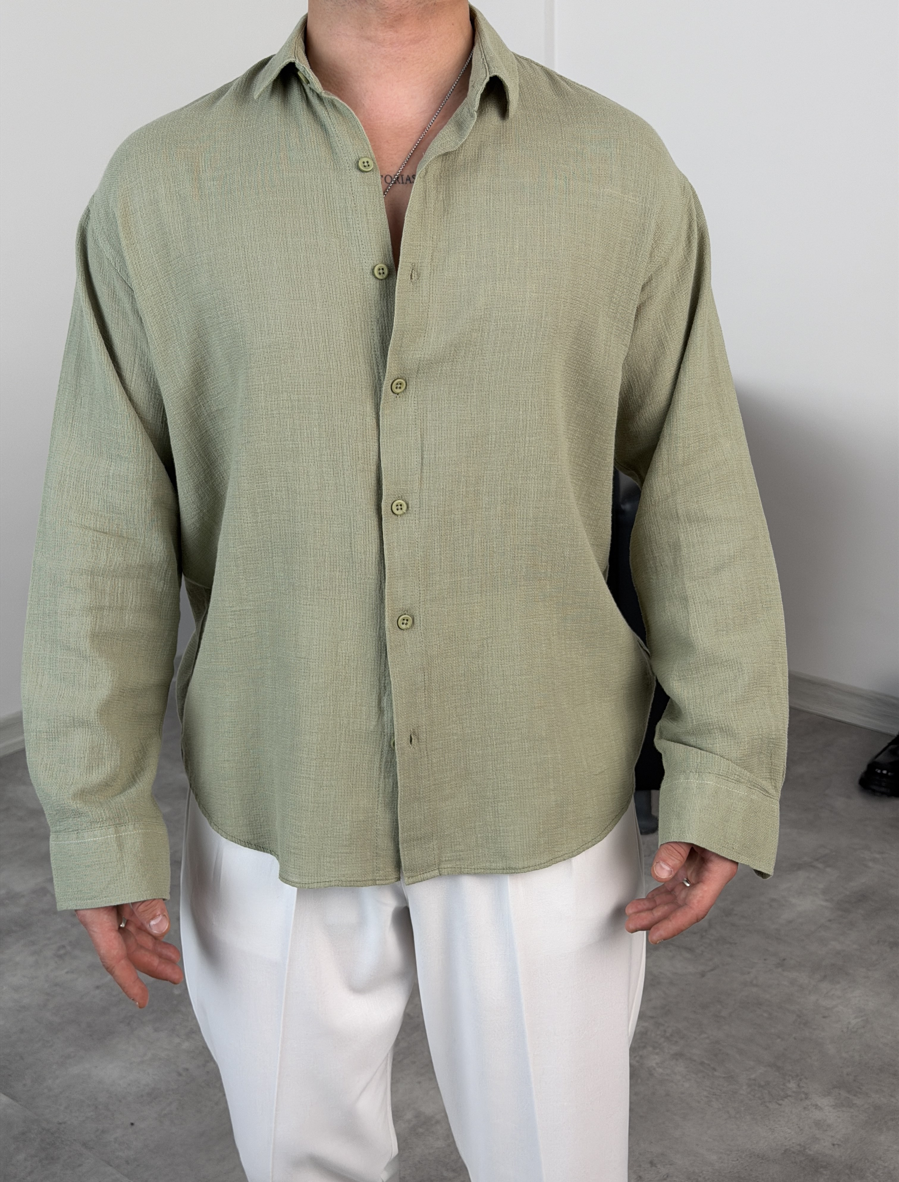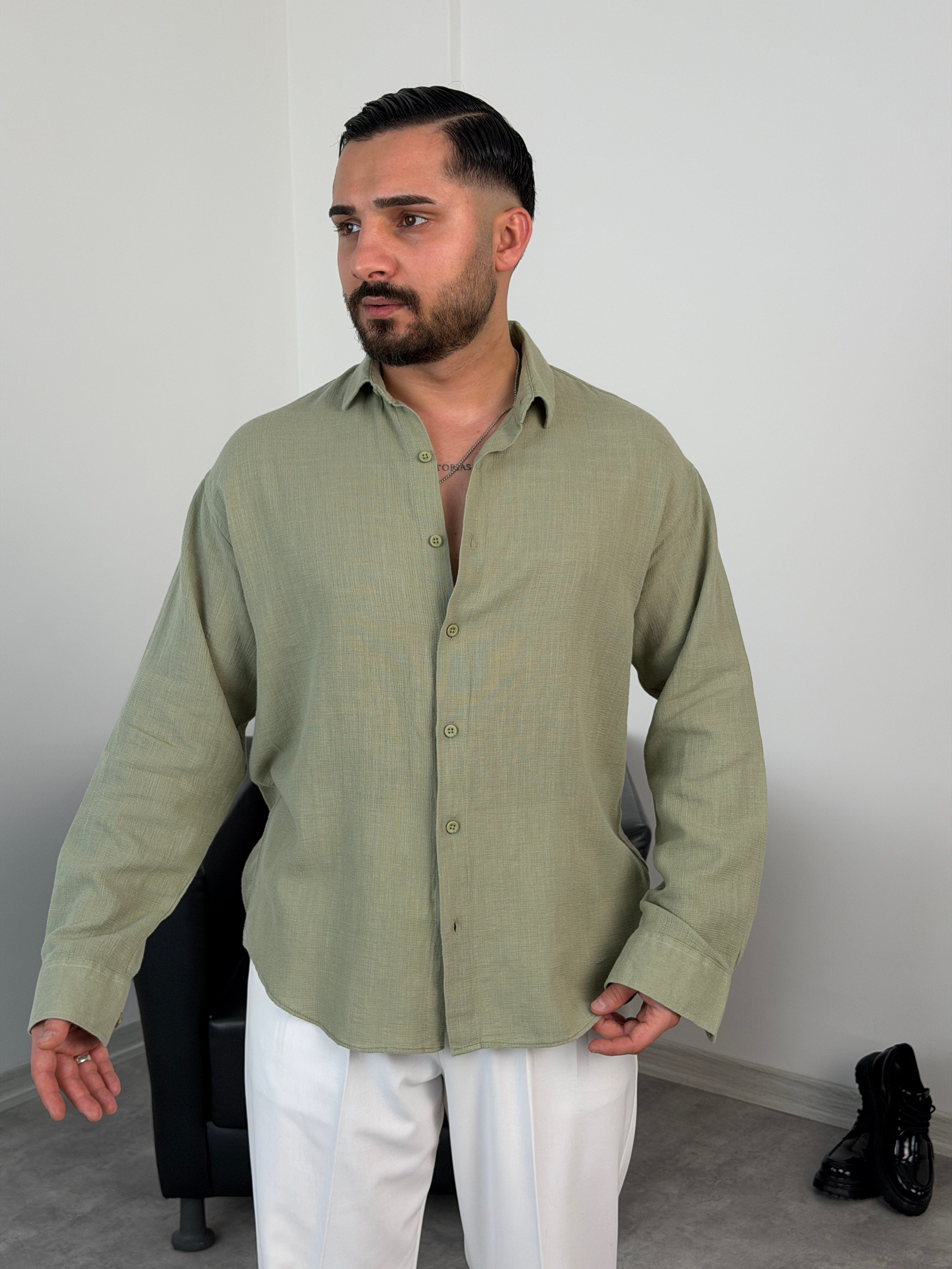 YIKAMALI %PAMUK UZUN KOL OVERSİZE GÖMLEK ÇAĞLA YEŞİLİ