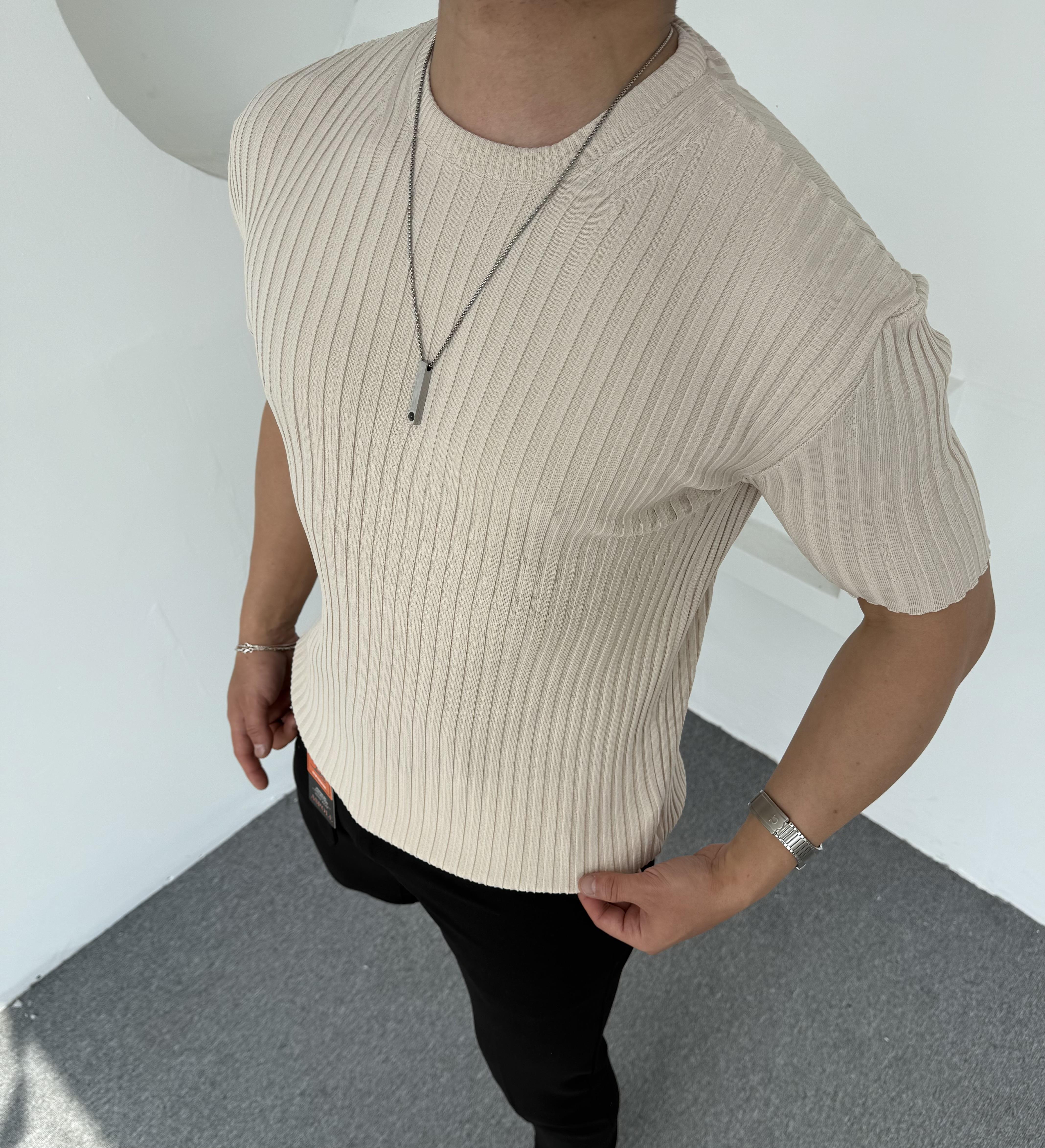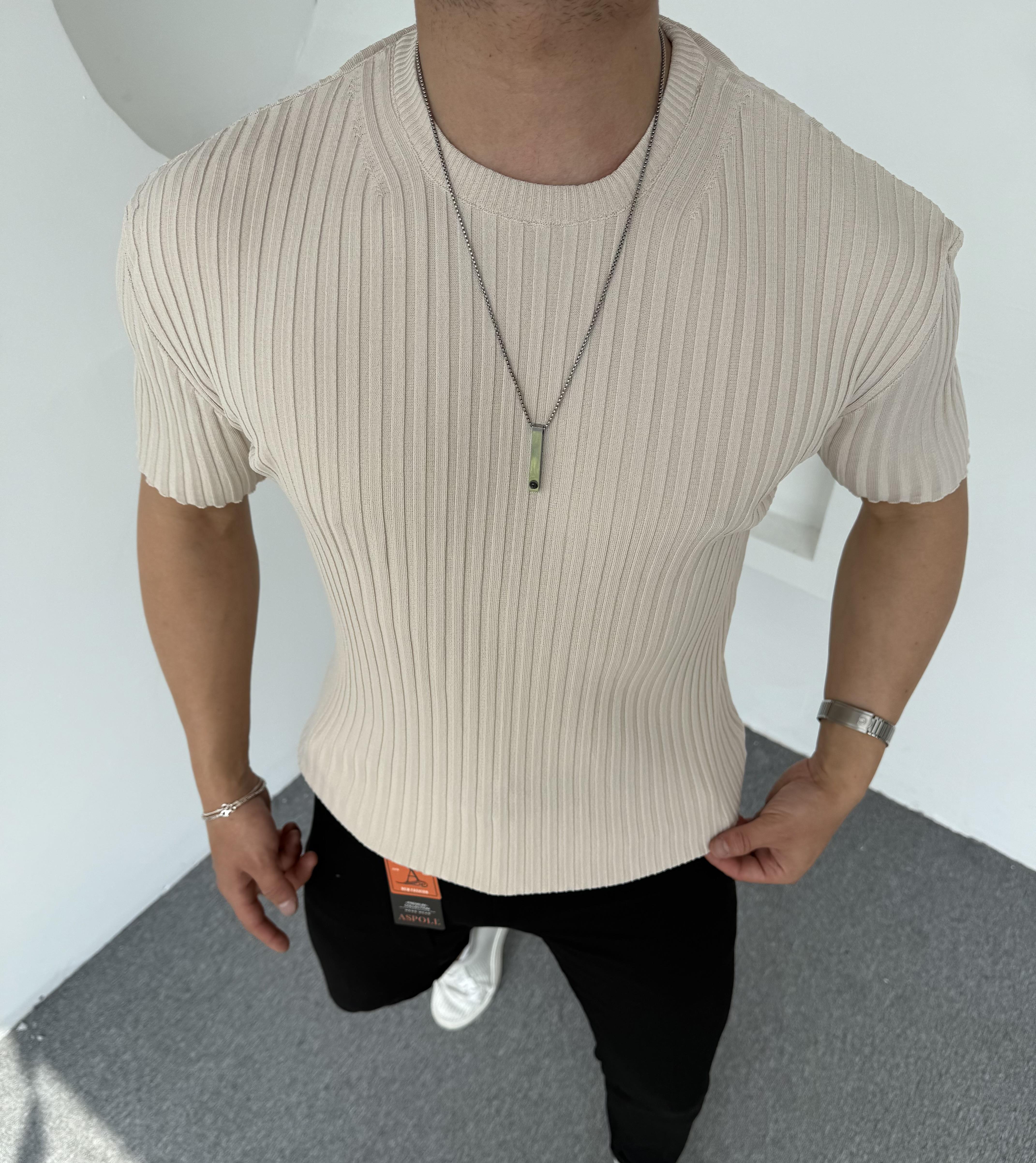 %100 Pamuk Şeritli Bisiklet Yaka Triko Bej