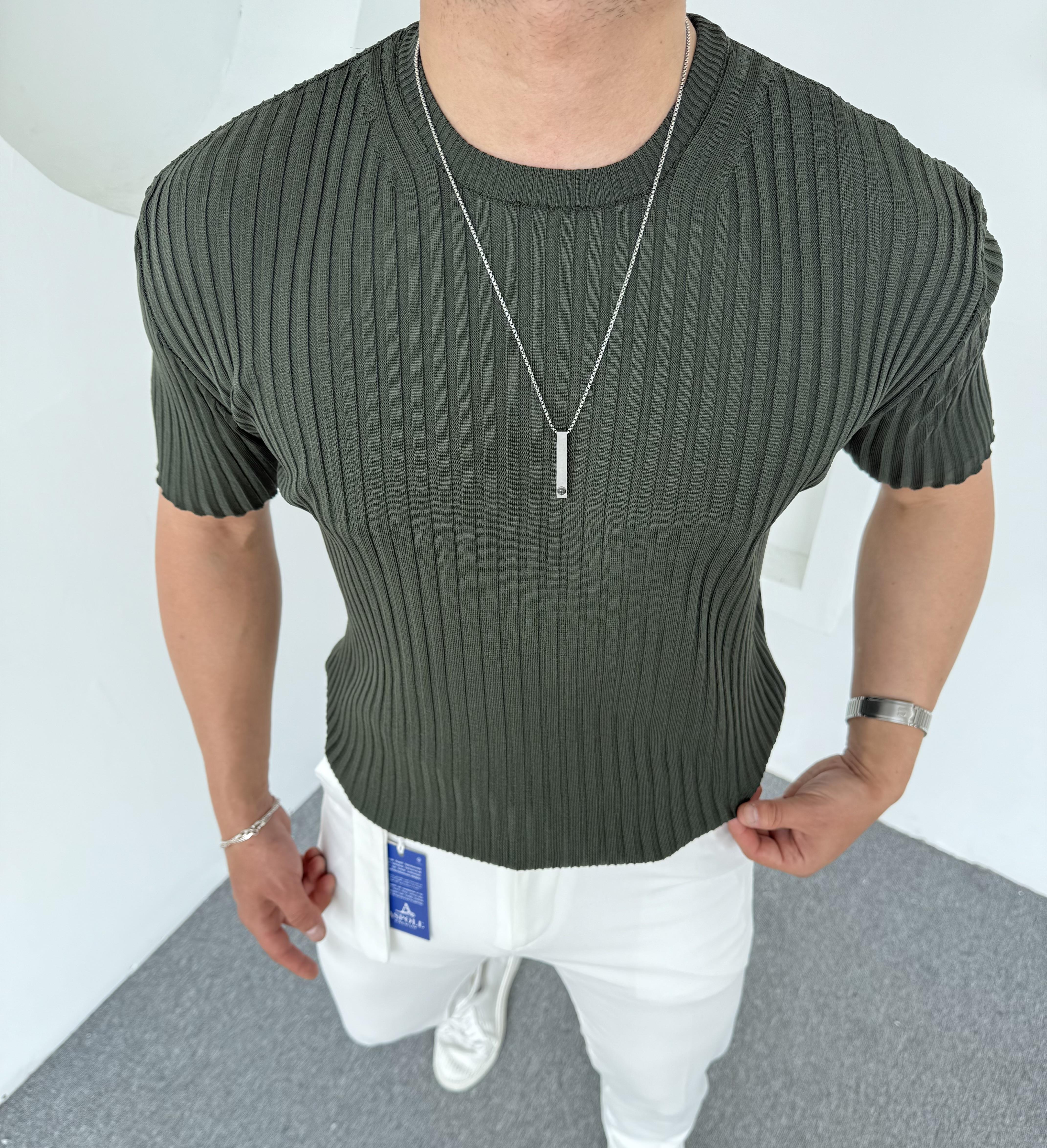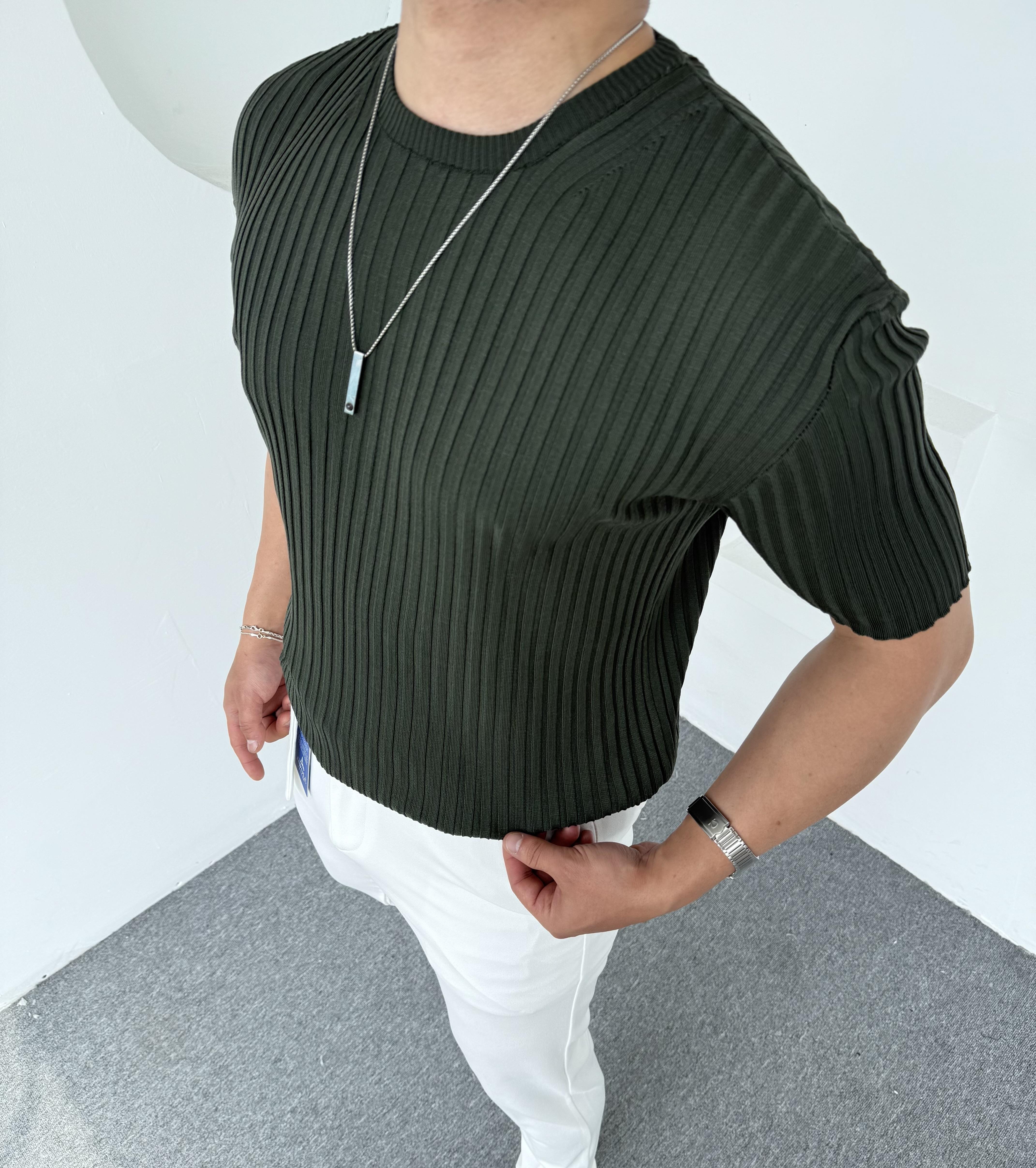 %100 Pamuk Şeritli Bisiklet Yaka Triko Haki Yeşil