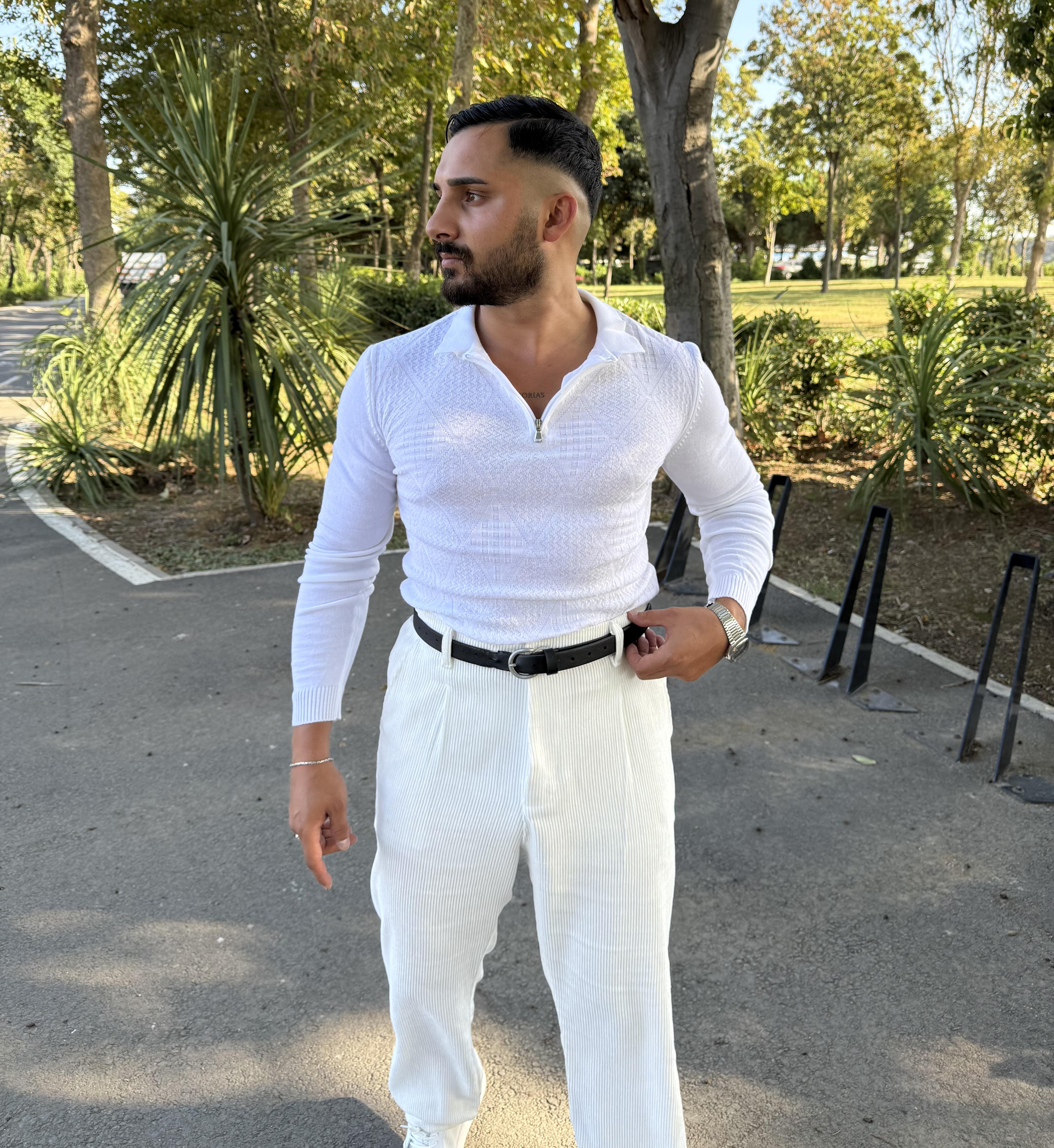 BAKLAVA DESEN YARIM FERMUAR TRİKO BEYAZ