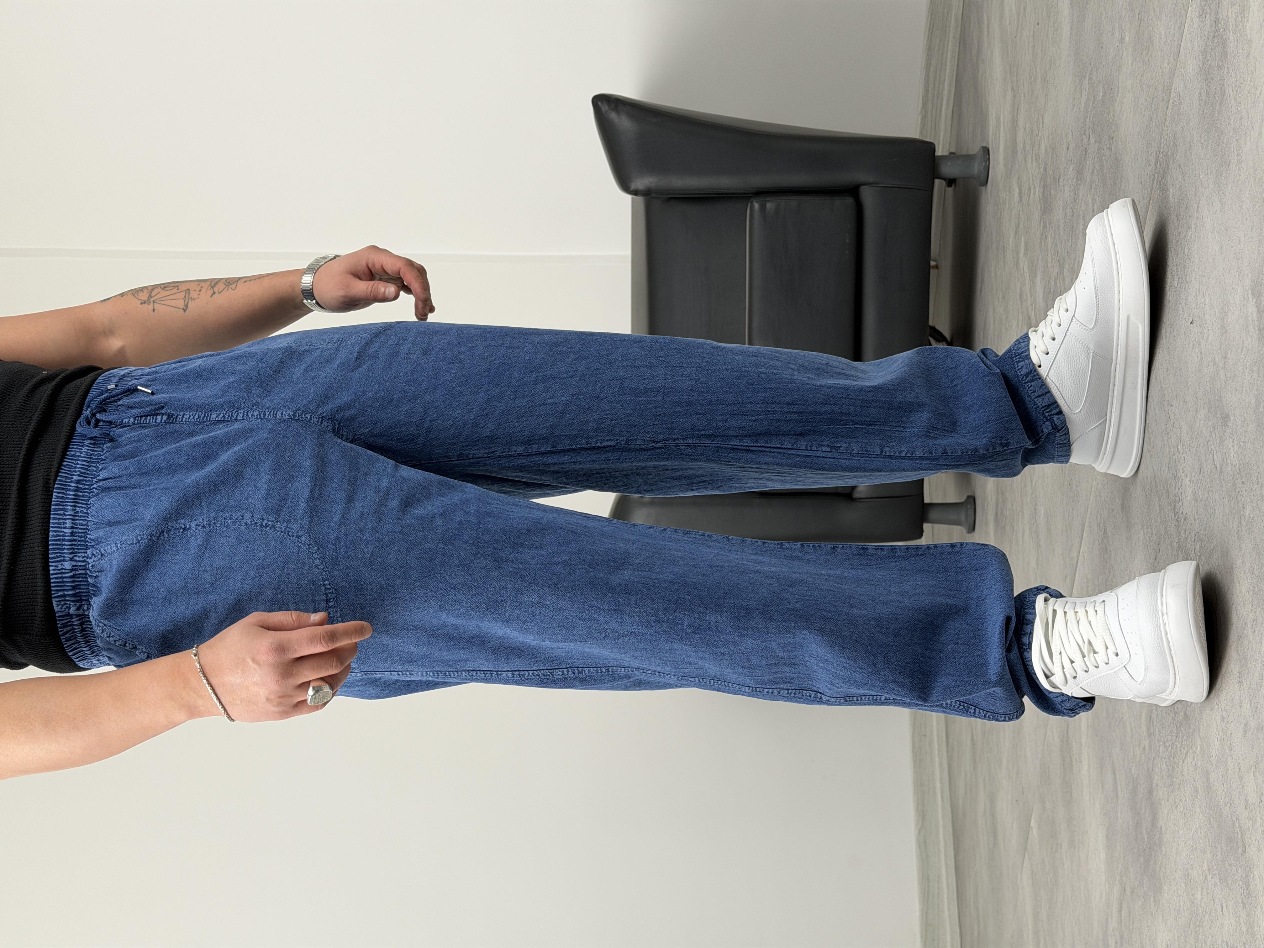 BELİ LASTİKLİ KETEN BAGGY PANTOLON KOT MAVİ
