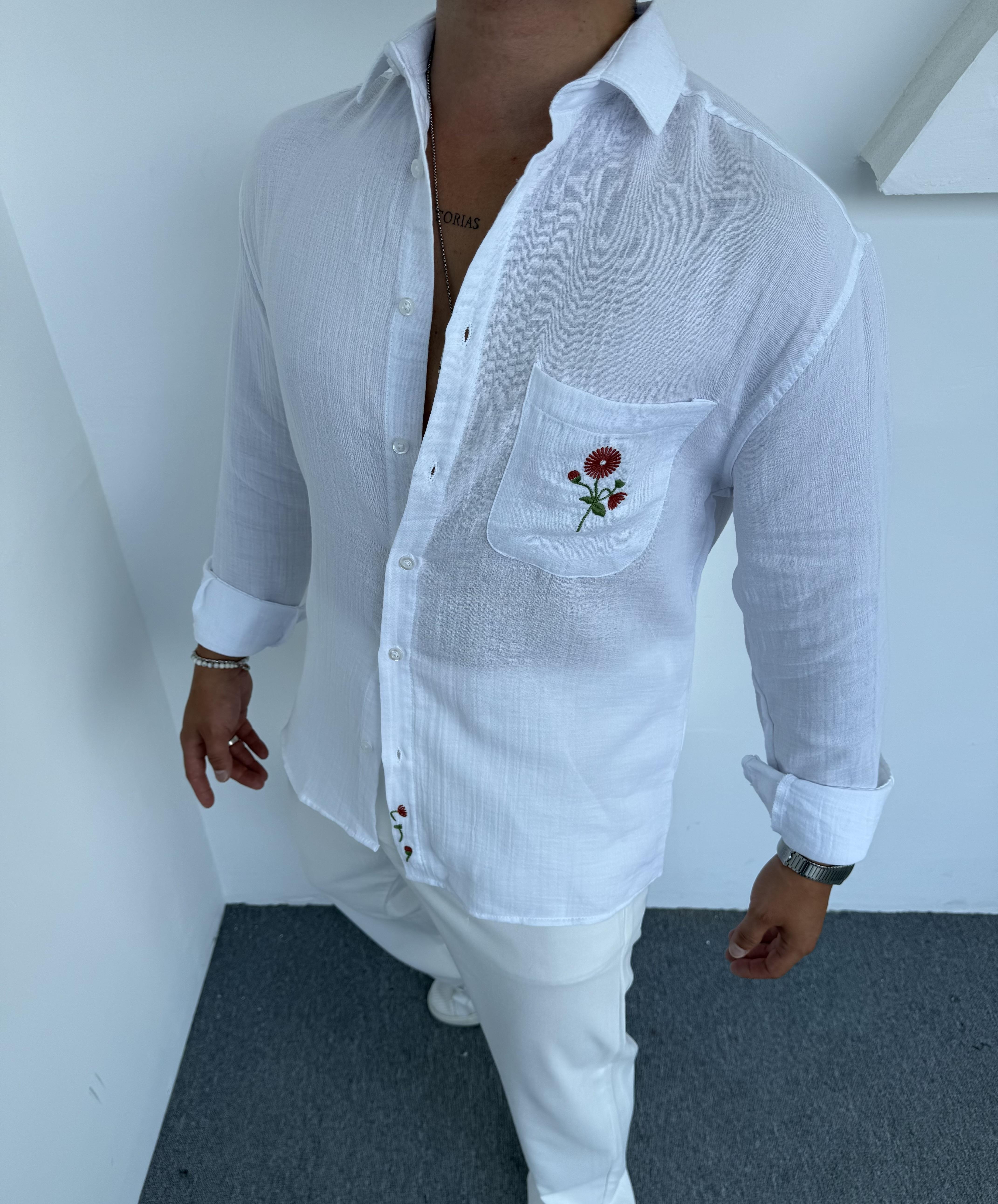 Çiçek Nakışlı Keten Gömlek Beyaz
