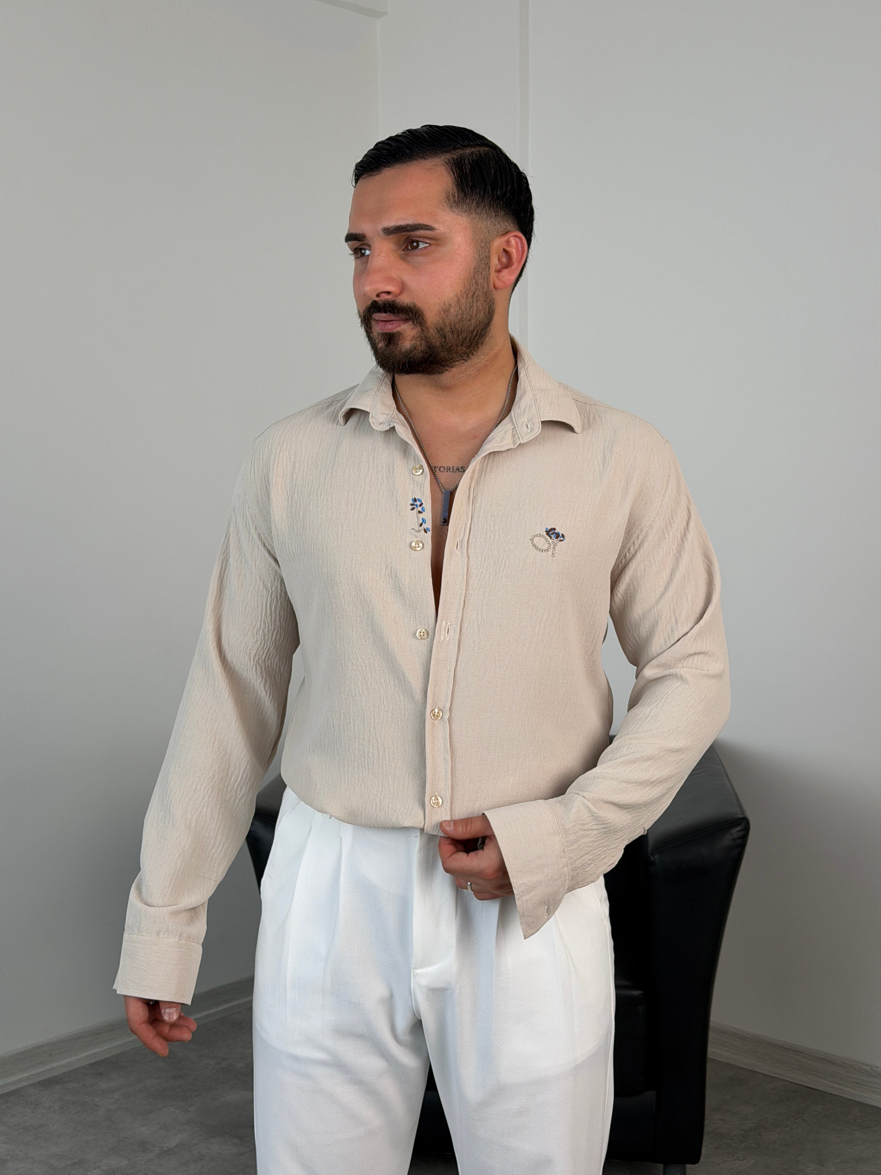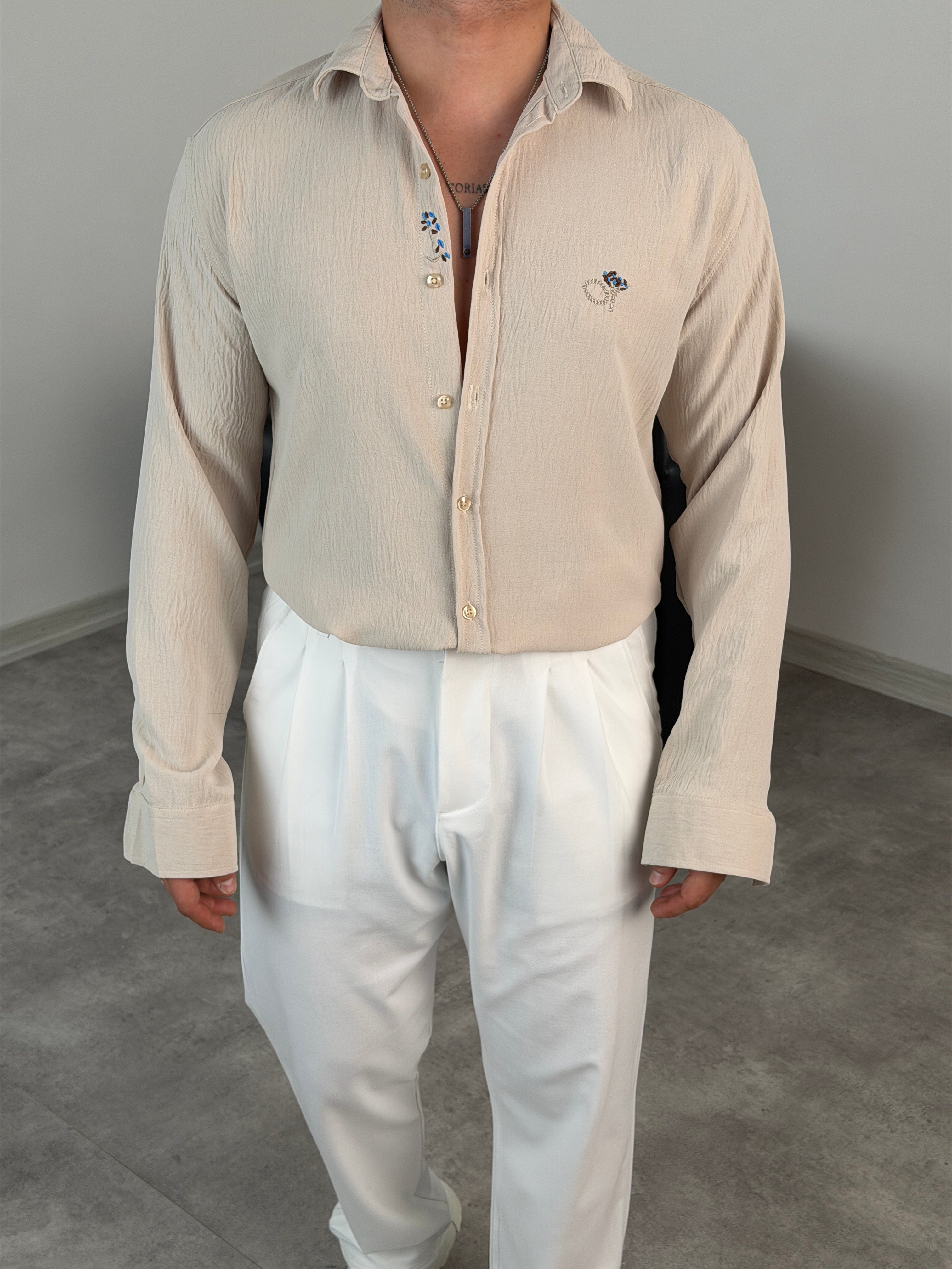 ÇİÇEK NAKIŞLI UZUNKOL GÖMLEK BEJ