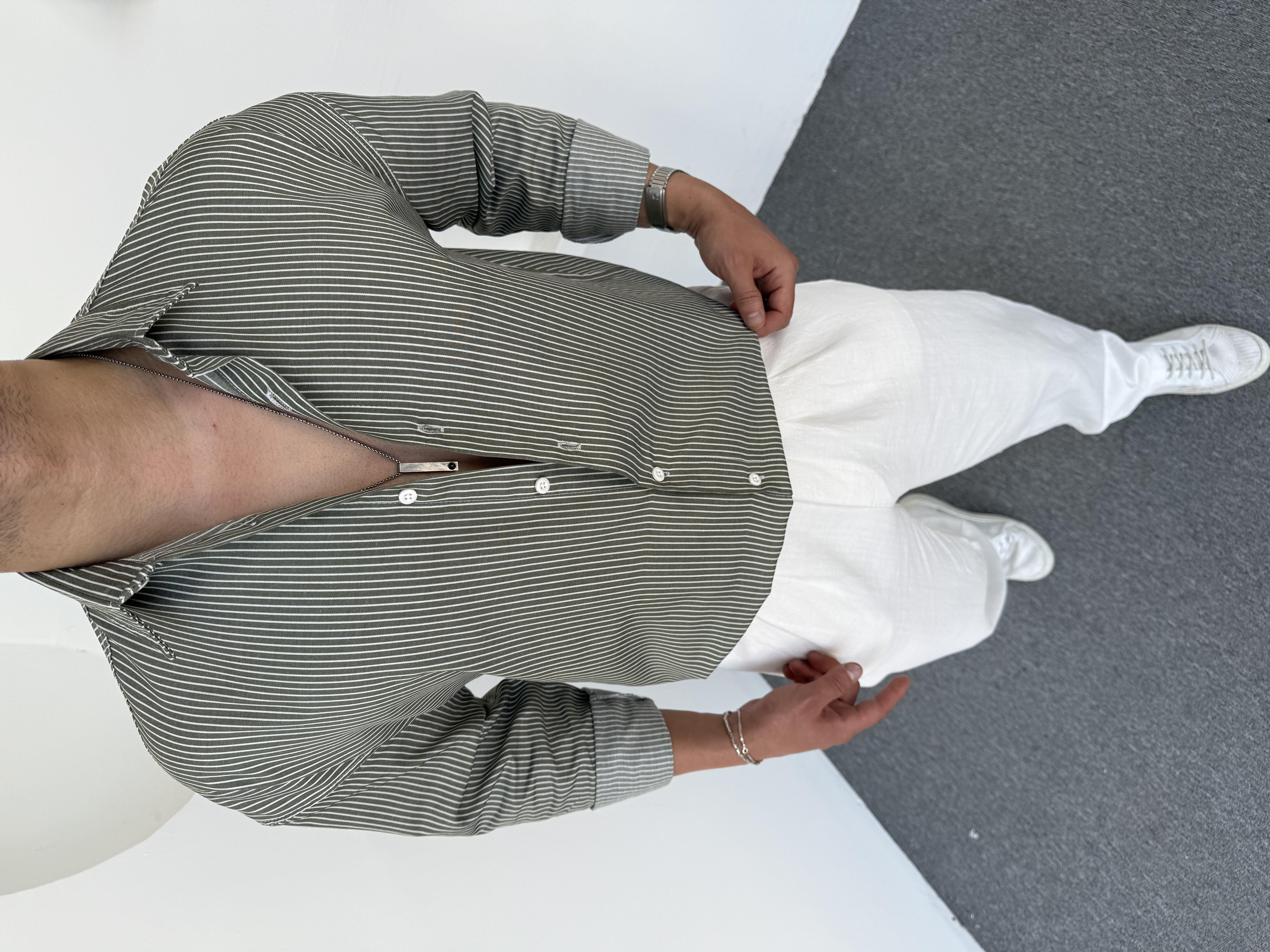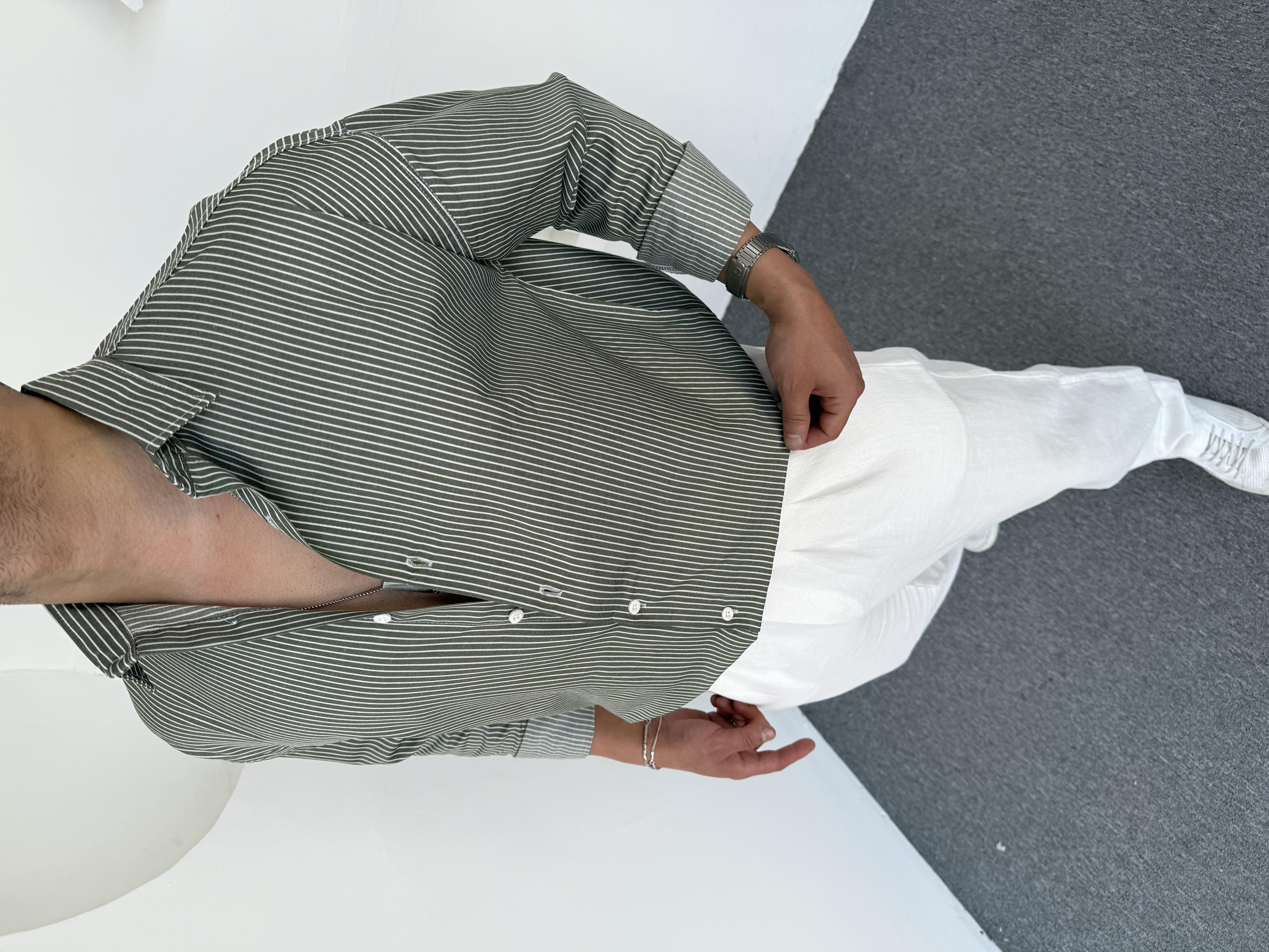 Çizgi Detay Keten Gömlek Yeşil