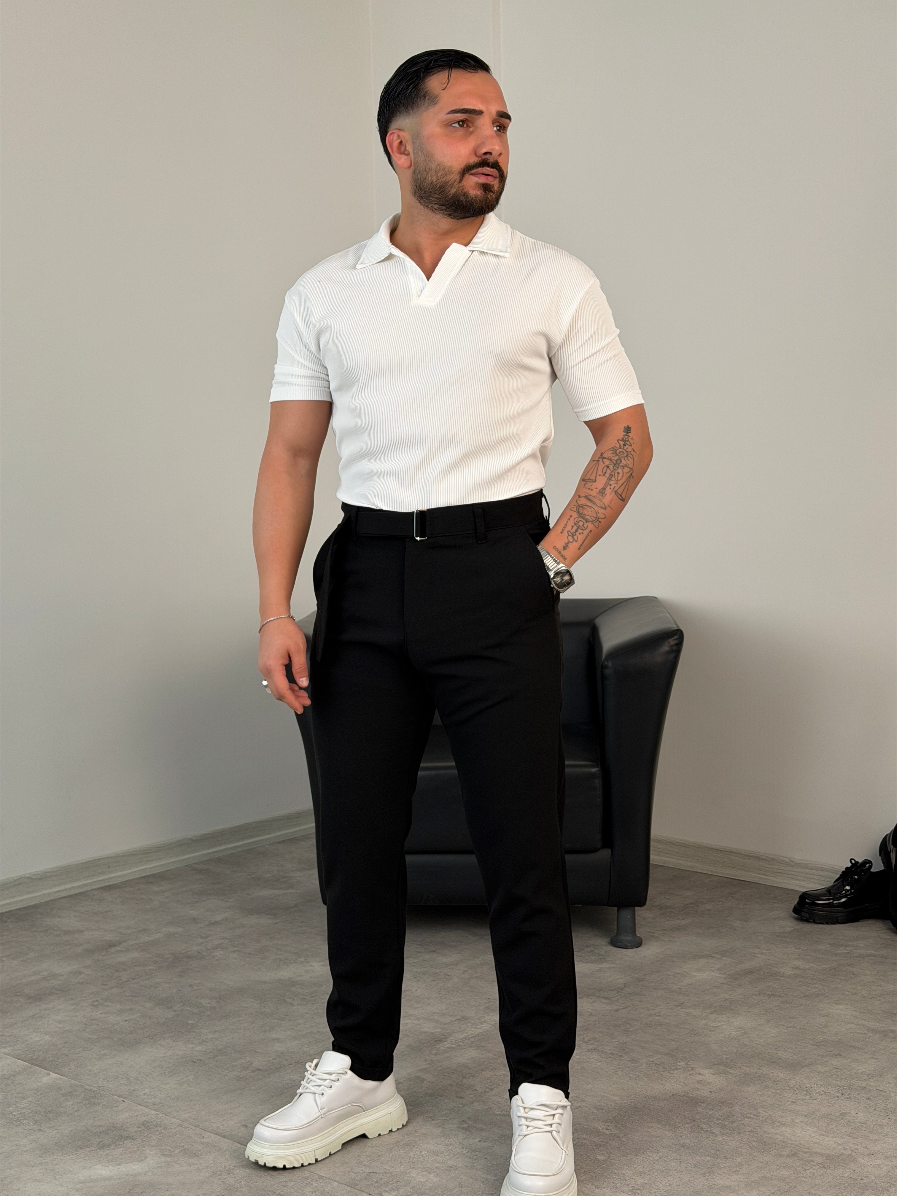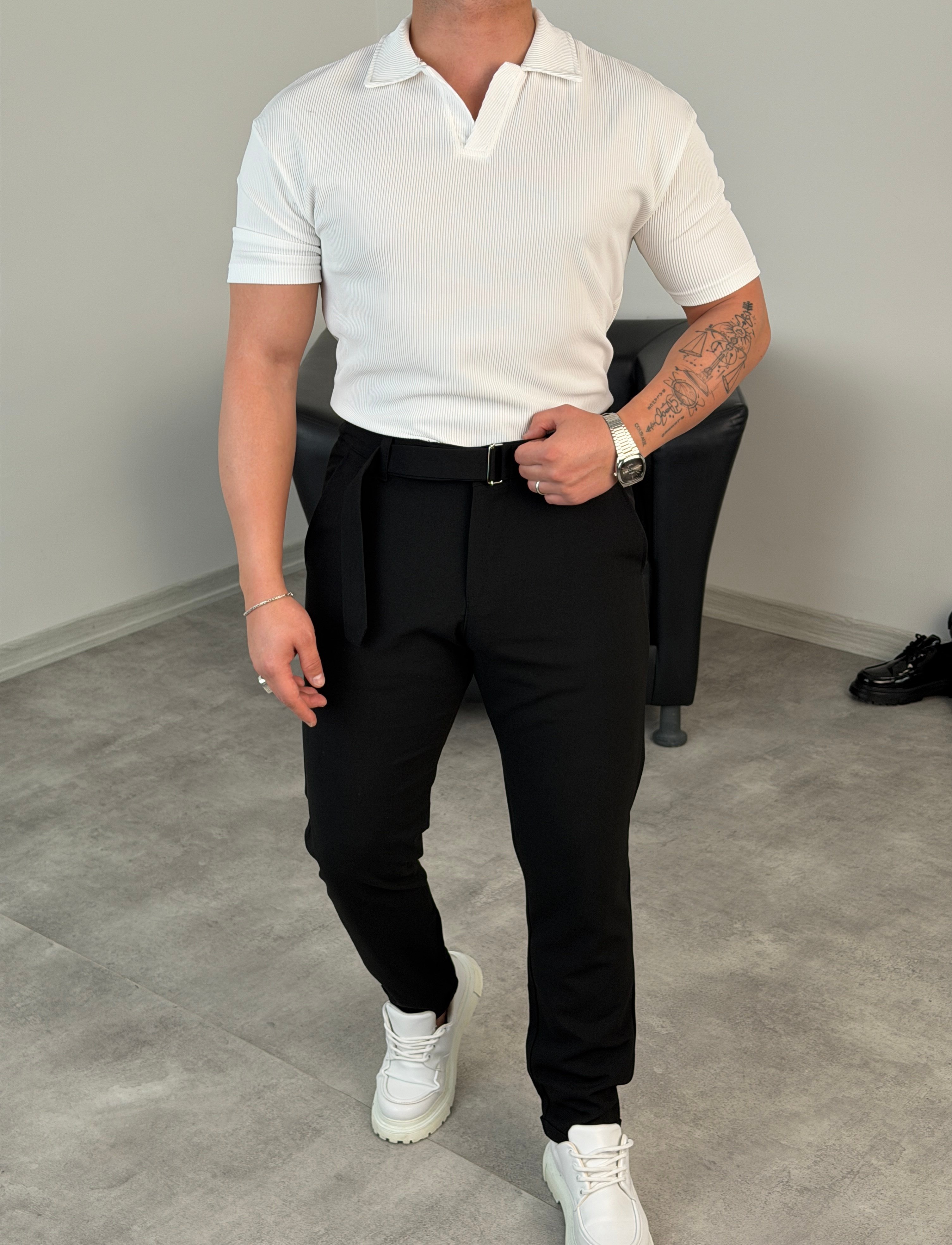 Siyah KENDİNDEN KEMERLİ PANTOLON BEYAZ OVERSİZE POLO YAKA TİŞÖRT