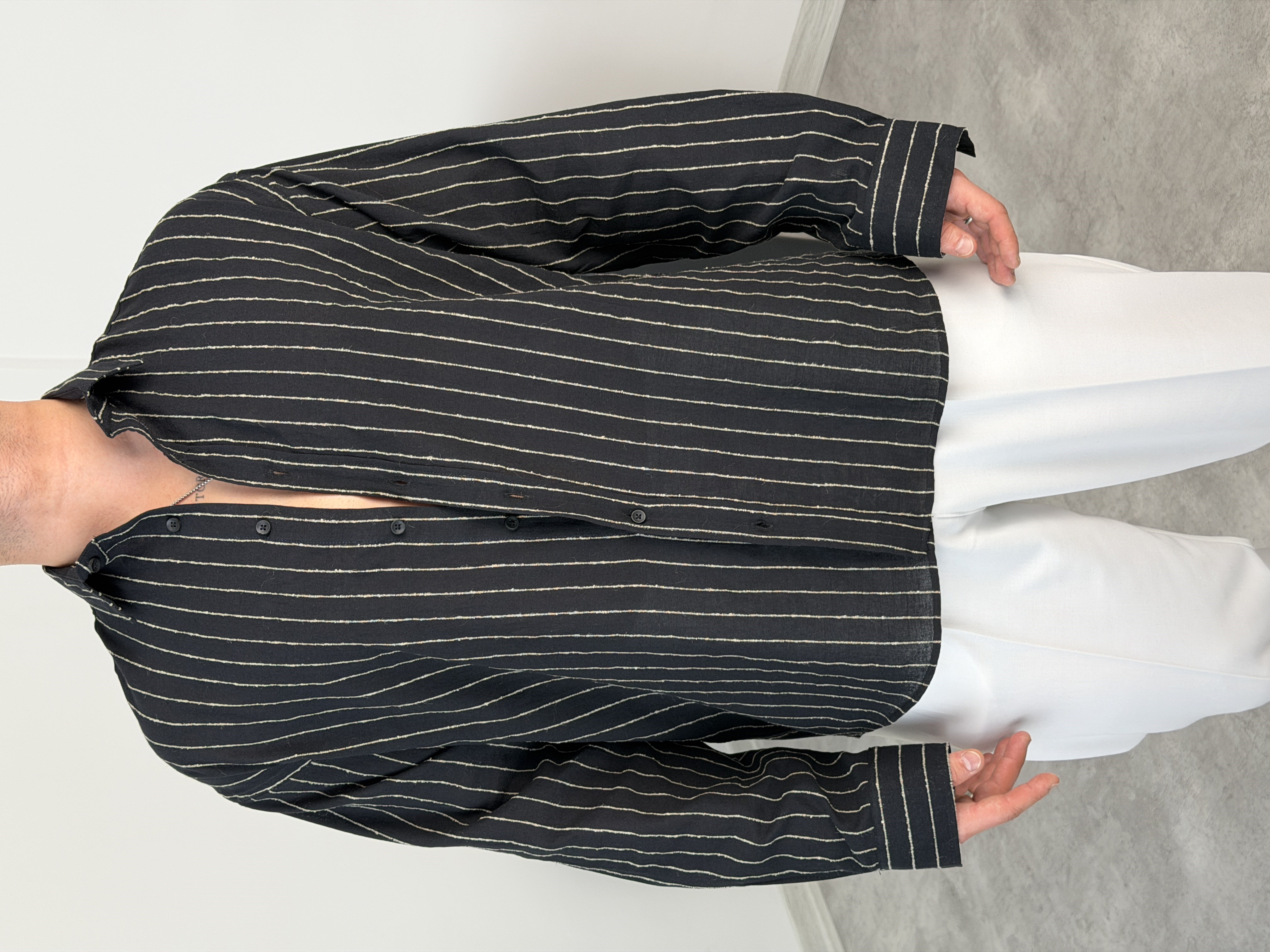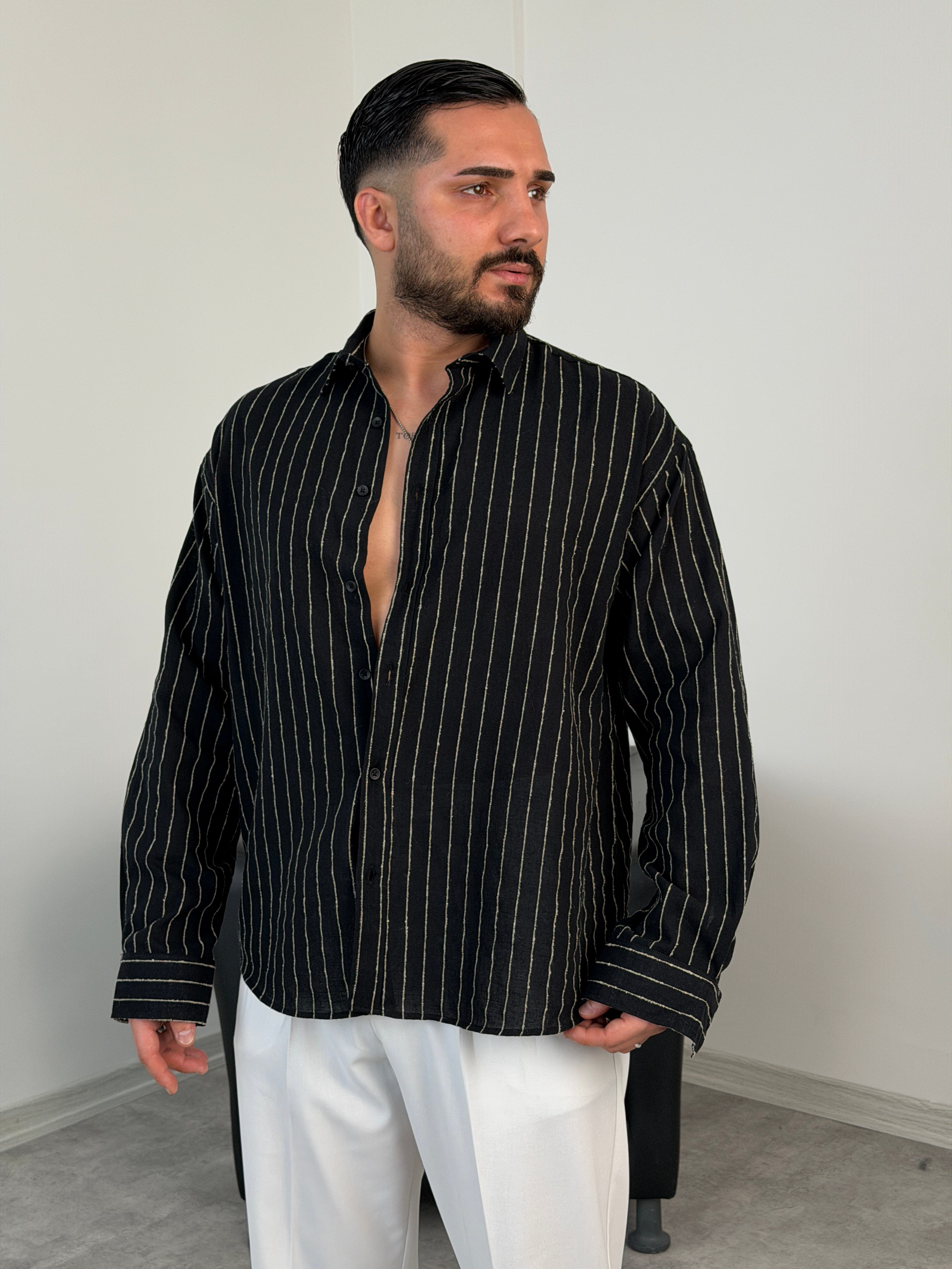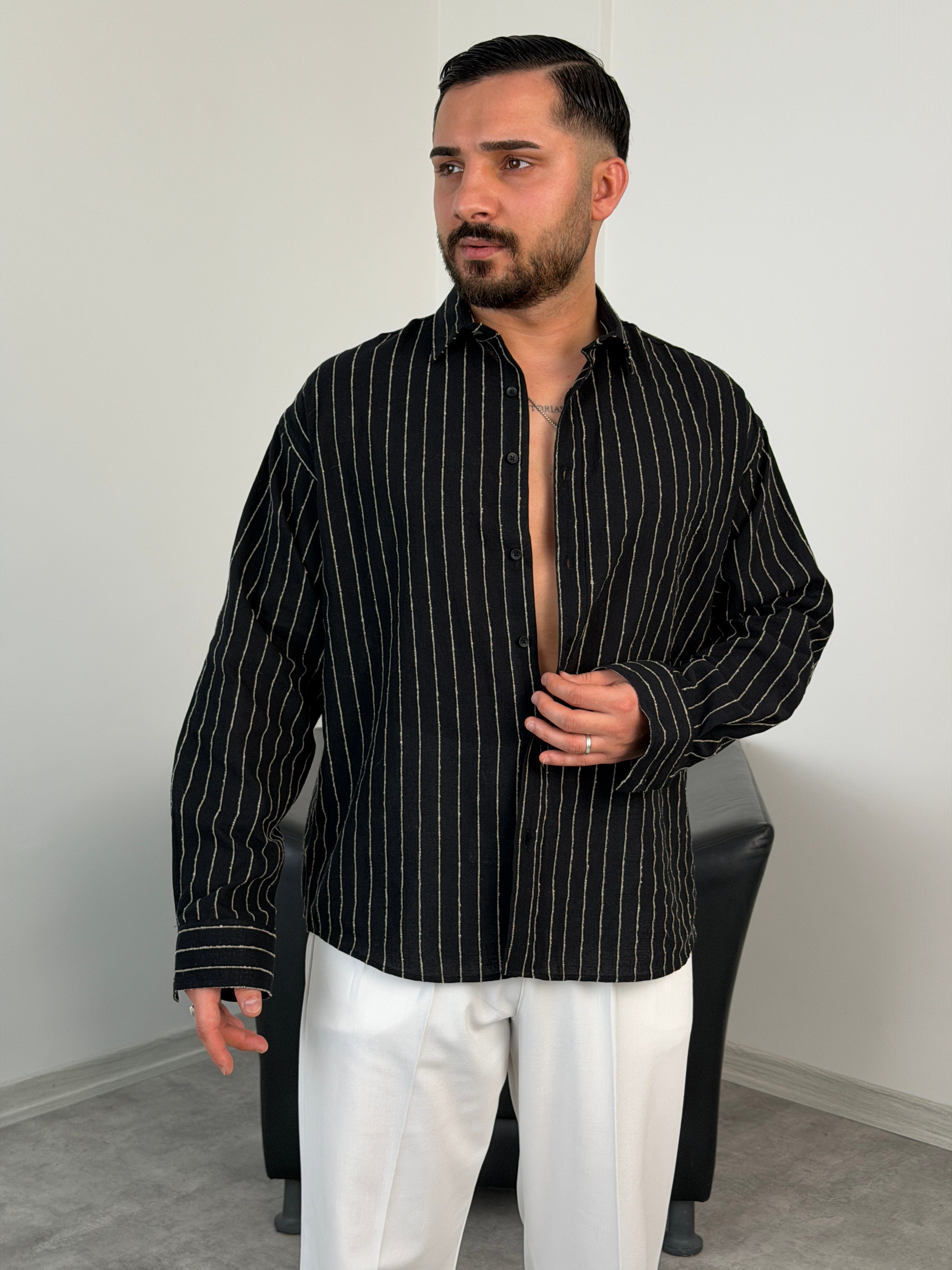 HFA İNCE ÇİZGİ PAMUK KETEN GÖMLEK SİYAH