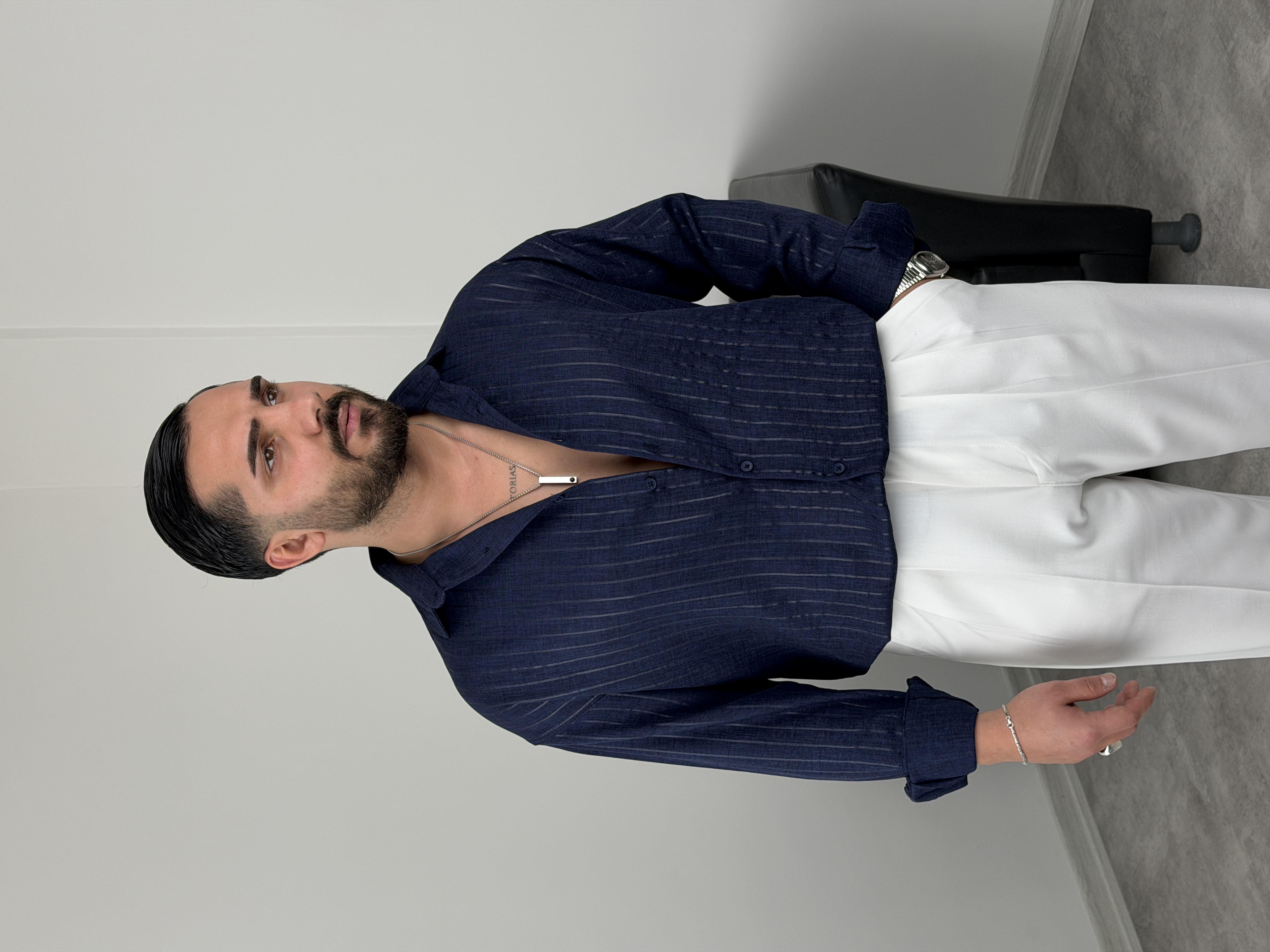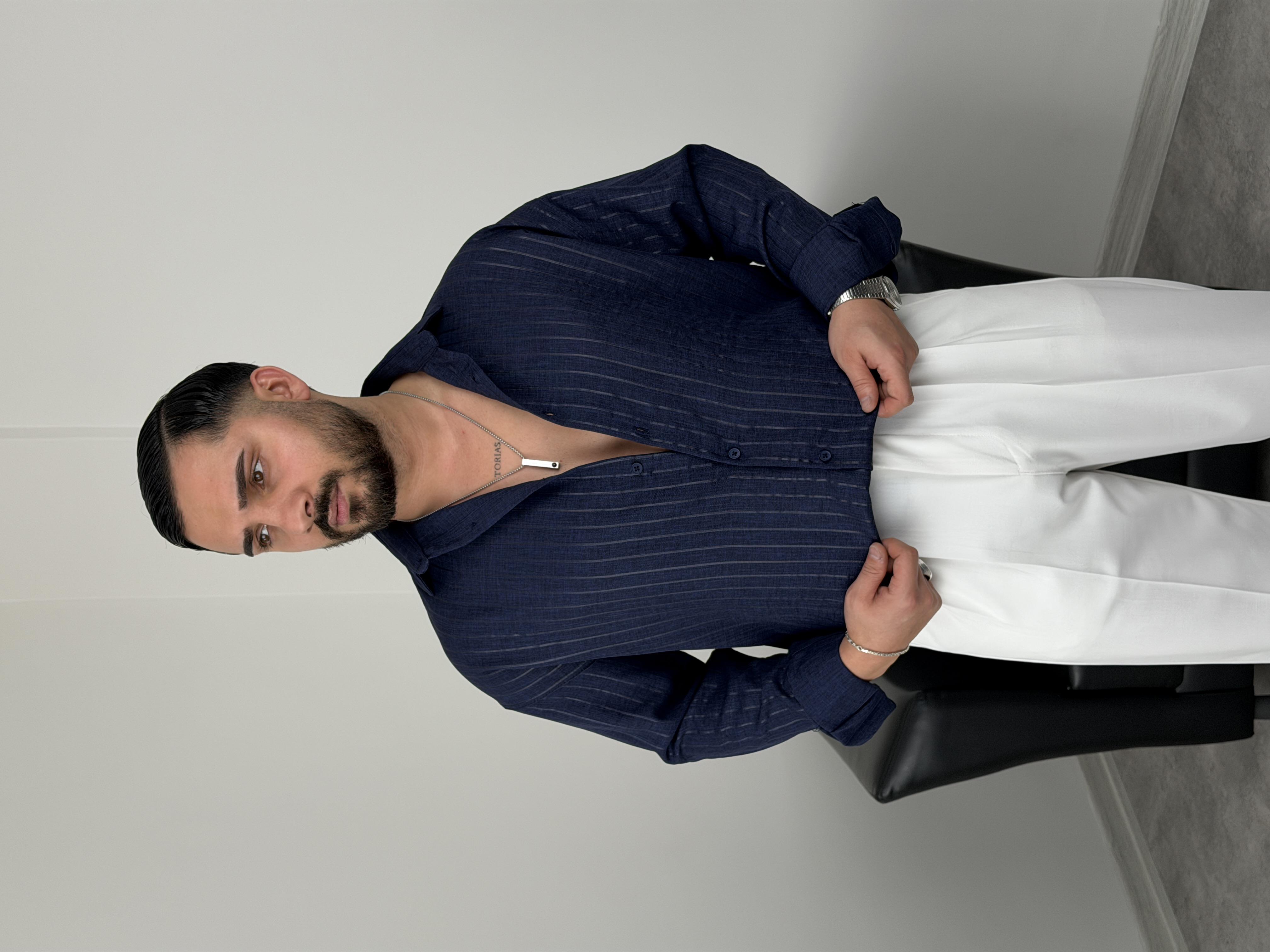 İNCE FİTİL DETAYLI UZUNKOL ÖRME KETEN GÖMLEK LACİVERT