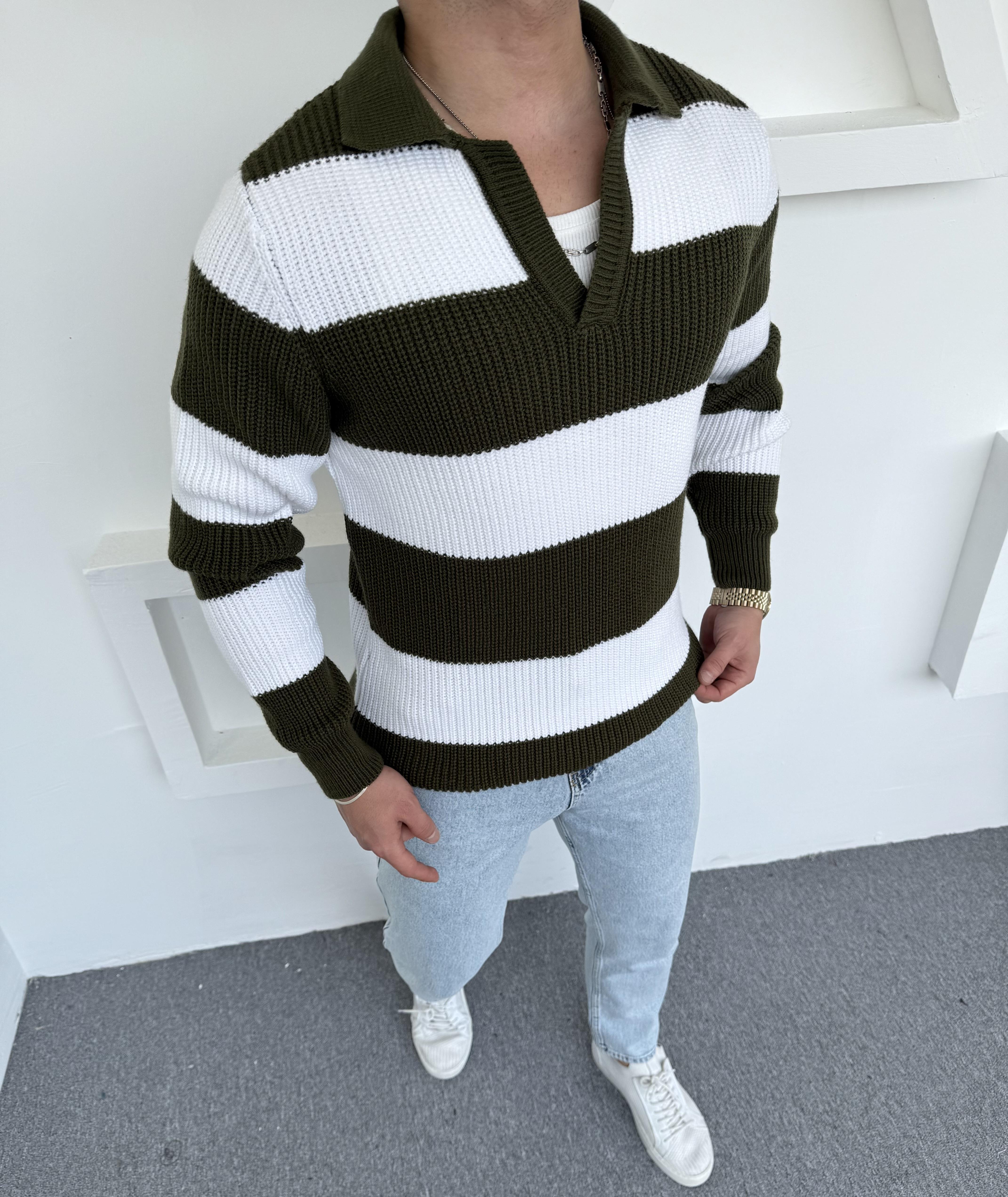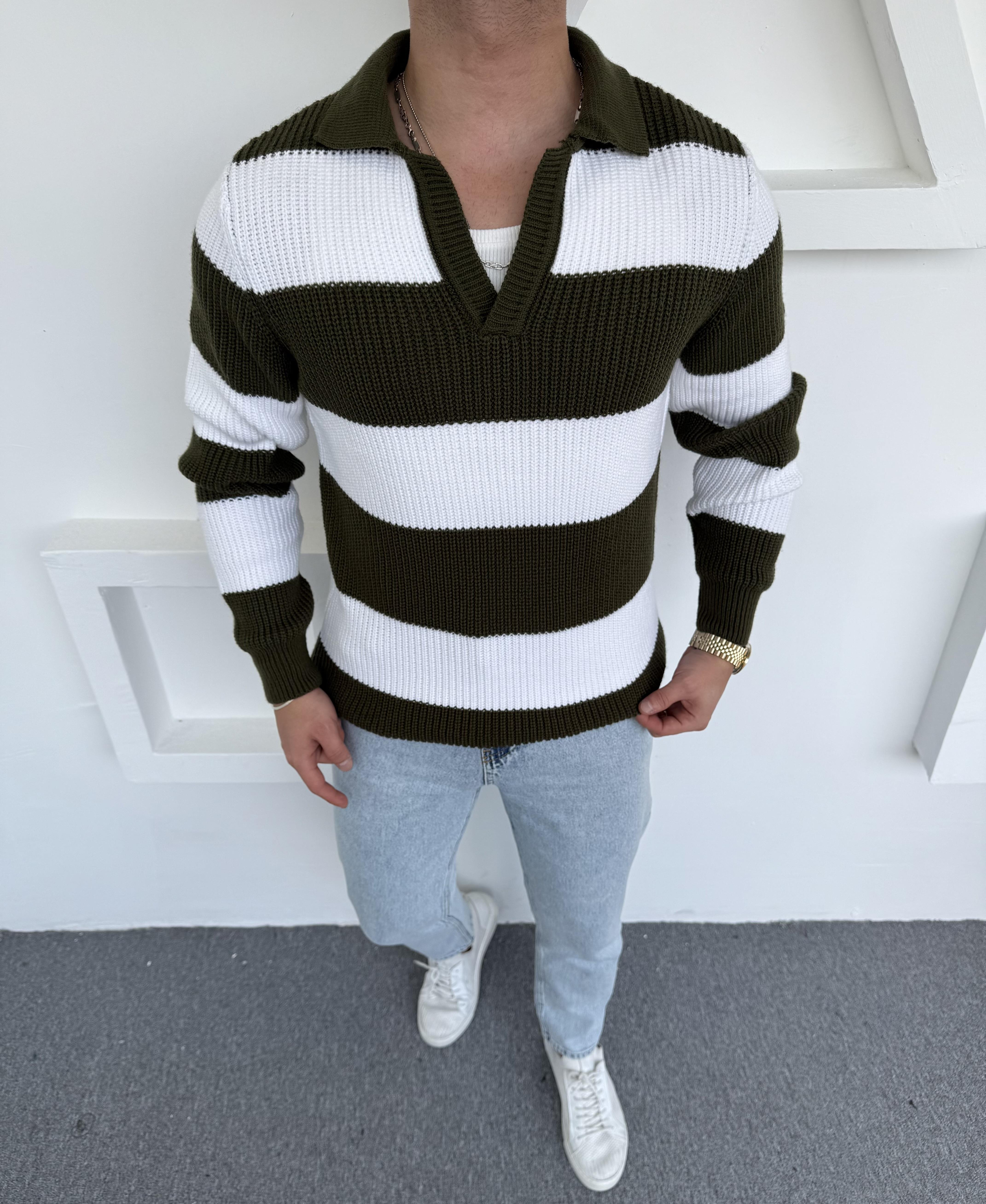 Kalın Açık Polo Yaka Oversize Triko Haki