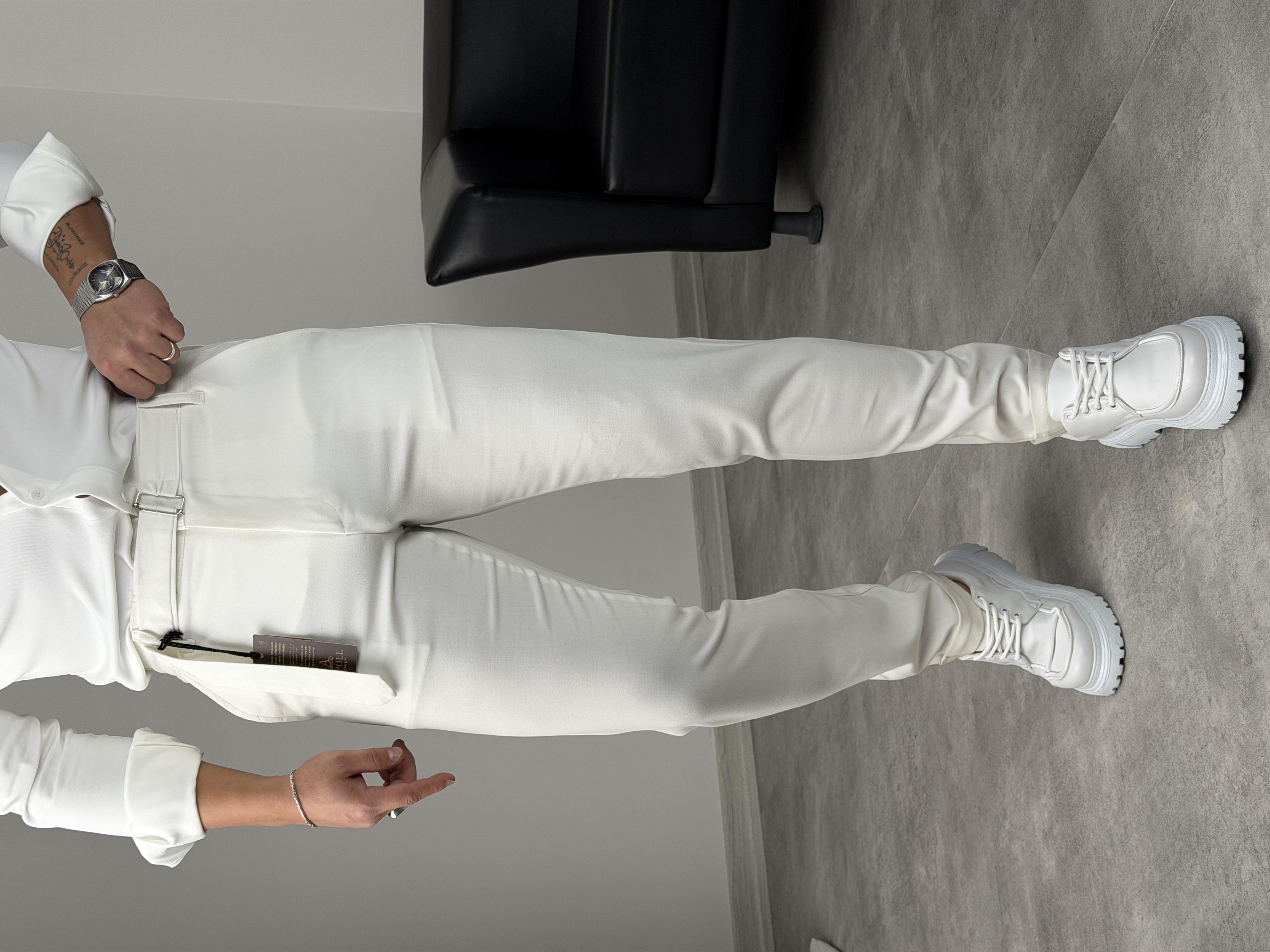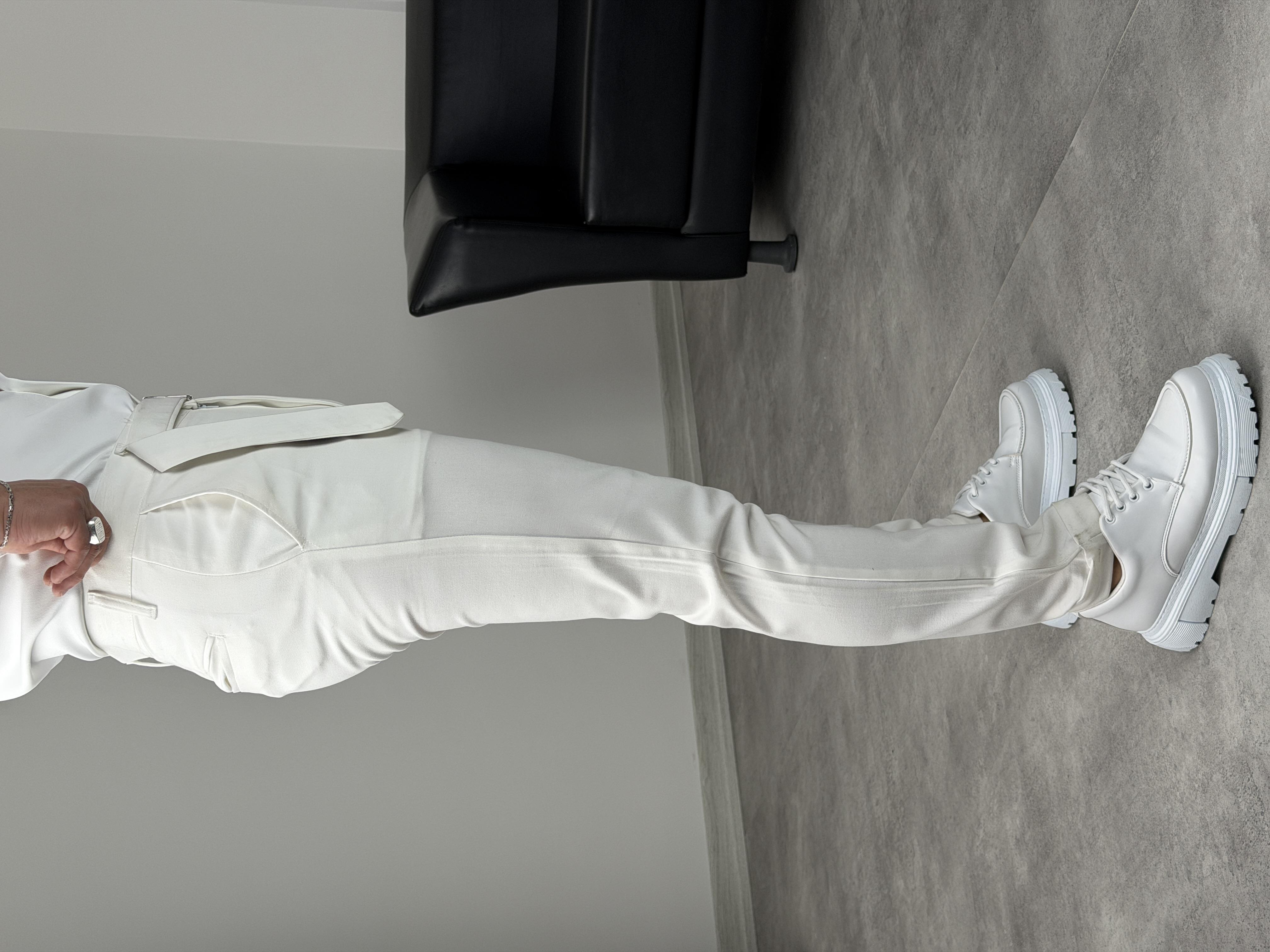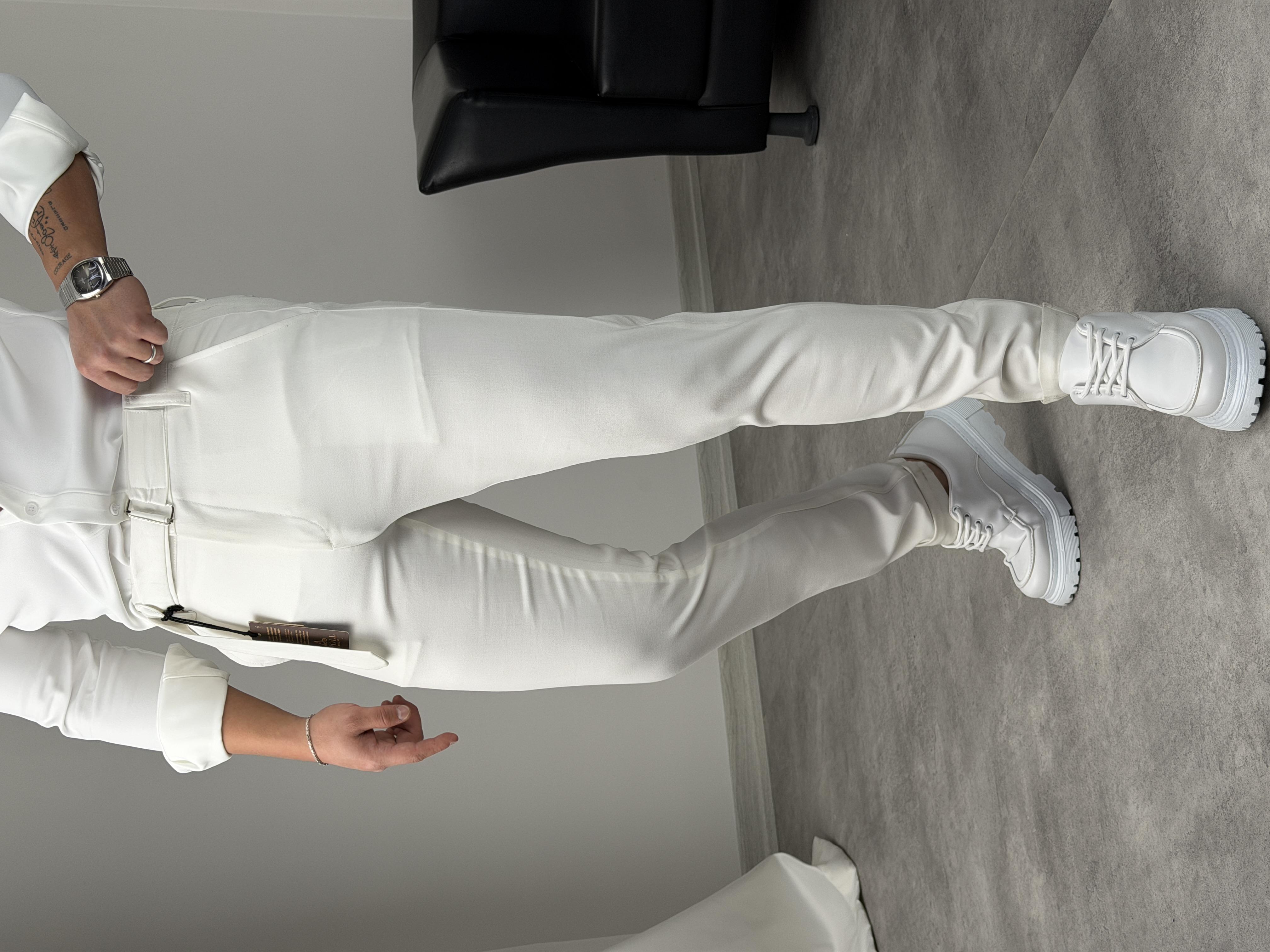 KENDİNDEN KEMERLİ DUBLE PAÇA KUMAŞ PANTOLON BEYAZ