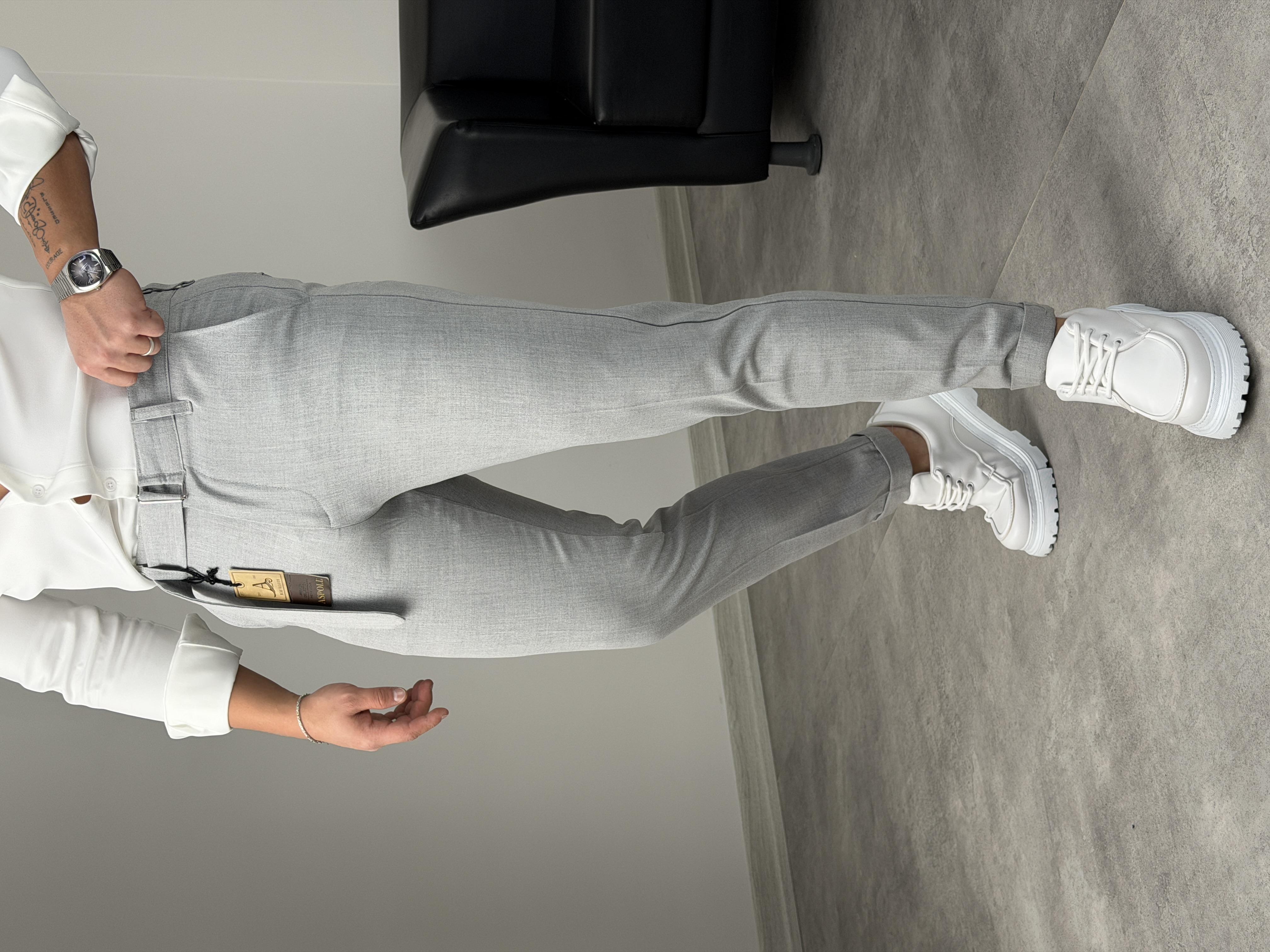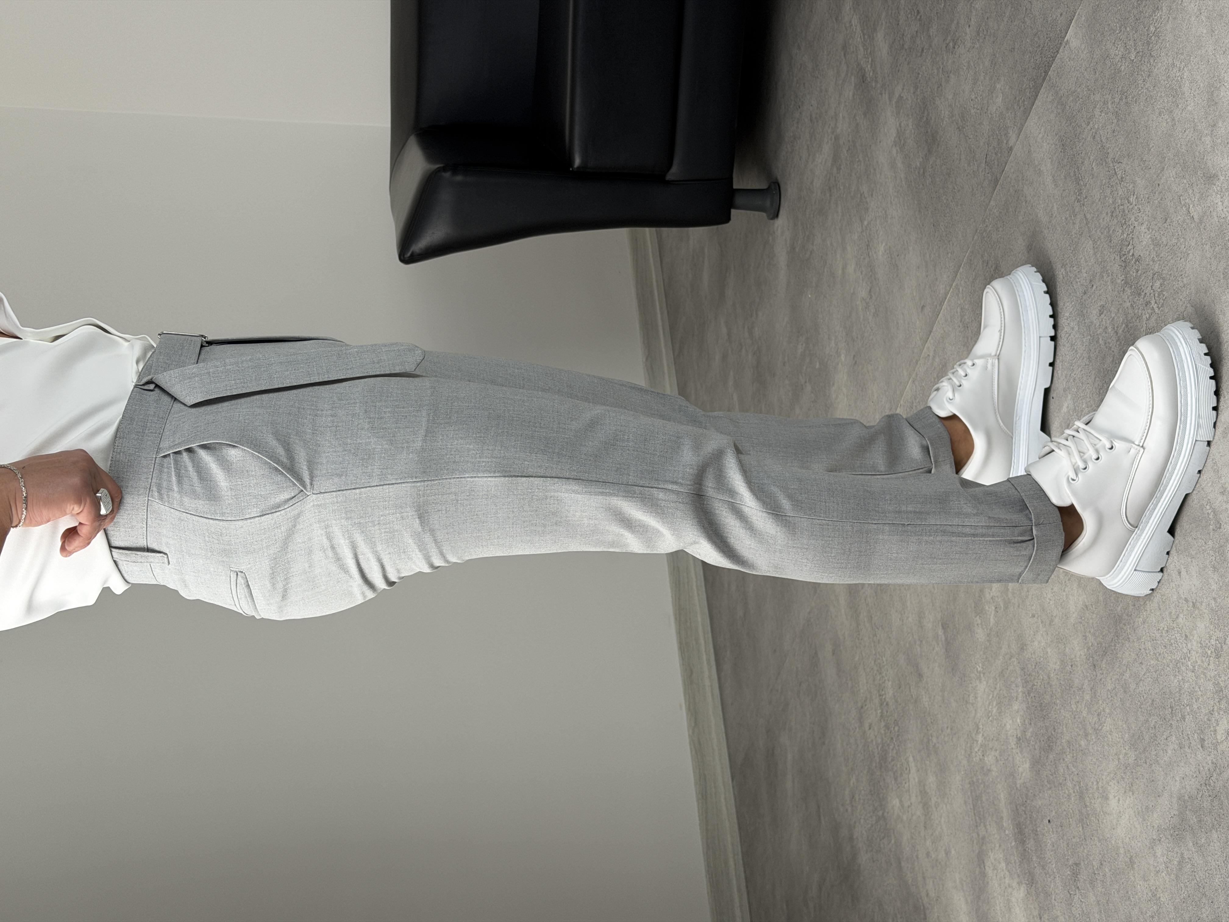 KENDİNDEN KEMERLİ DUBLE PAÇA KUMAŞ PANTOLON GRİ