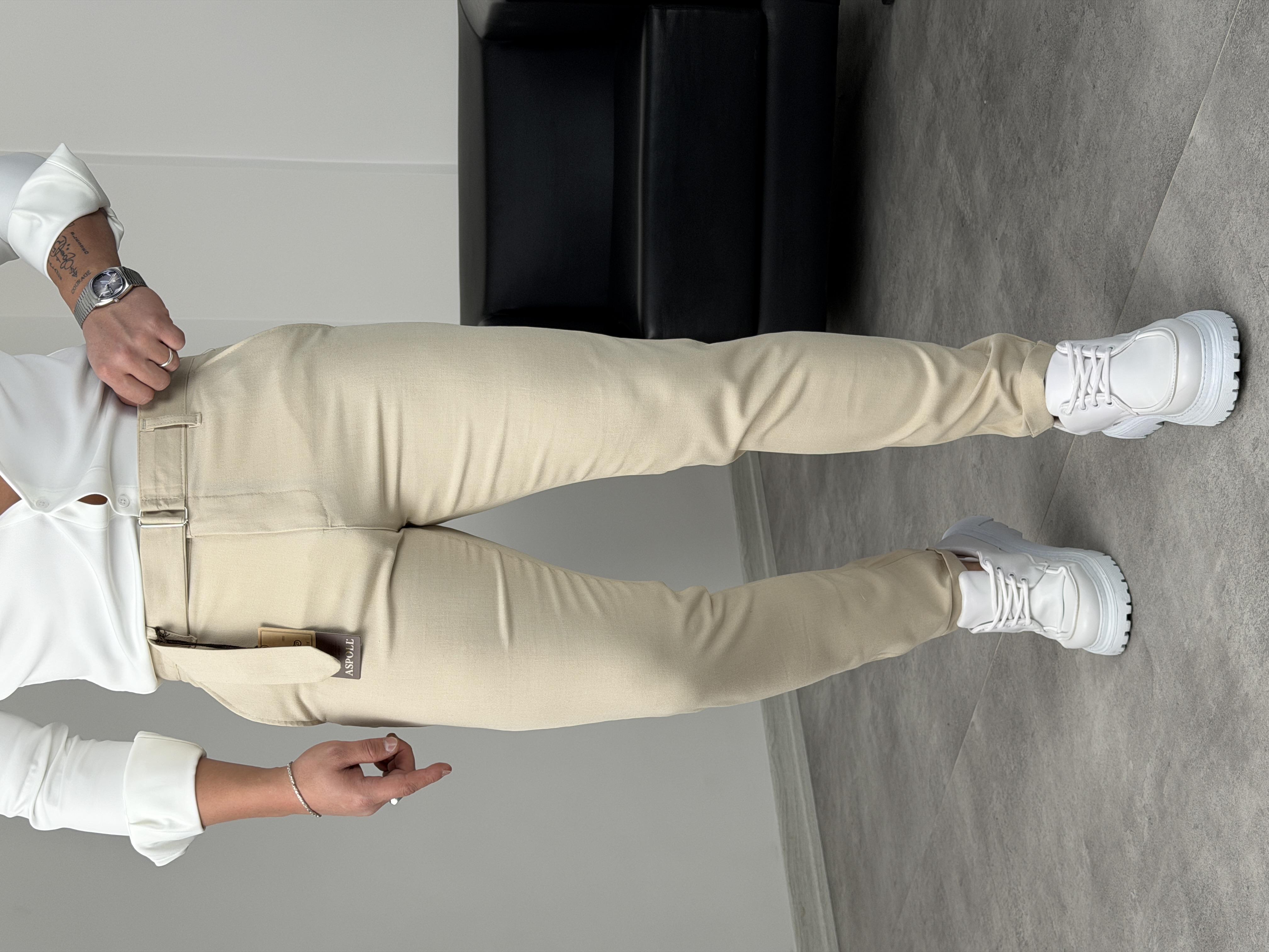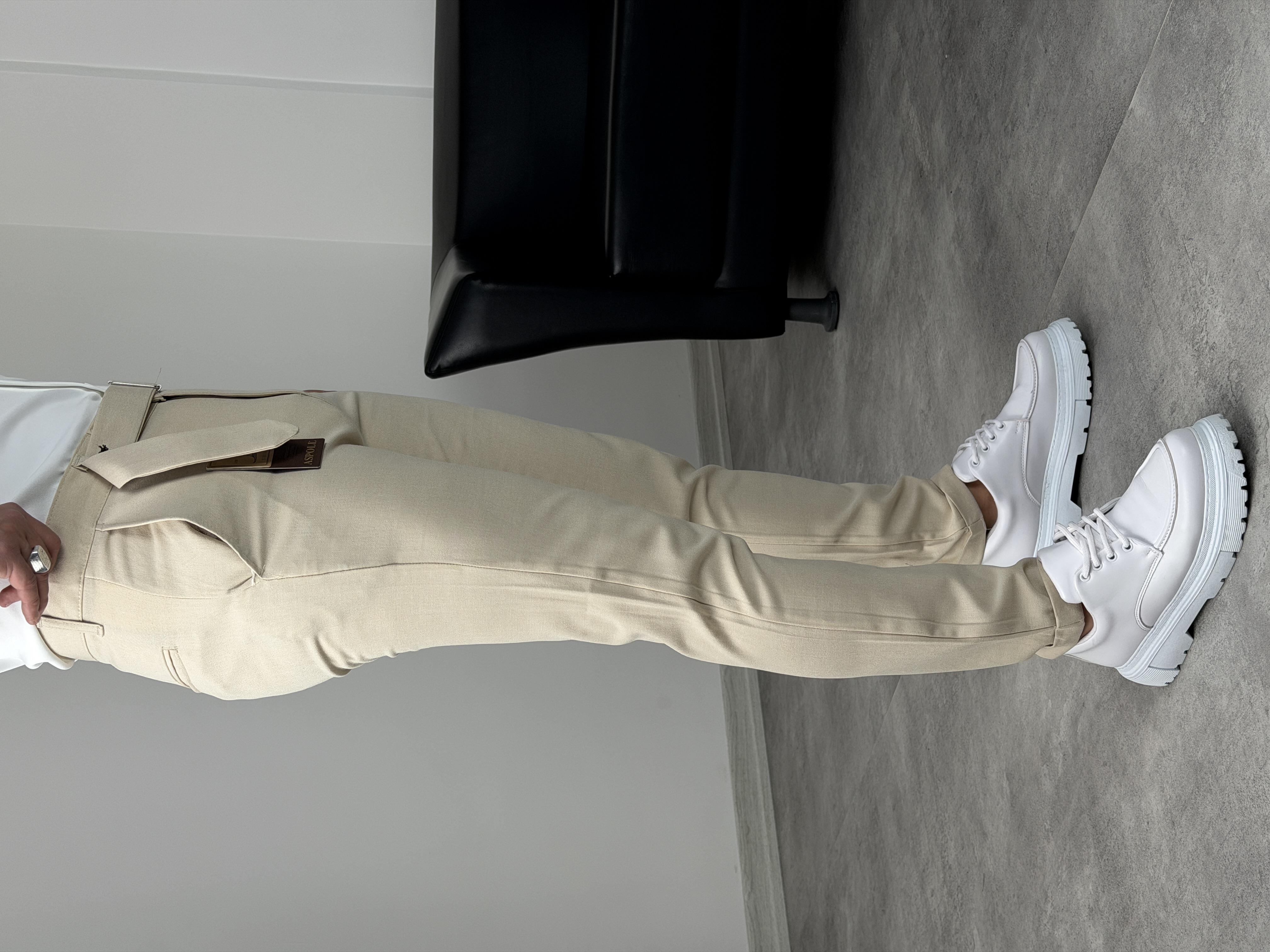 KENDİNDEN KEMERLİ DUBLE PAÇA KUMAŞ PANTOLON KREM