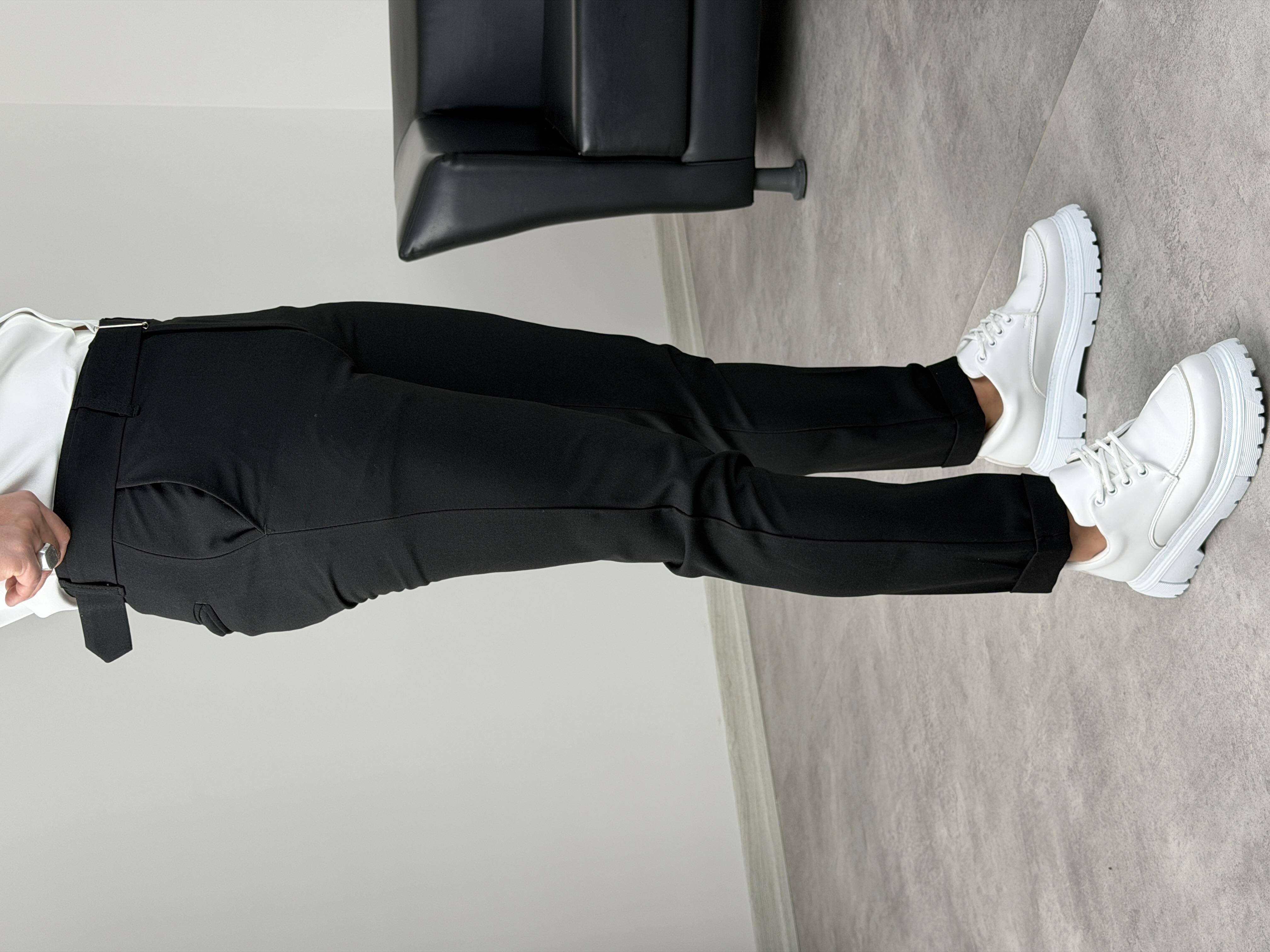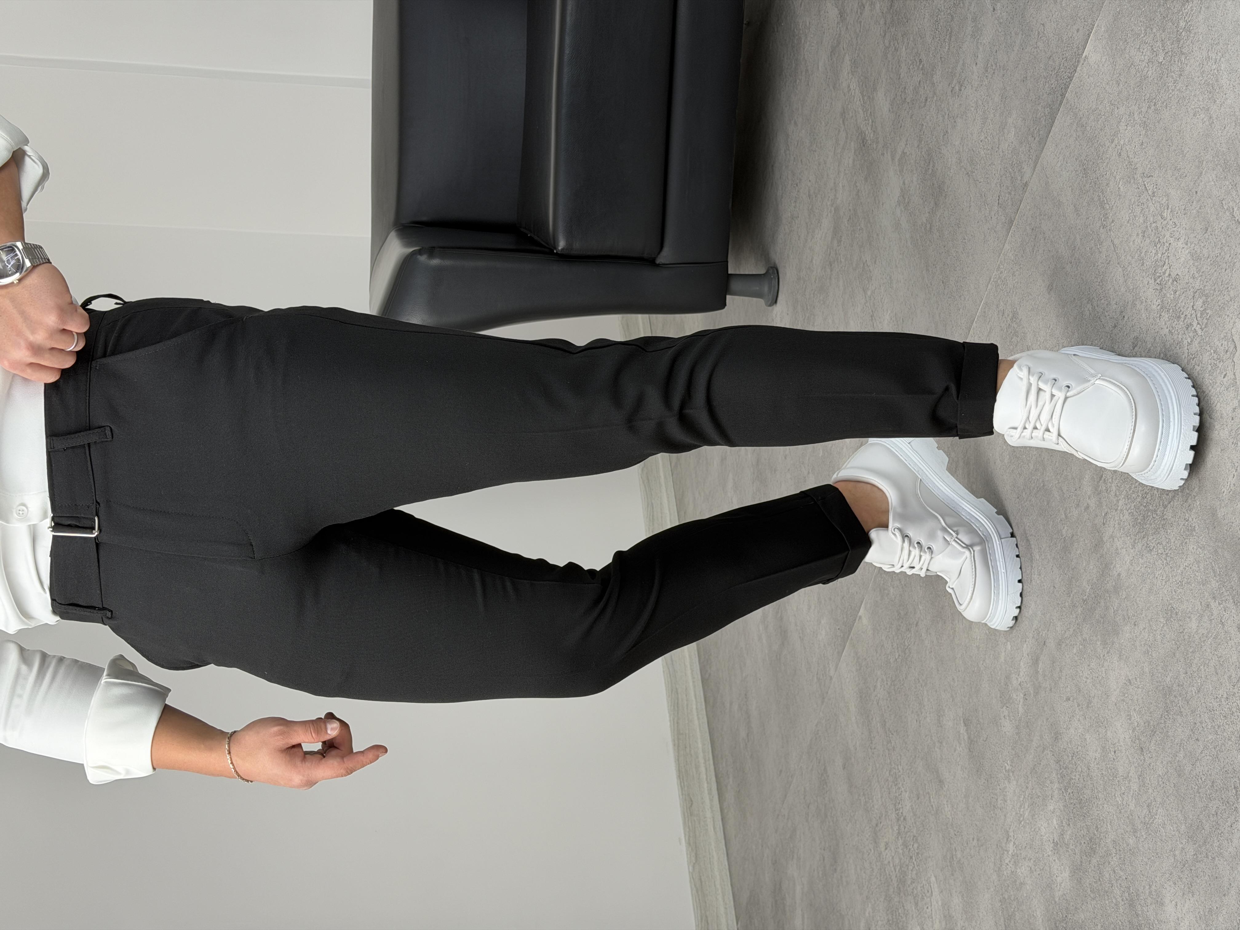 KENDİNDEN KEMERLİ DUBLE PAÇA KUMAŞ PANTOLON SİYAH