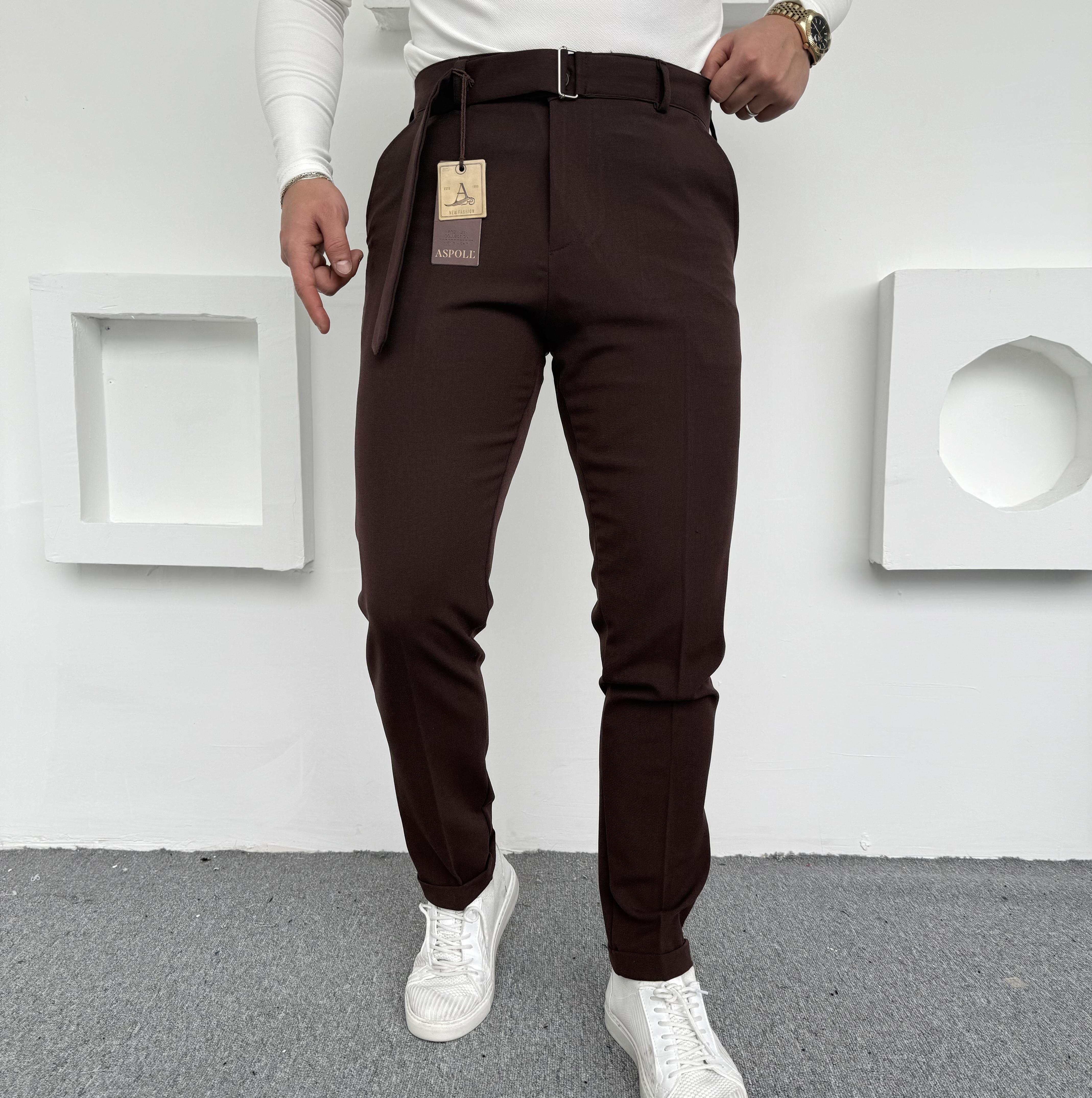 Kendinden Kemerli Premium Kumaş Pantolon Acı Kahve