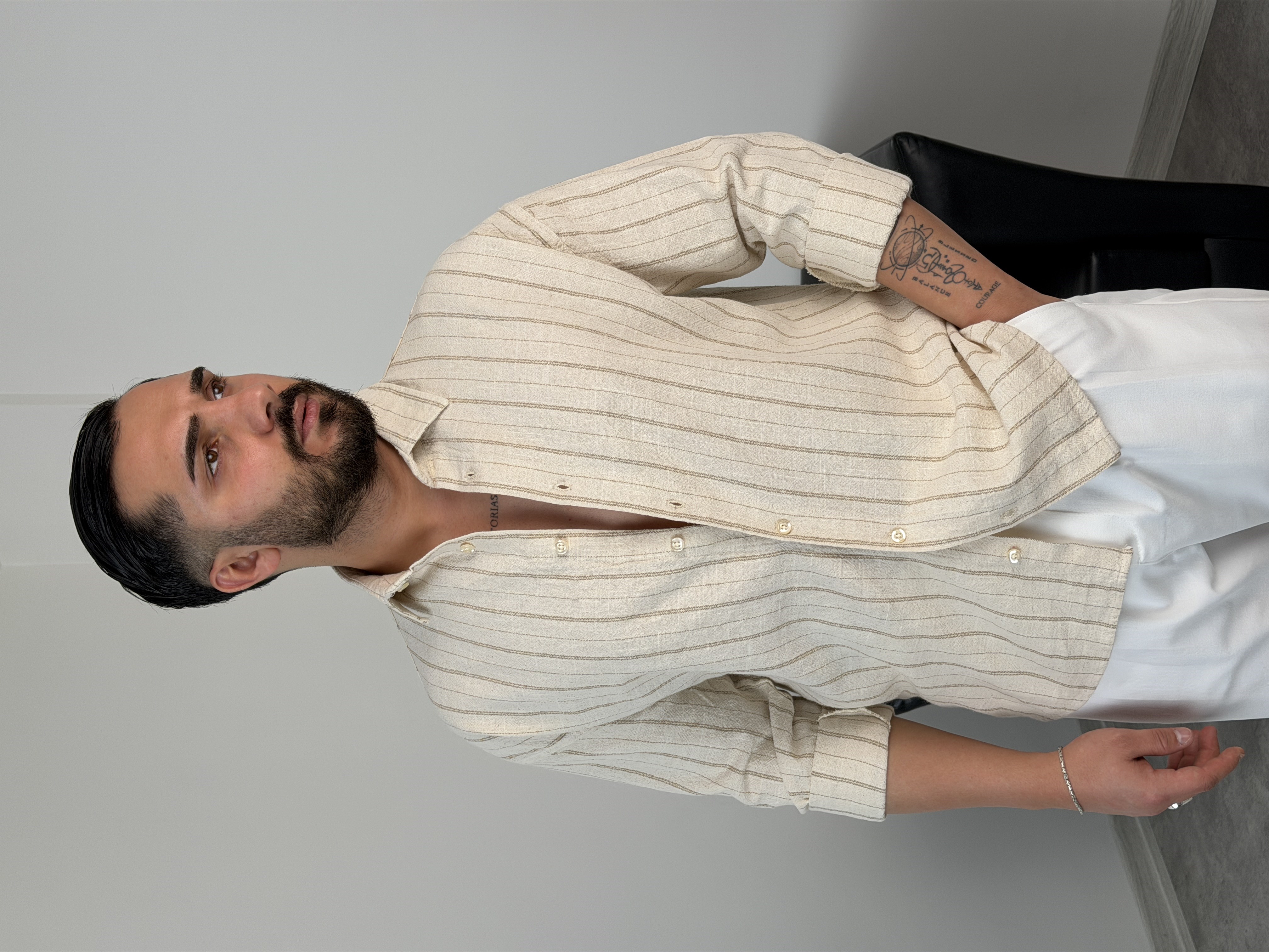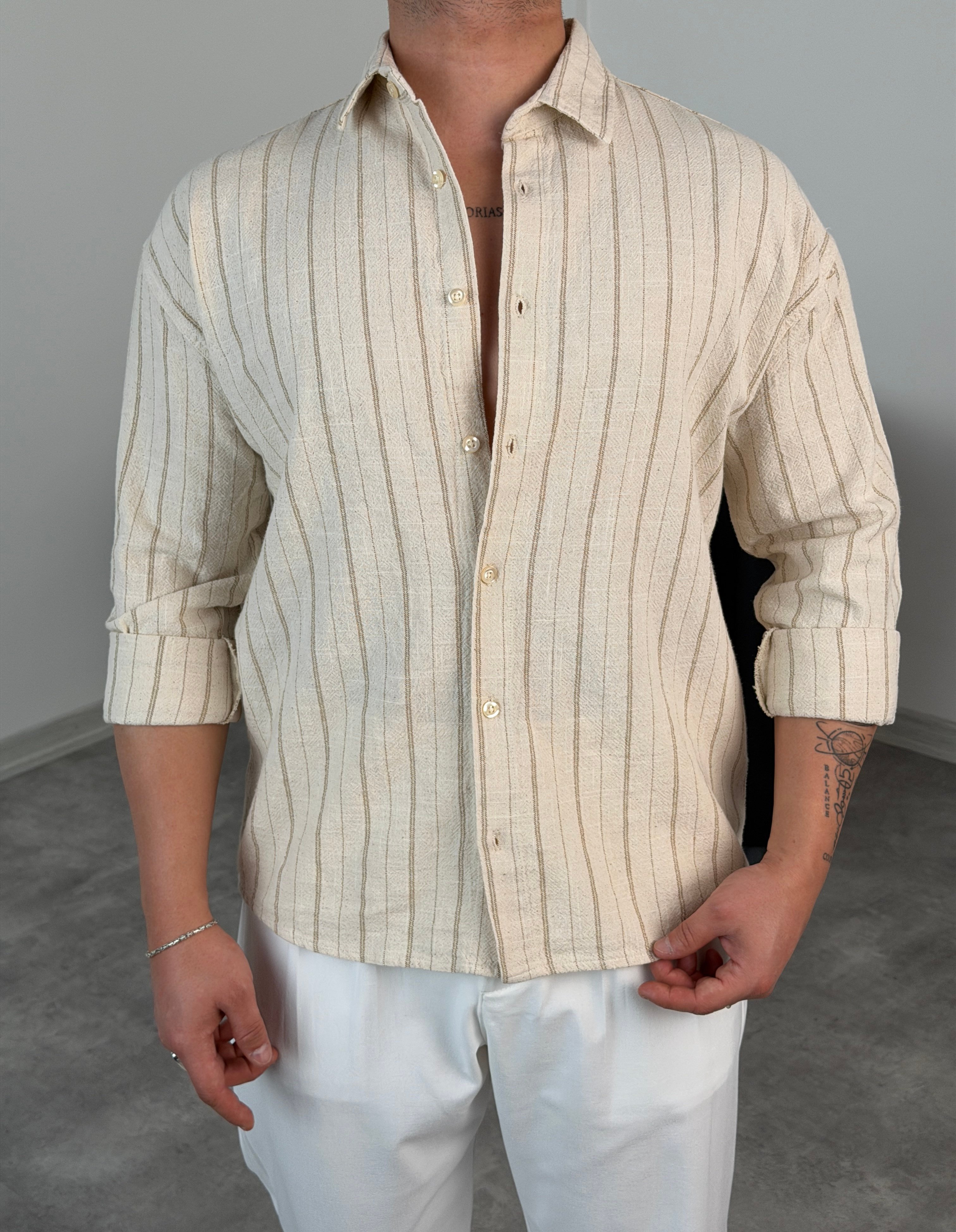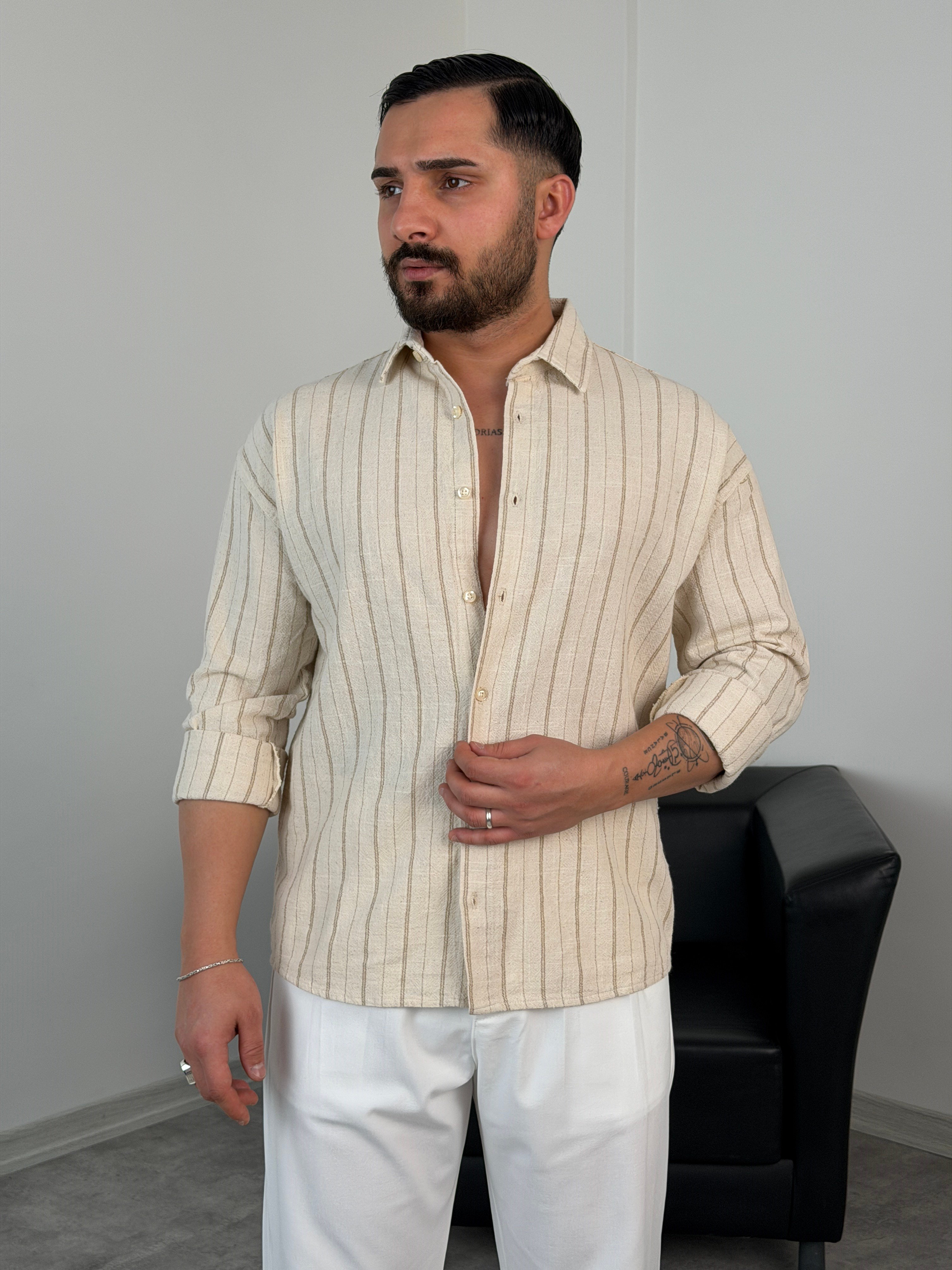 MASS HAM KETEN ÇİZGİLİ UZUNKOL GÖMLEK BEJ