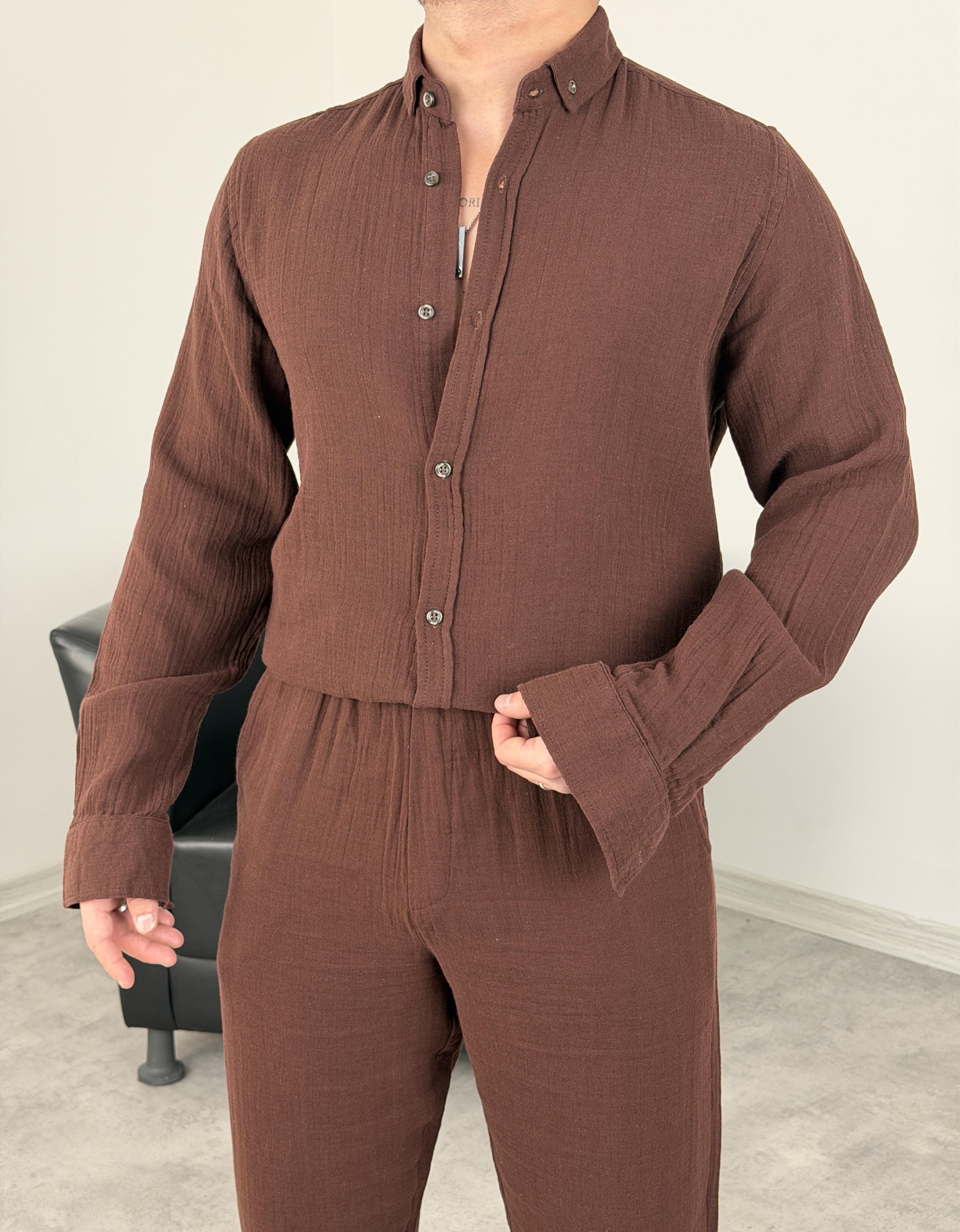 MÜSLİN KUMAŞ YIKAMALI UZUNKOL GÖMLEK ACI KAHVE