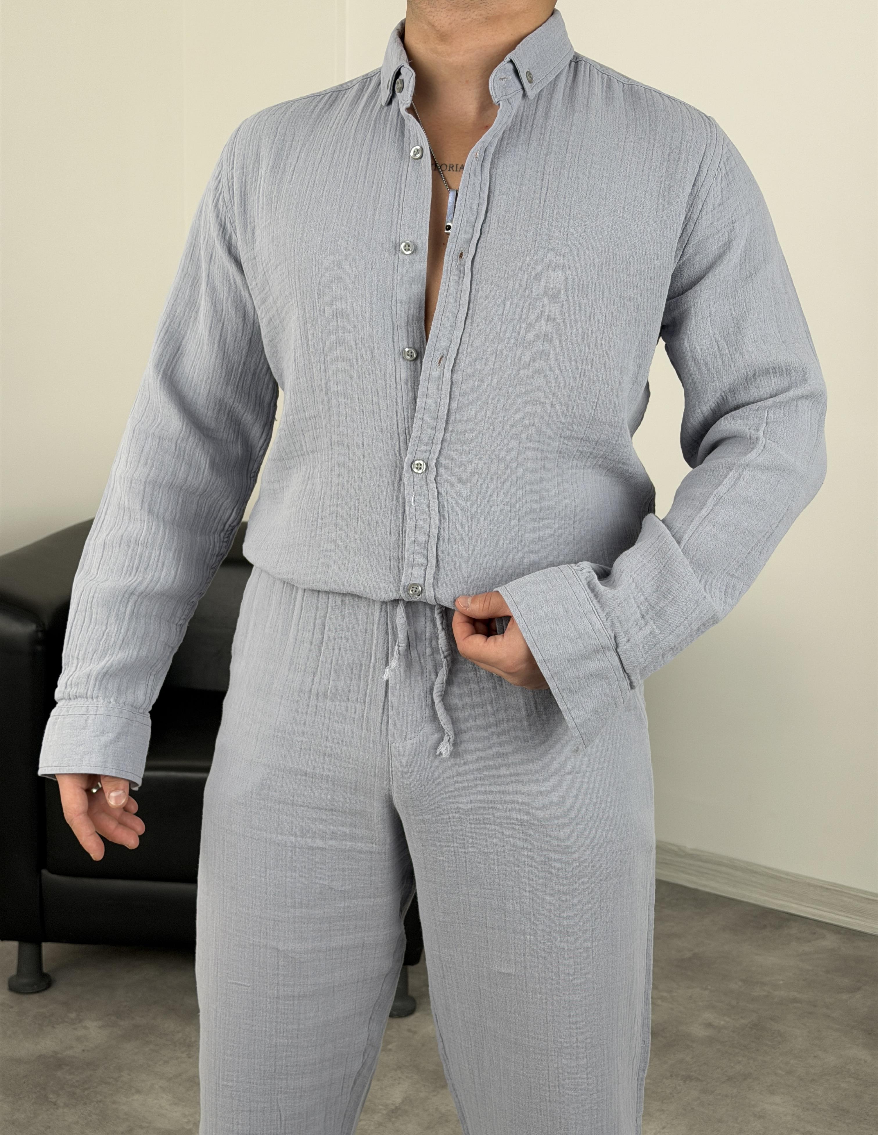 MÜSLİN KUMAŞ YIKAMALI UZUNKOL GÖMLEK GRİ