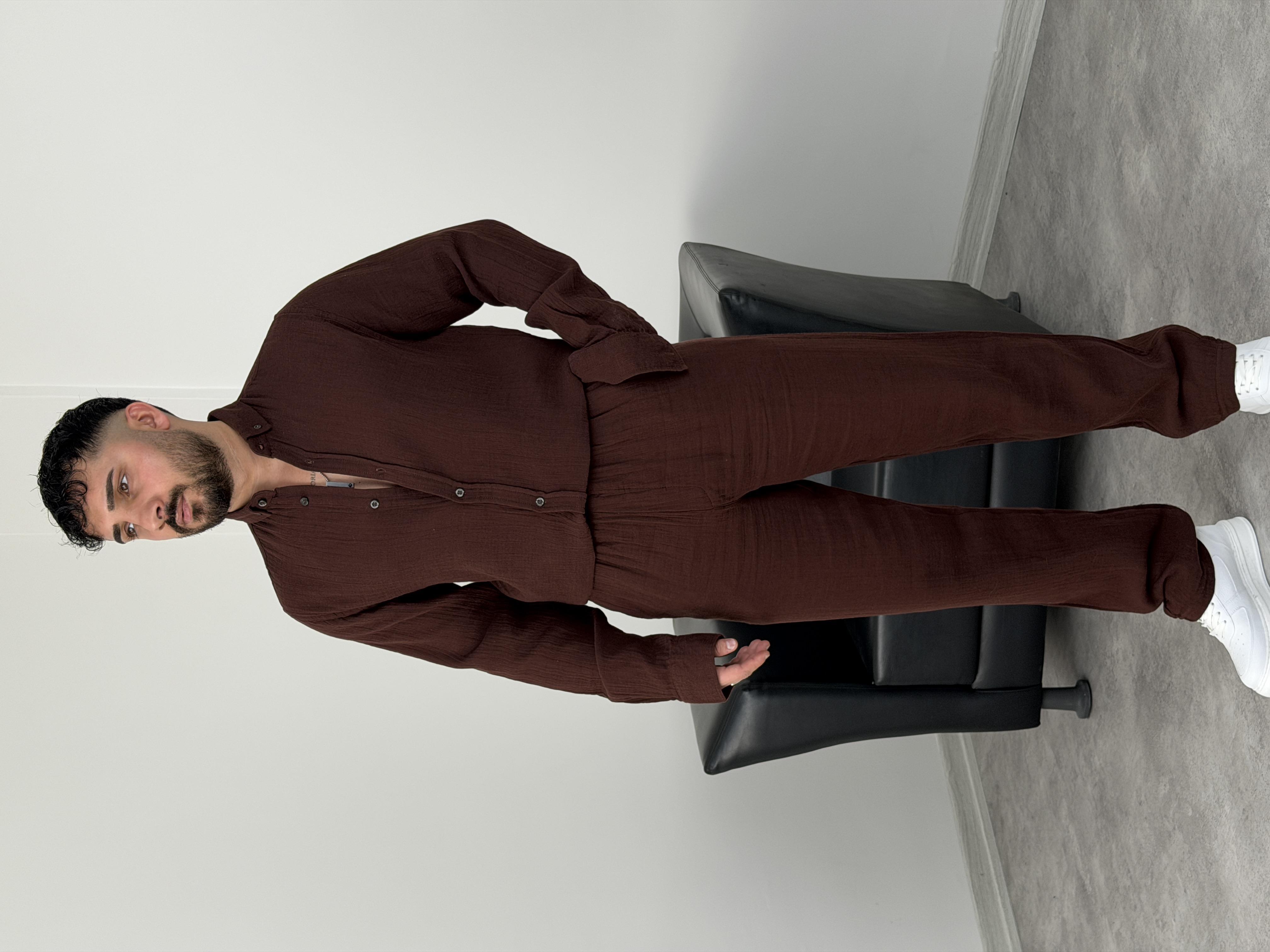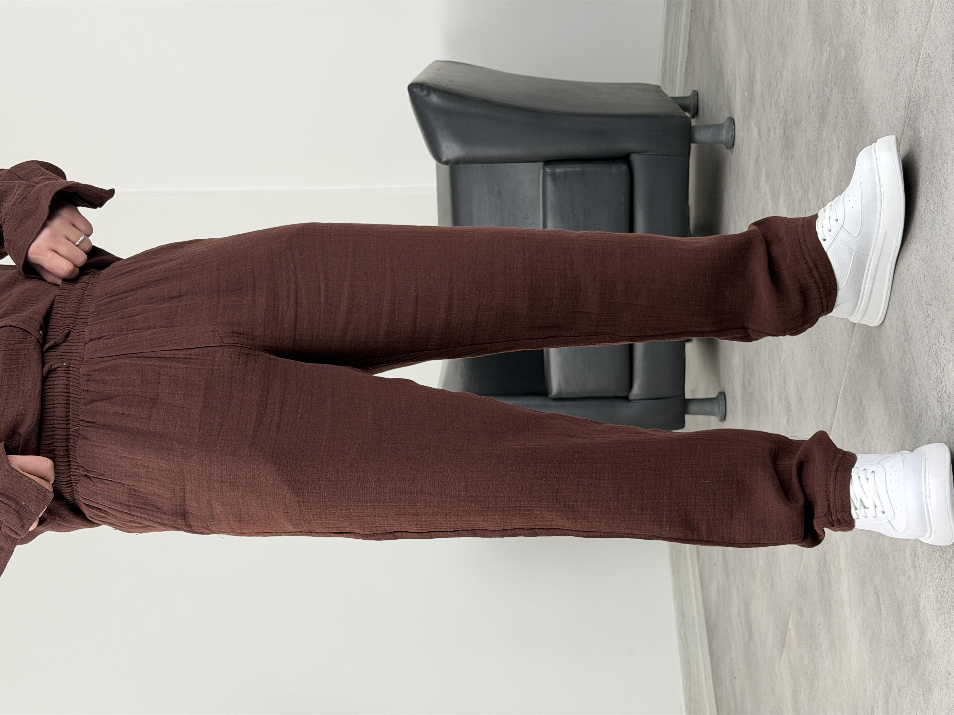MÜSLİN KUMAŞ YIKAMALI UZUNKOL PANTOLON ACI KAHVE