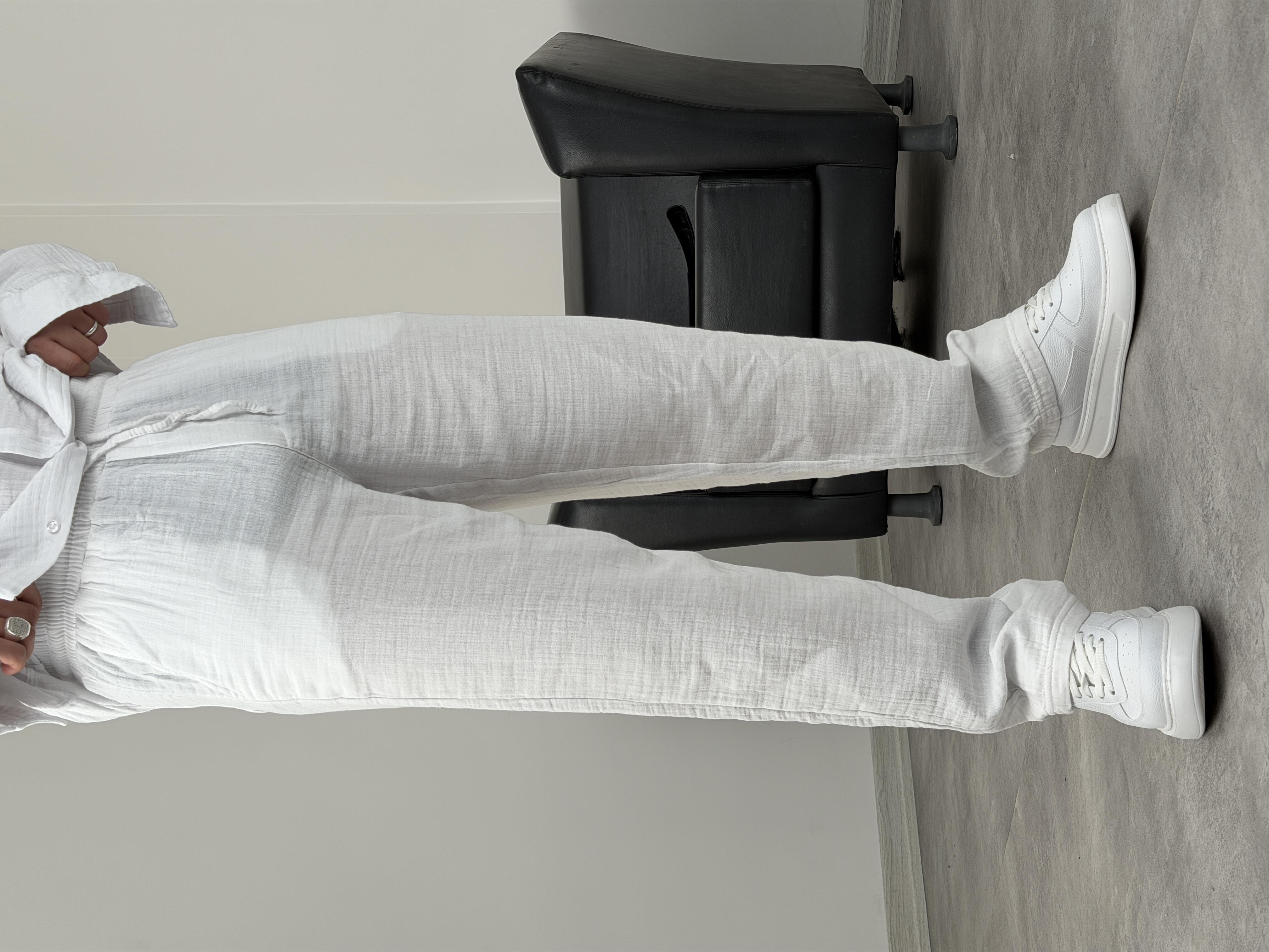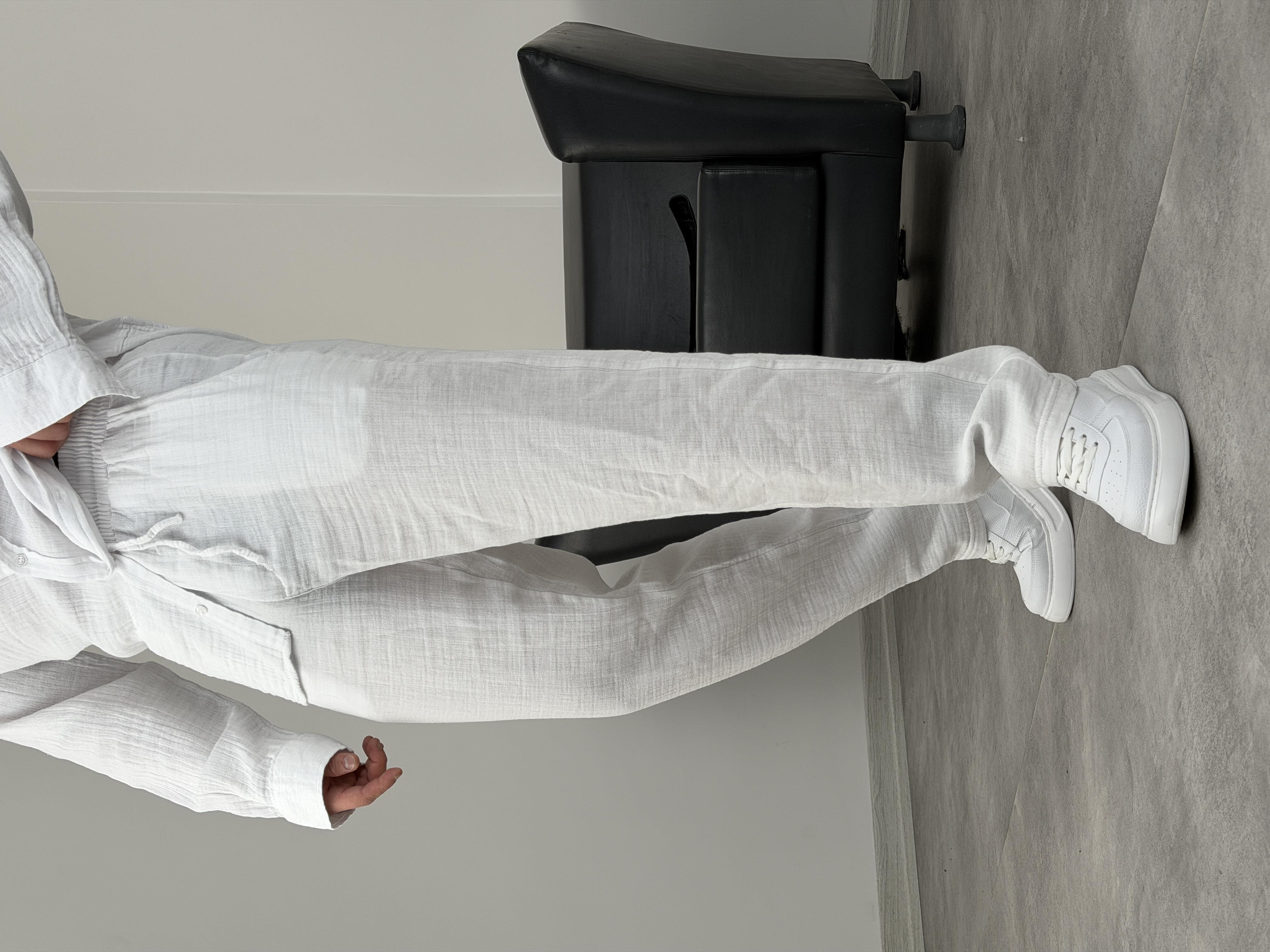 MÜSLİN KUMAŞ YIKAMALI UZUNKOL PANTOLON BEYAZ
