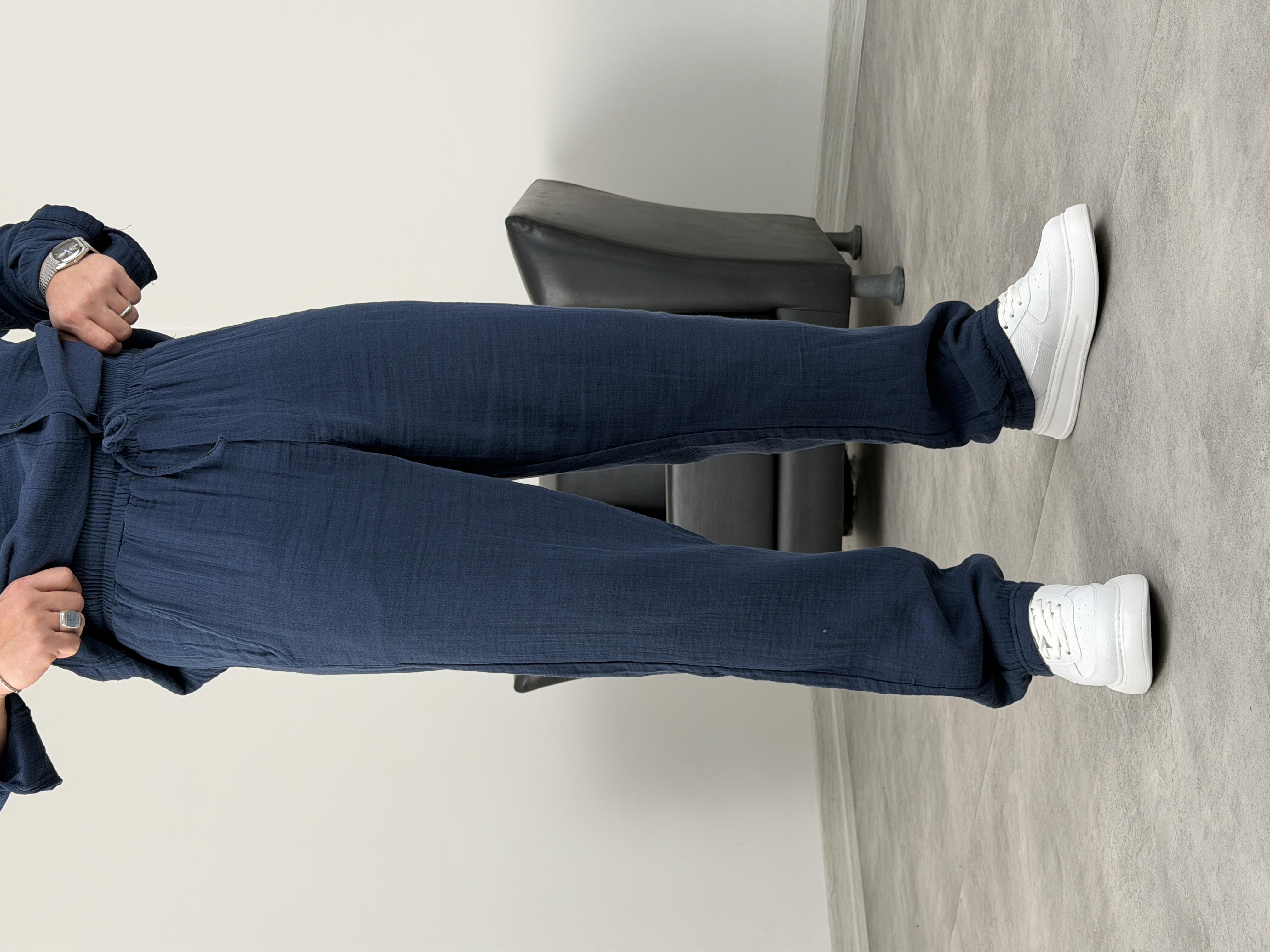 MÜSLİN KUMAŞ YIKAMALI UZUNKOL PANTOLON LACİVERT