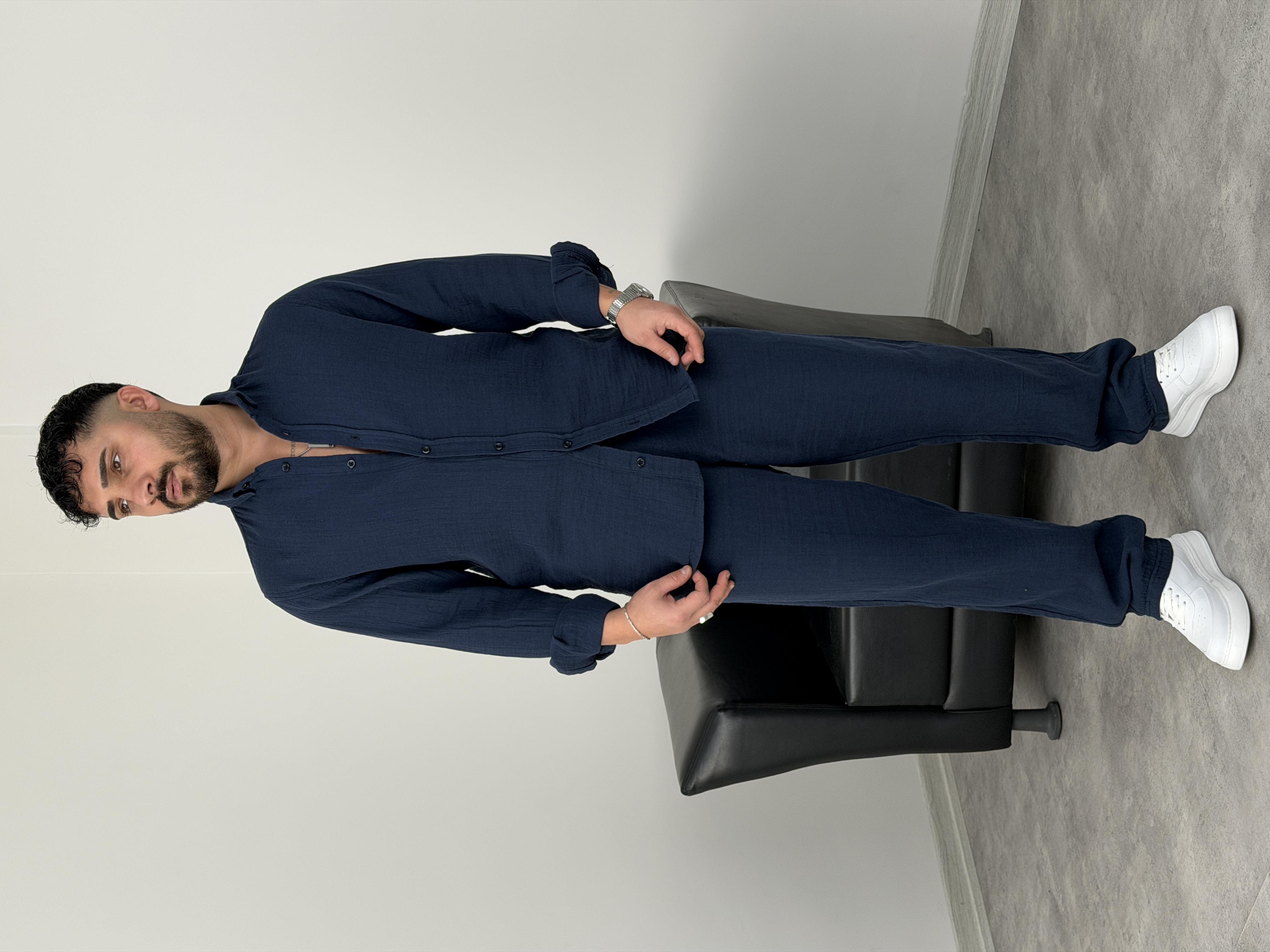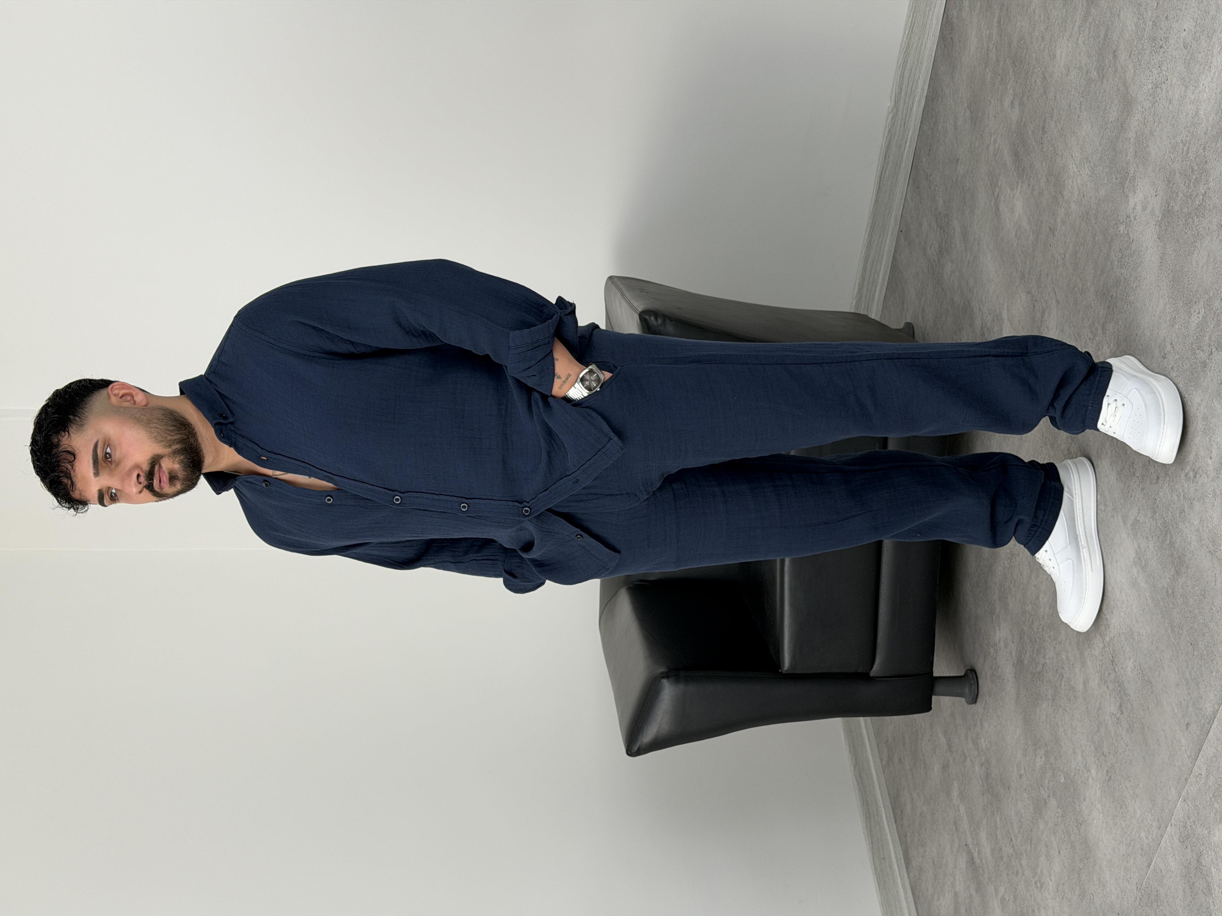 MÜSLİN KUMAŞ YIKAMALI UZUNKOL TAKIM LACİVERT