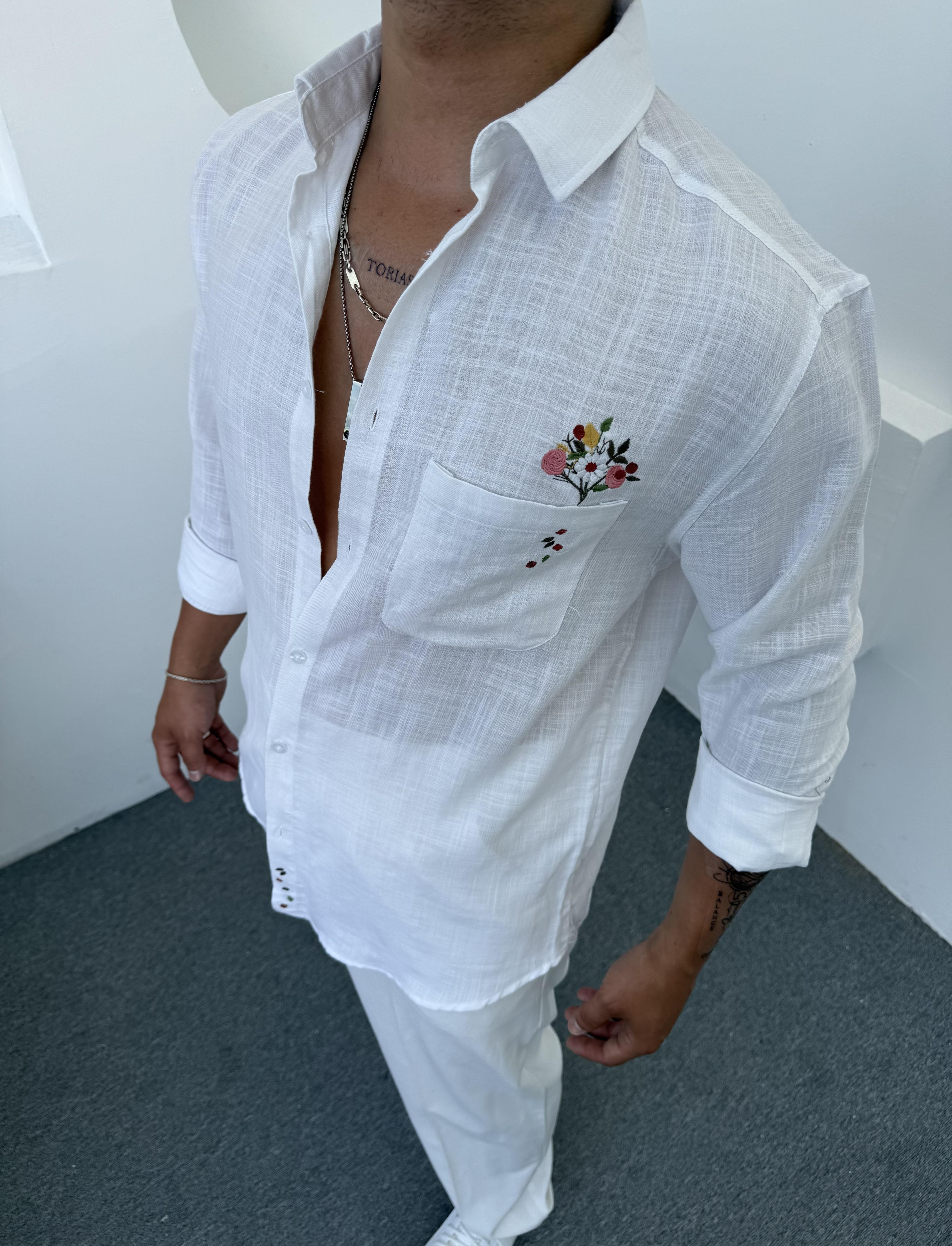 Papatya Desen Keten Gömlek Beyaz