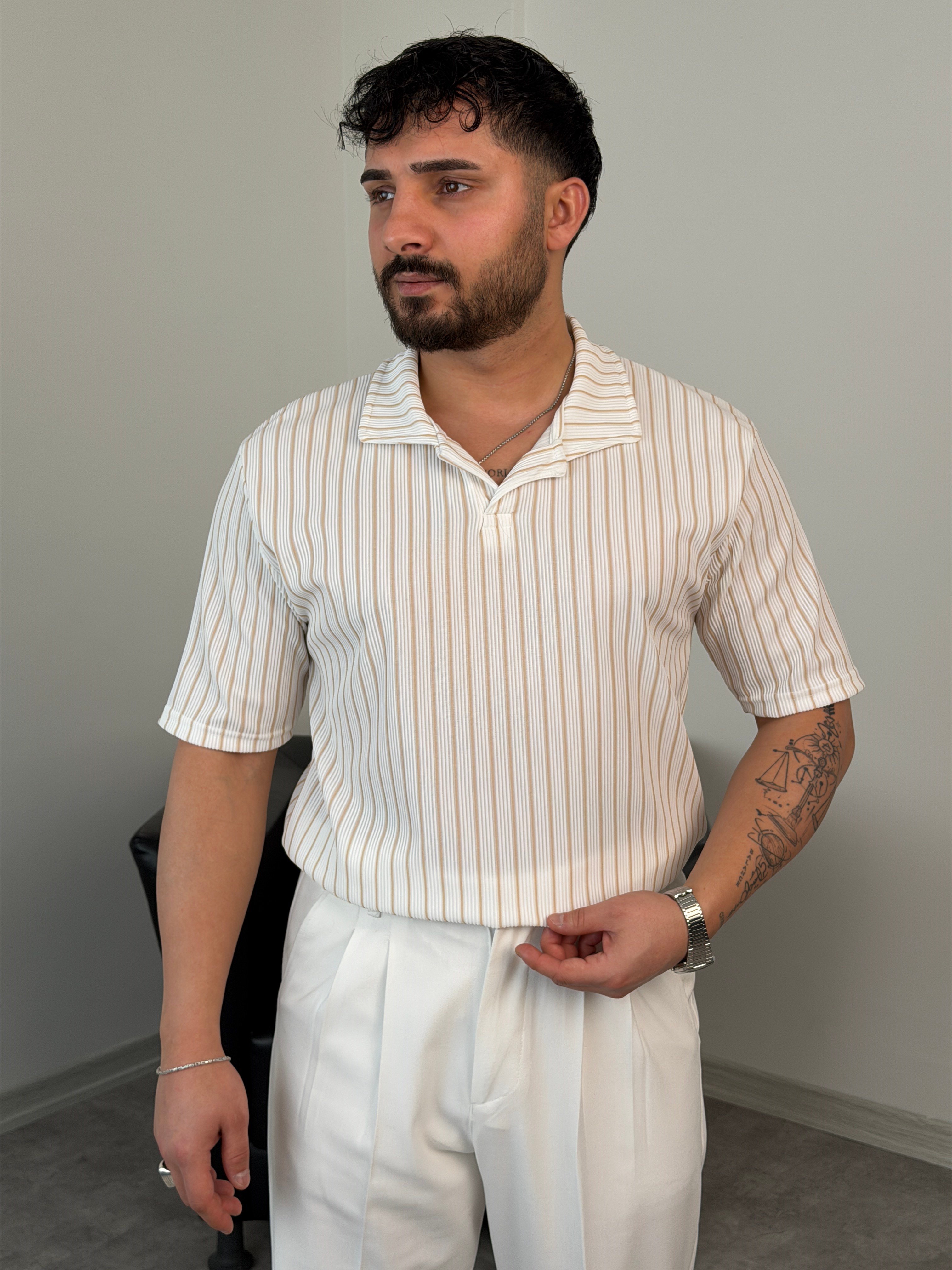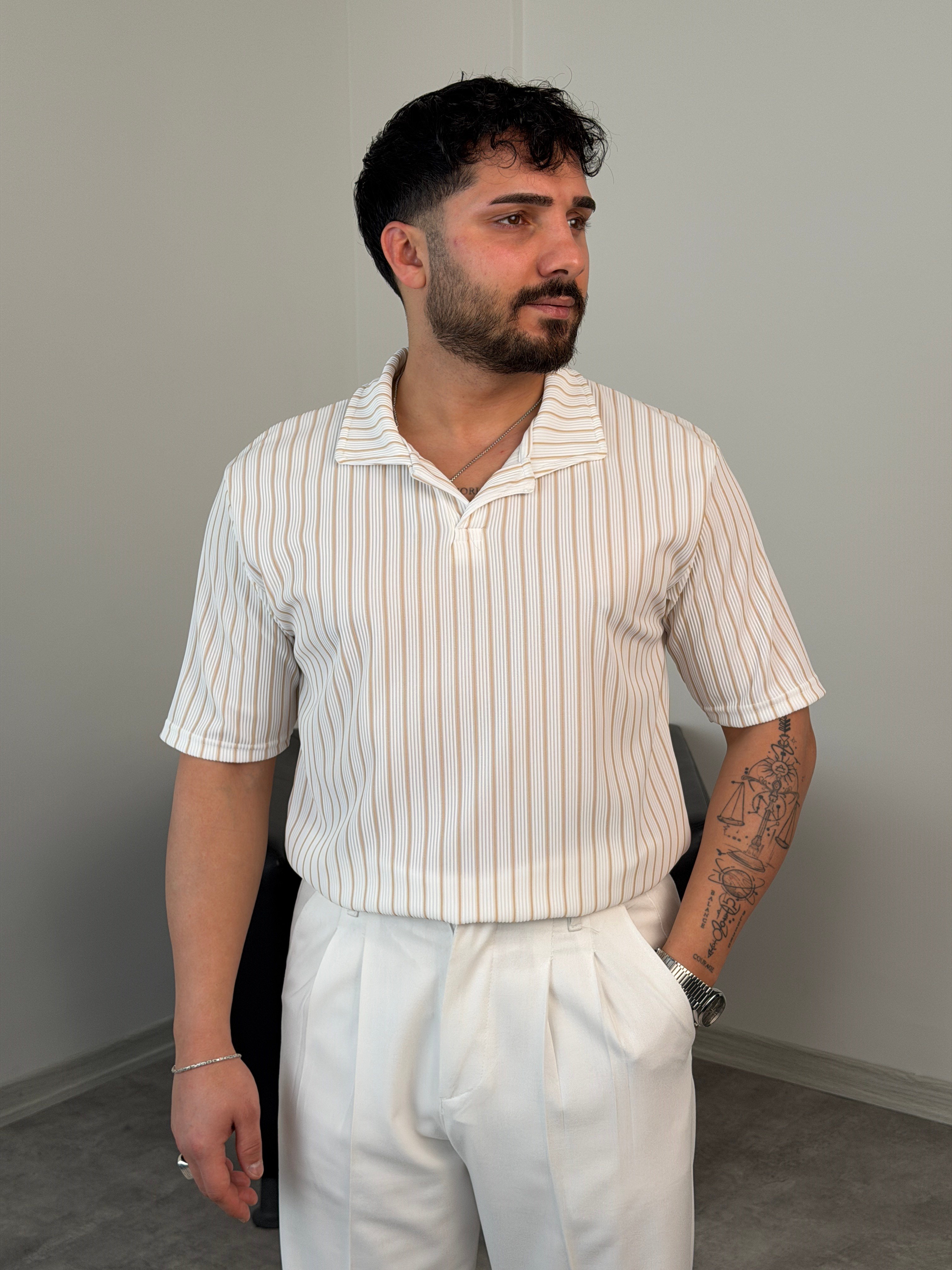 RENKLİ FİTİLLİ POLO YAKA OVERSİZE TİŞÖRT BEJ