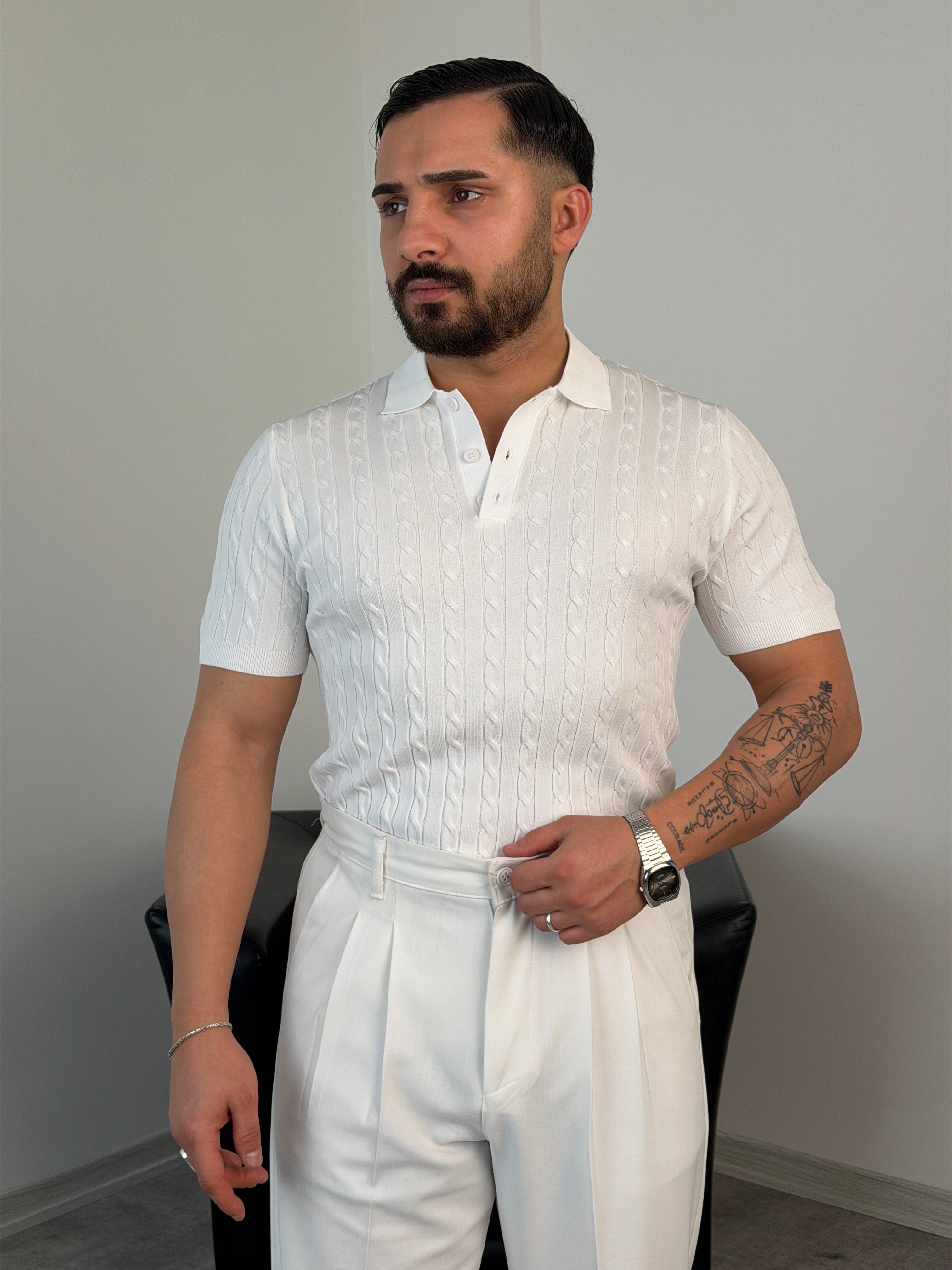 SAÇ ÖRGÜ POLO YAKA DÜĞMELİ TRİKO TİŞÖRT BEYAZ