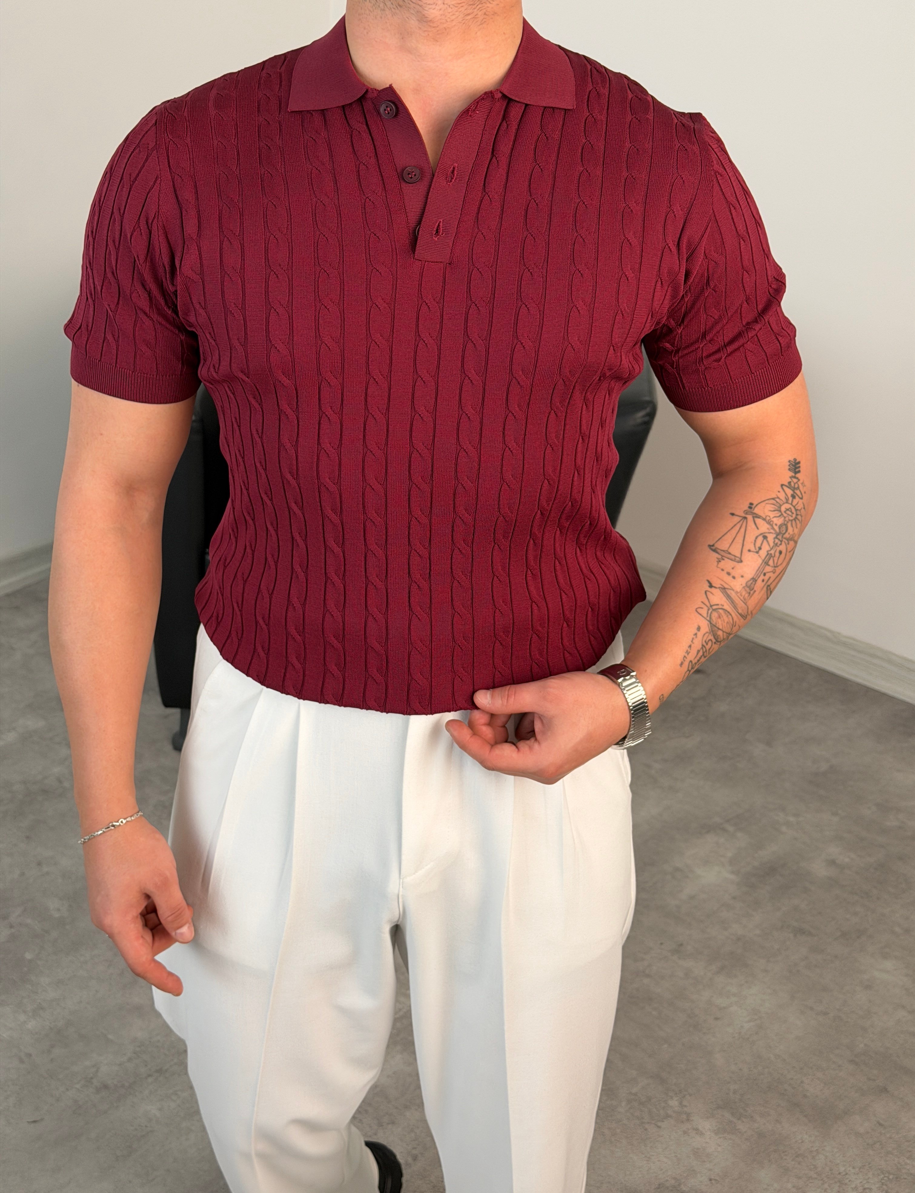 SAÇ ÖRGÜ POLO YAKA DÜĞMELİ TRİKO TİŞÖRT MÜRDÜM