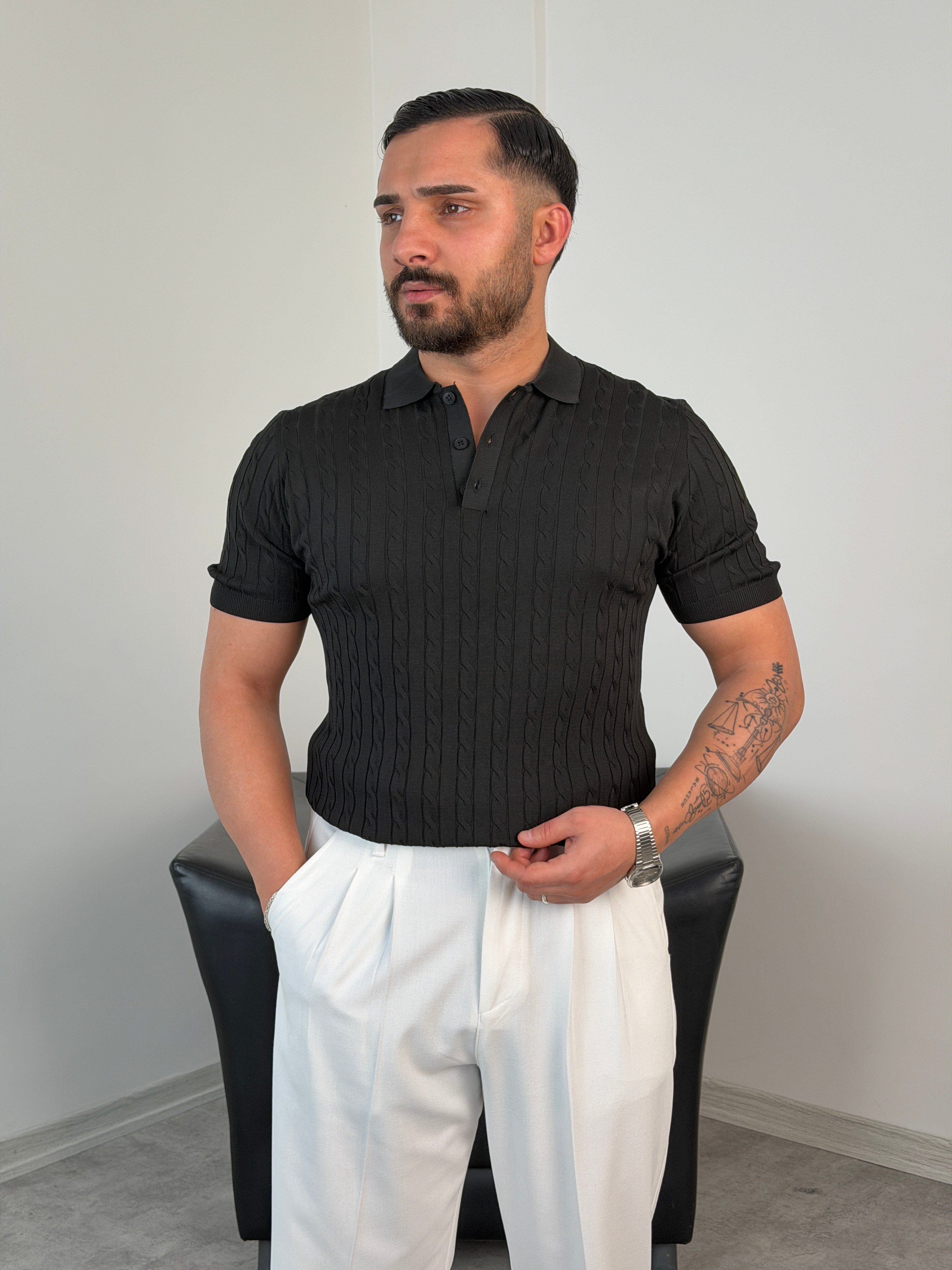 SAÇ ÖRGÜ POLO YAKA DÜĞMELİ TRİKO TİŞÖRT SİYAH