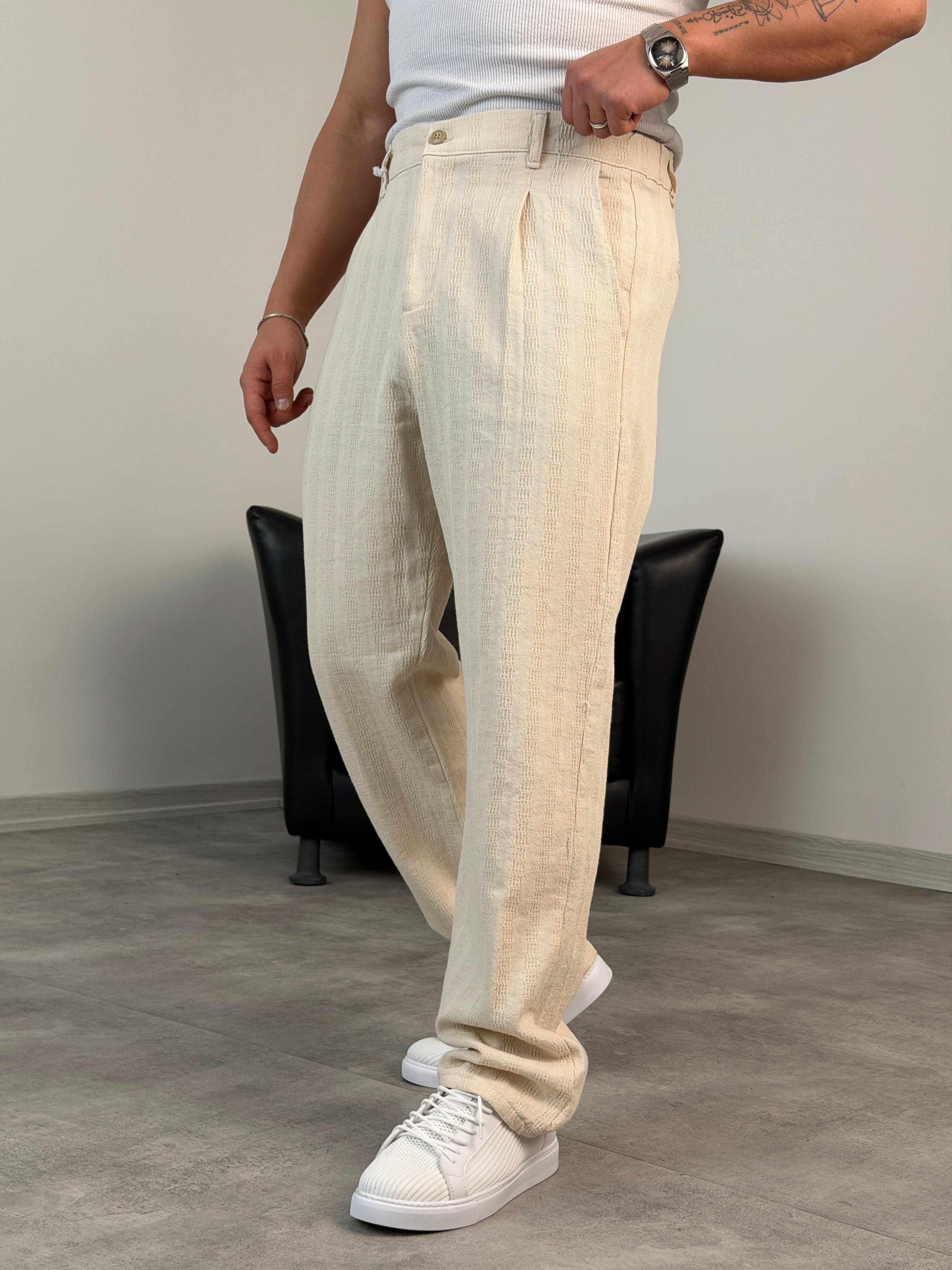 ŞERİT DETAYLI %100 KETEN BAGGY PANTOLON BEJ