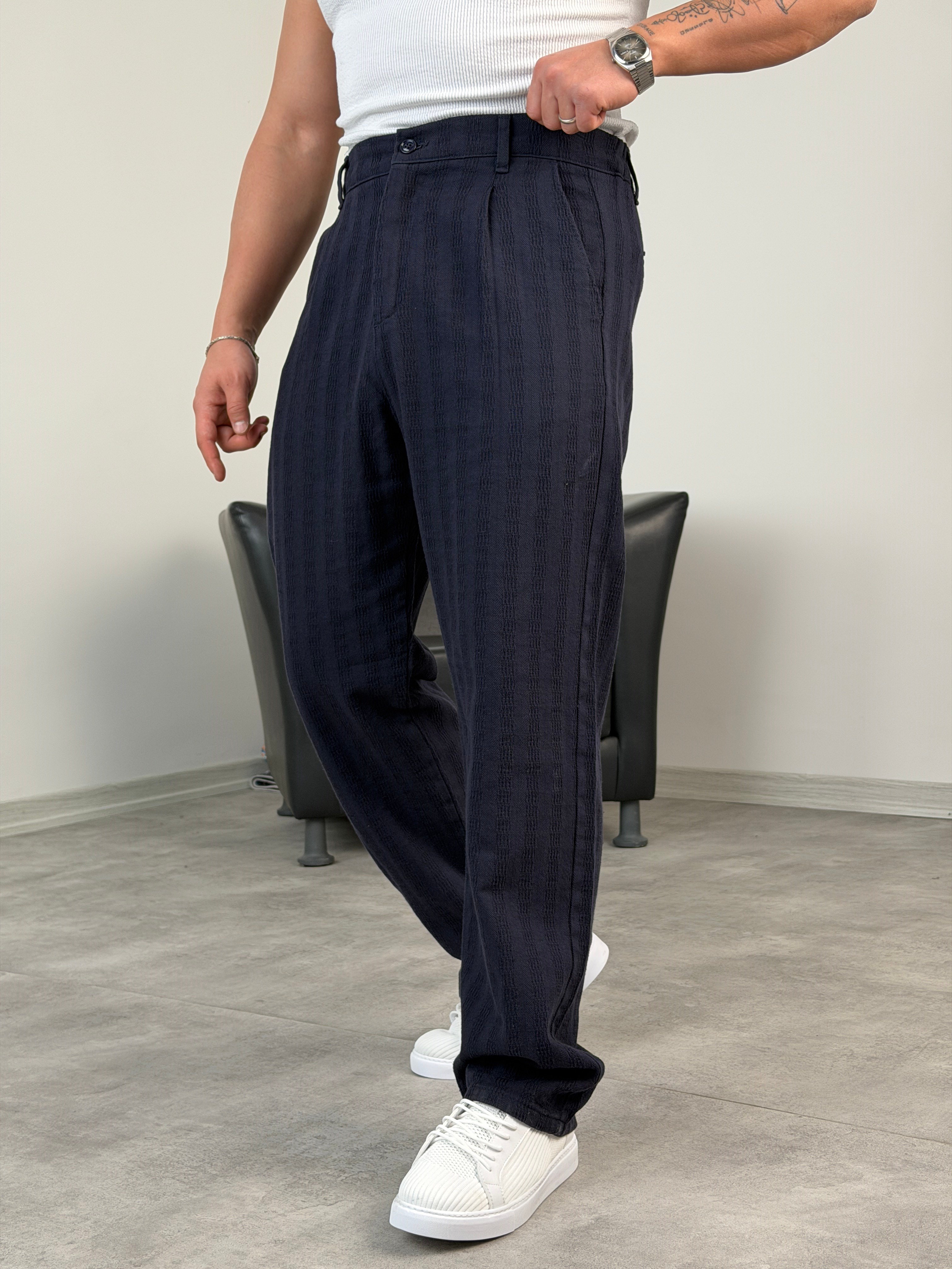ŞERİT DETAYLI %100 KETEN BAGGY PANTOLON LACİVERT
