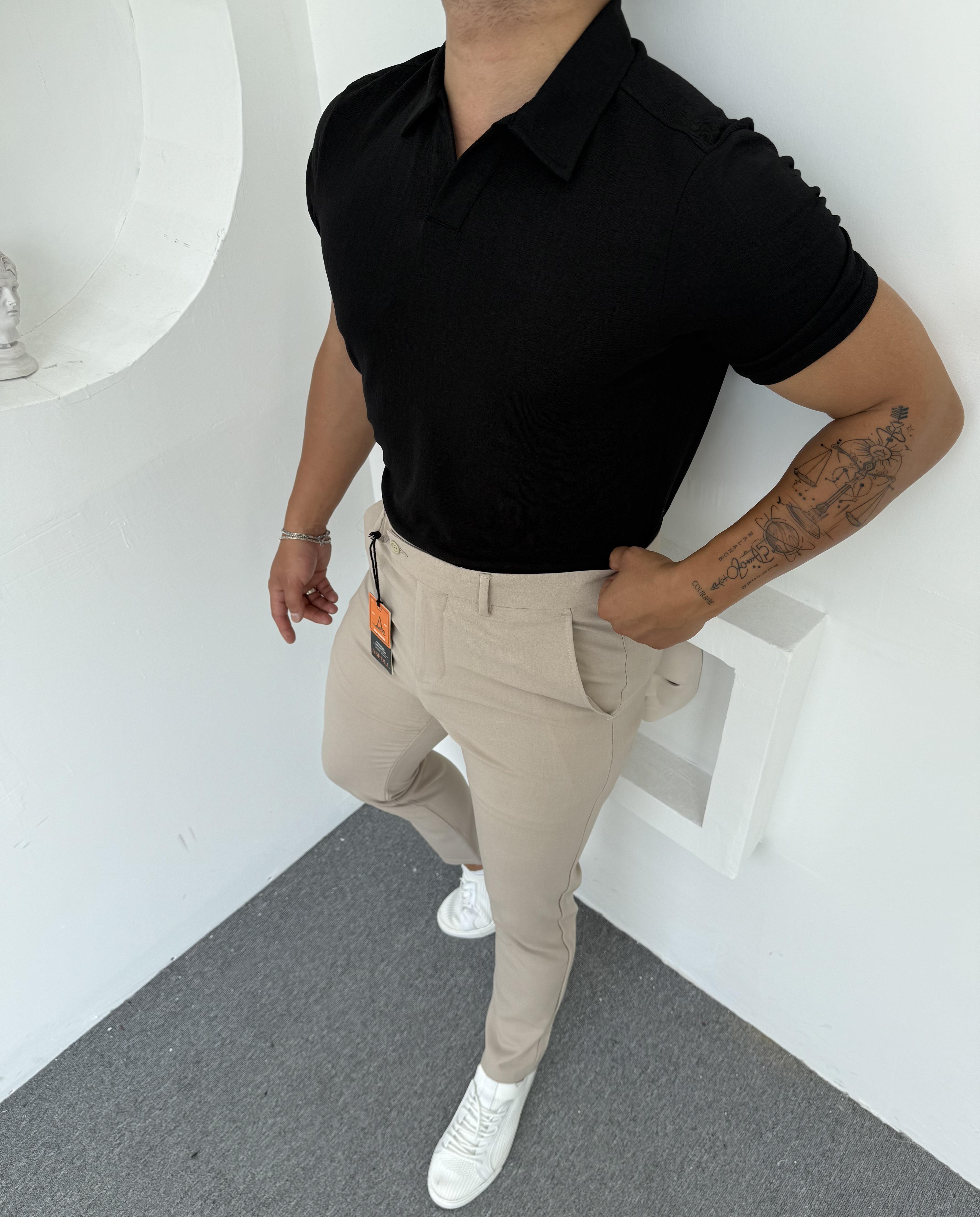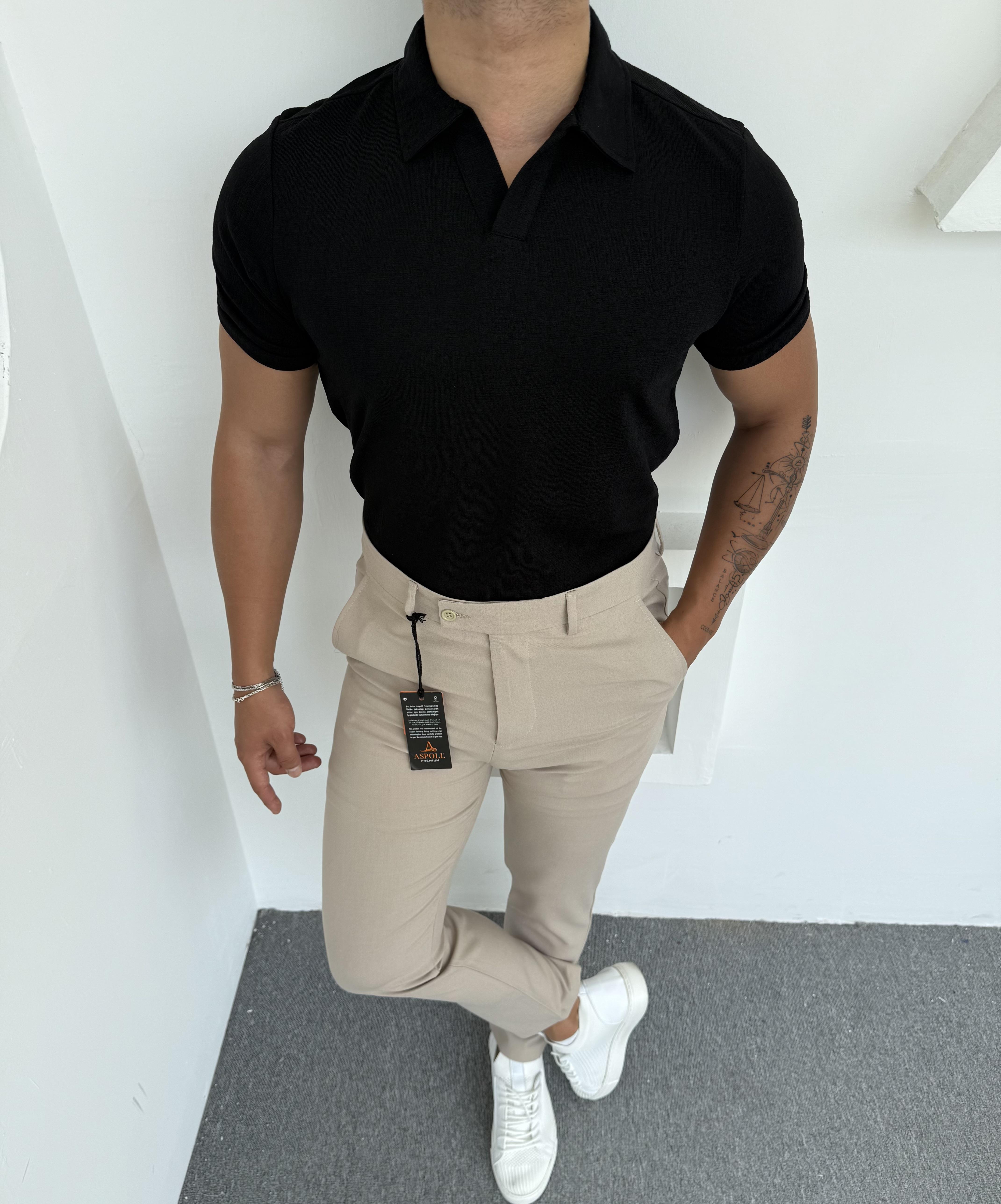 Siyah Polo Yaka Tişört , Krem Dil Detay Pantolon