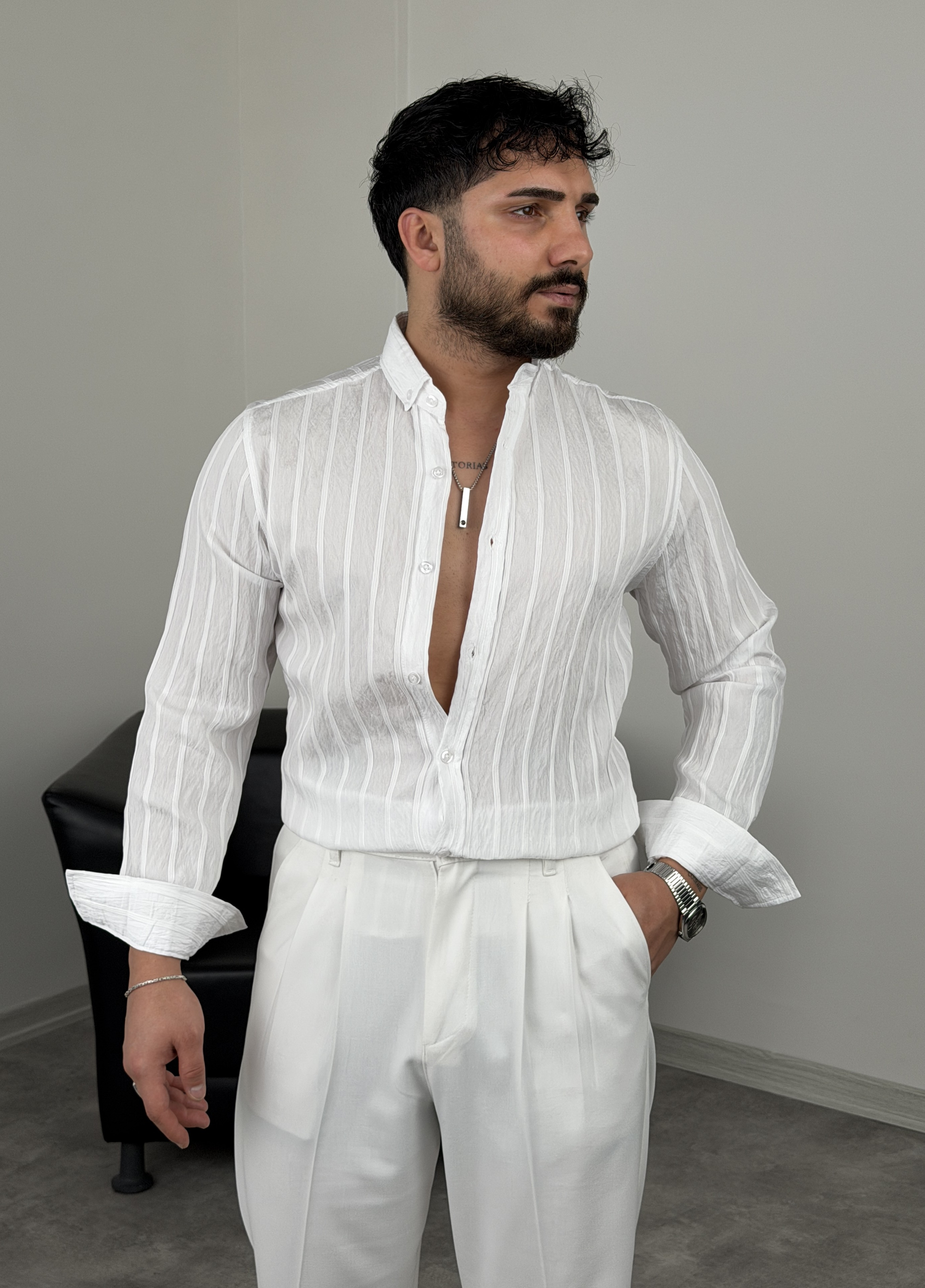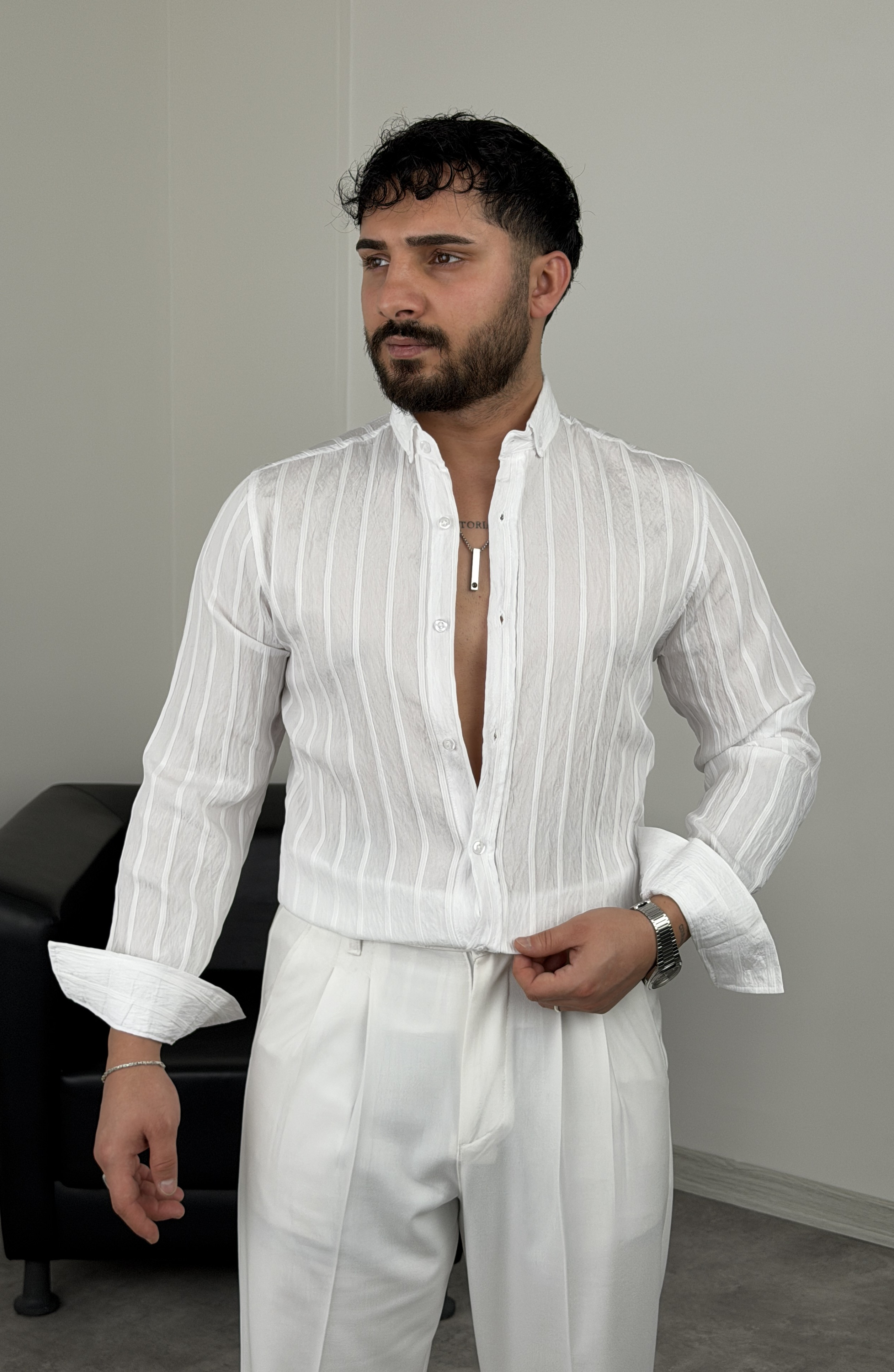 TENSEL KUMAŞ SLİMFİT KALIN ÇİZGİLİ UZUNKOL GÖMLEK BEYAZ