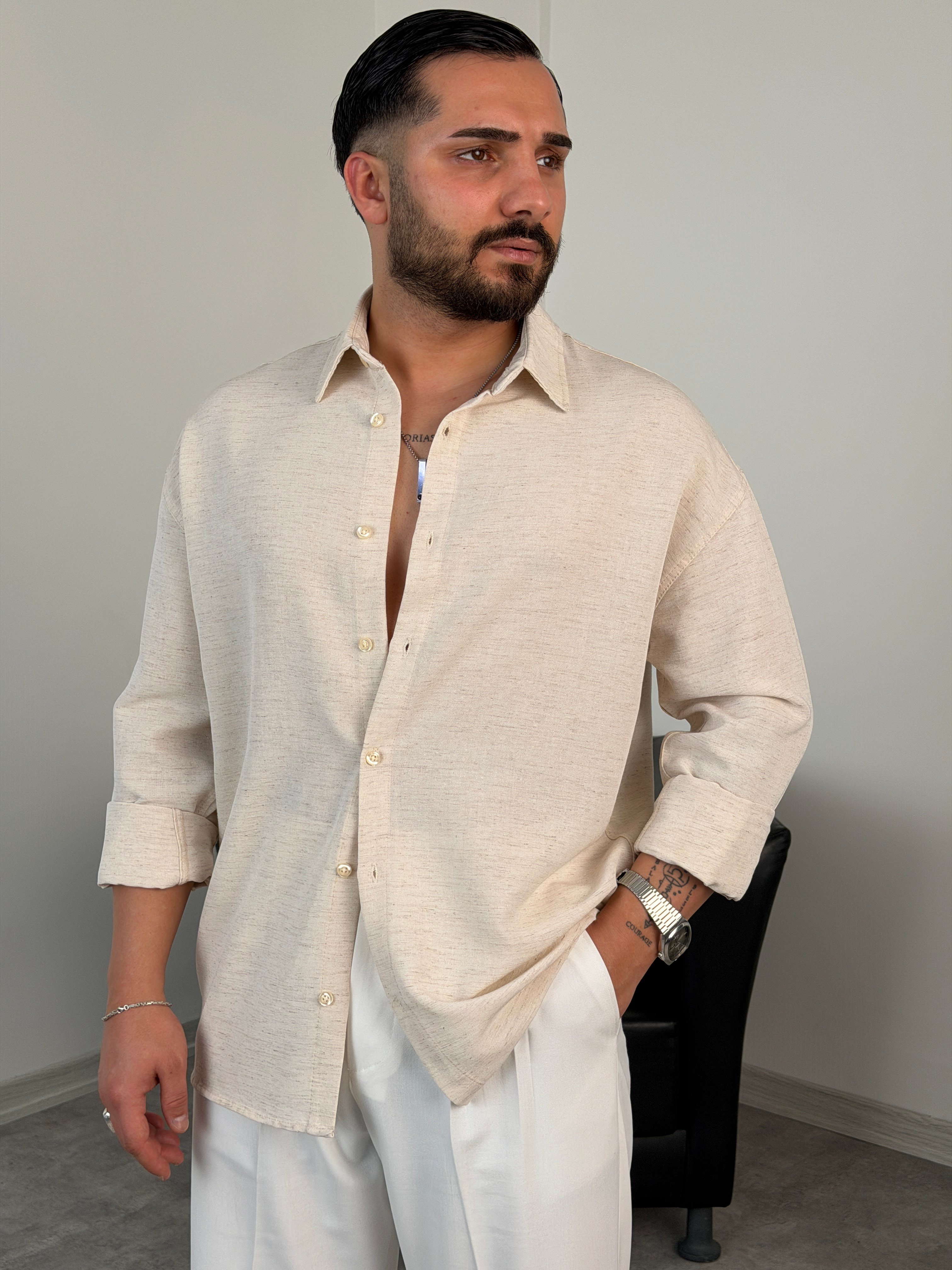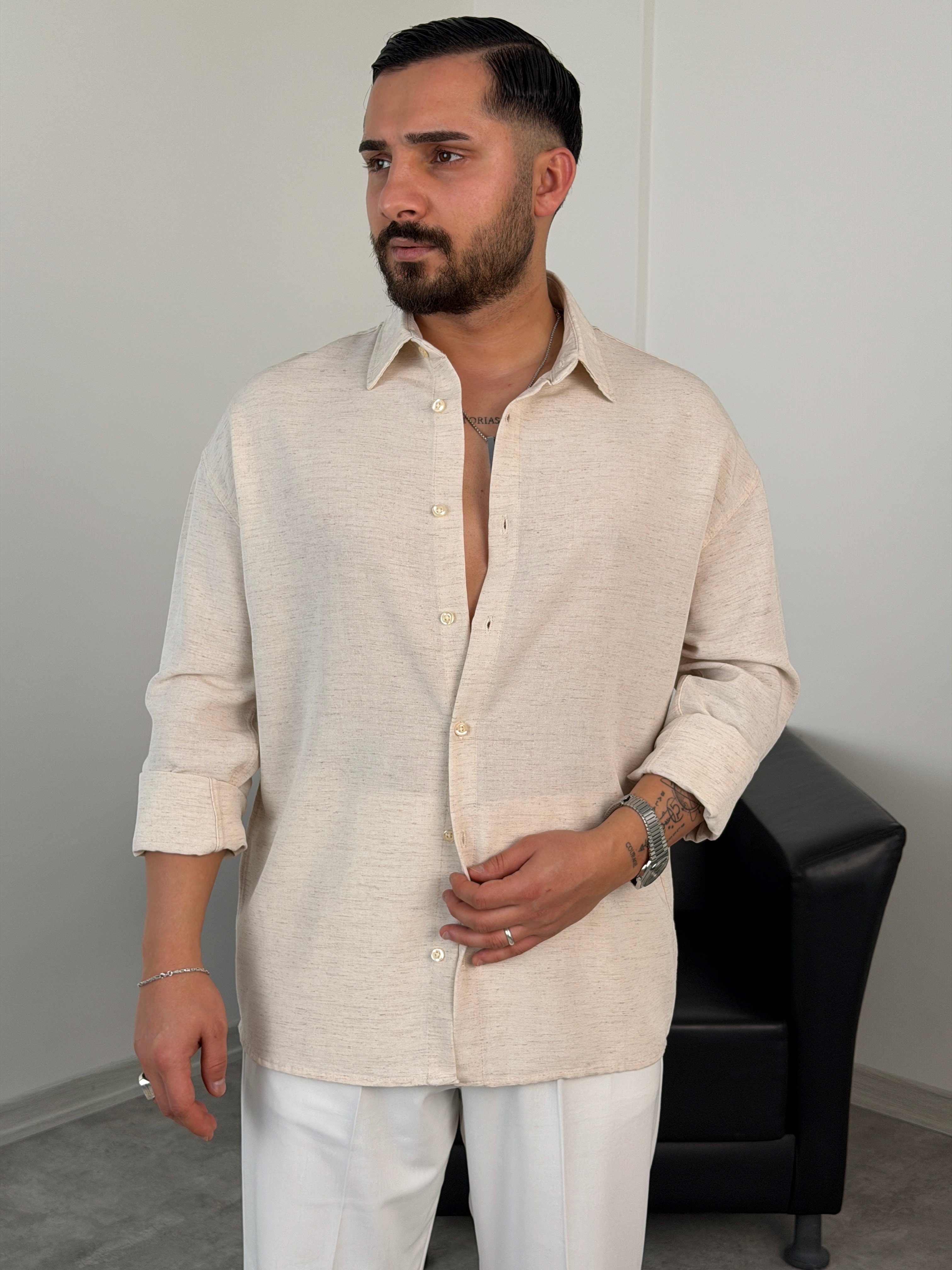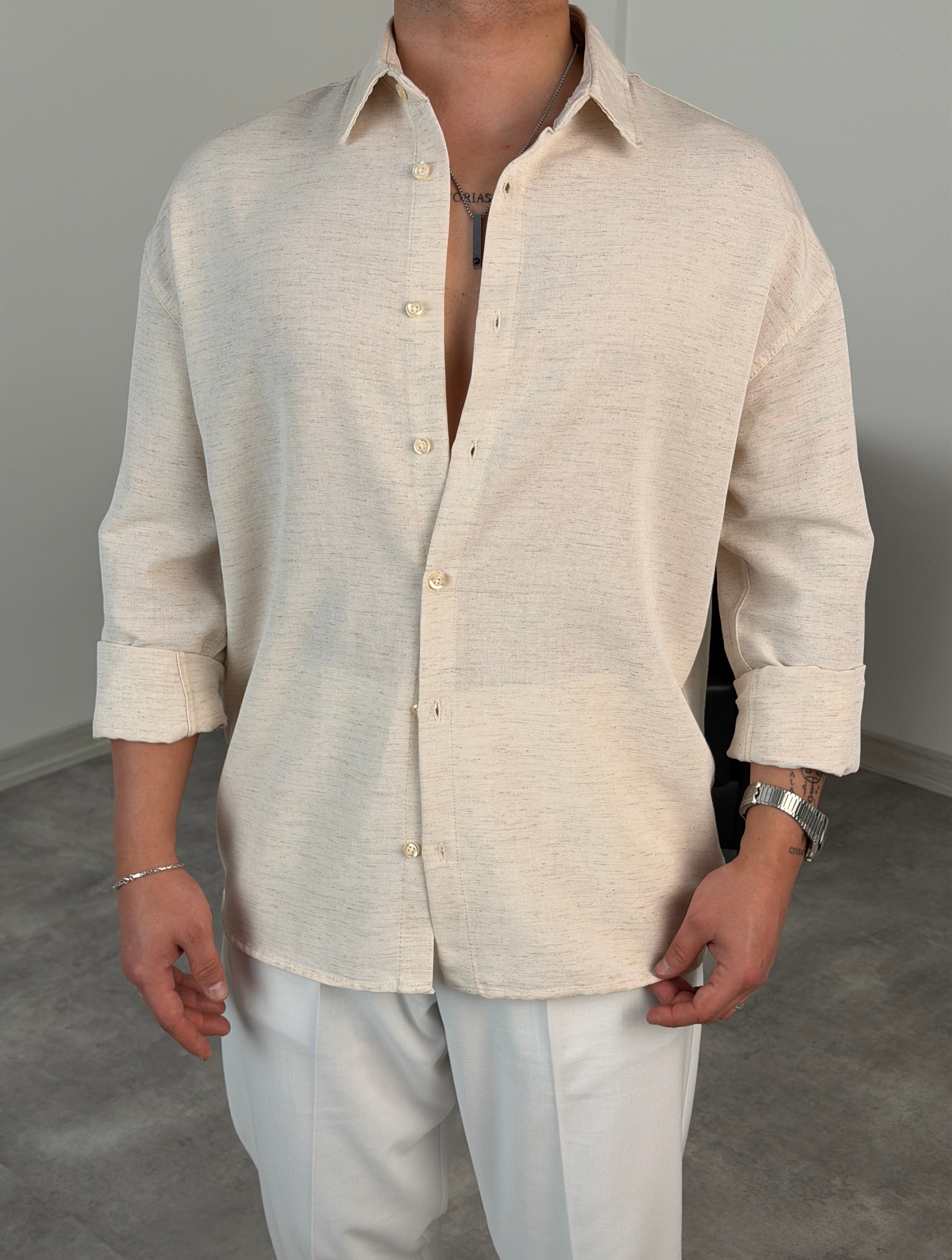 VK %100 UZUNKOL KETEN GÖMLEK KIRÇILLI BEYAZ