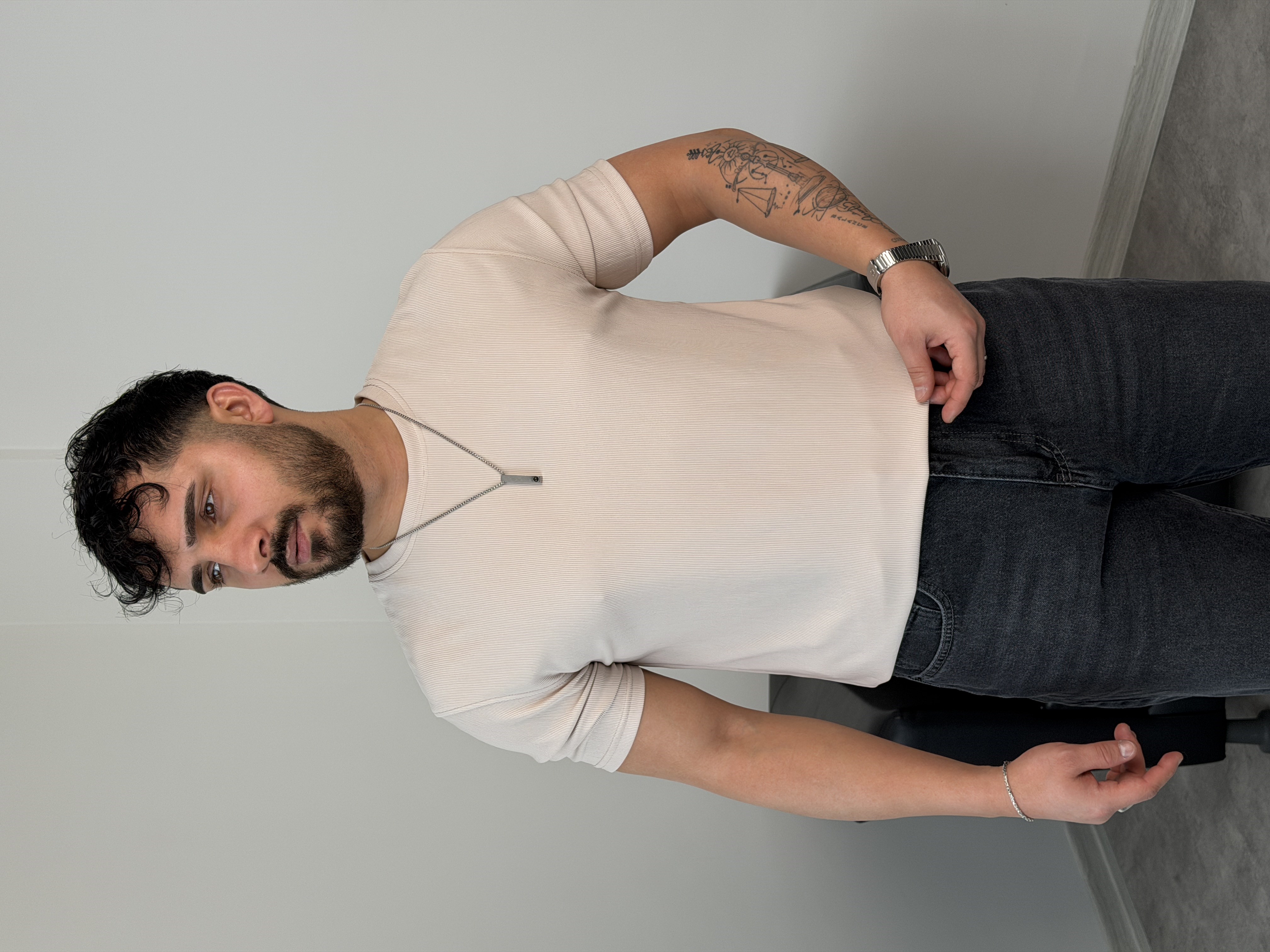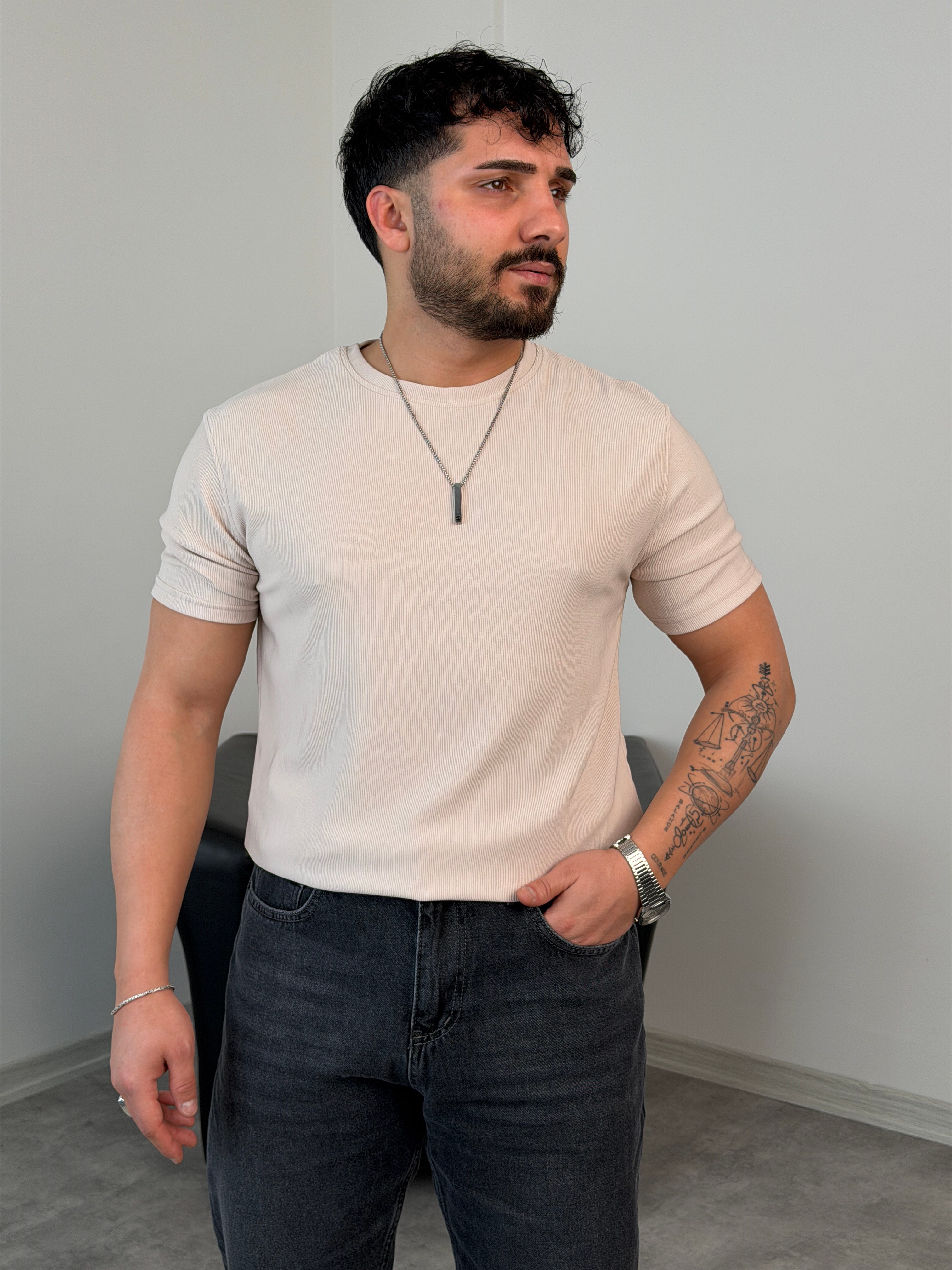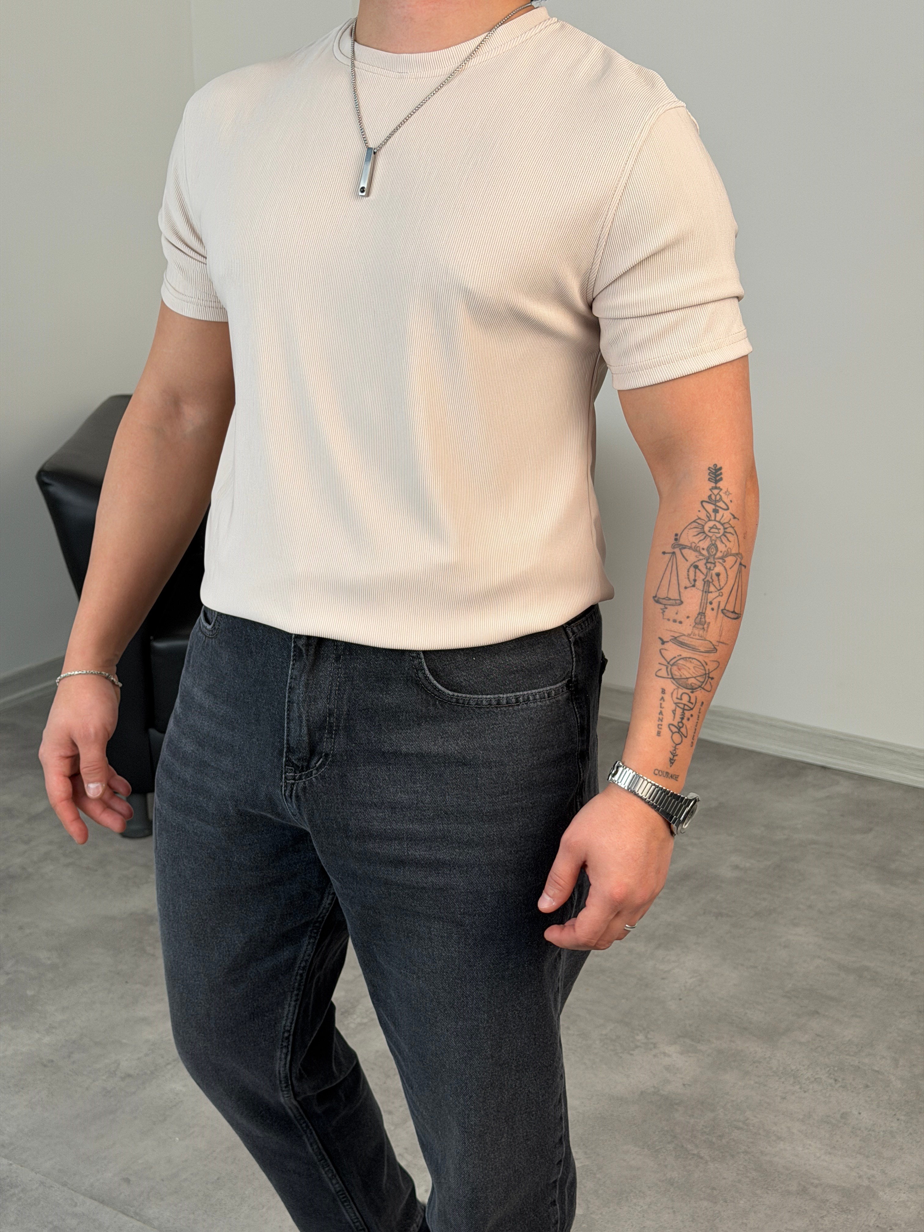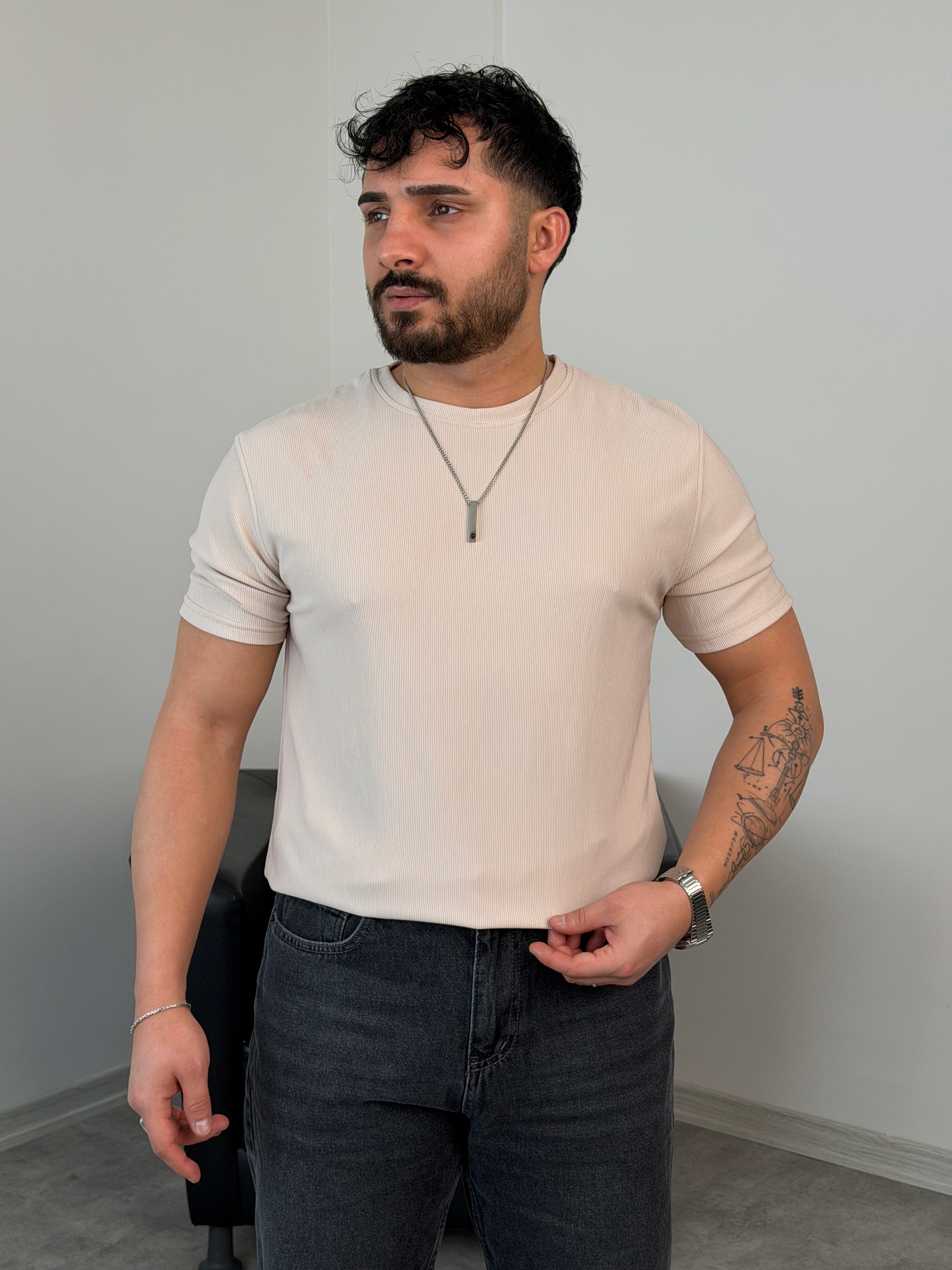 YIRTMAÇ DETAY BASİC TİŞÖRT BEJ